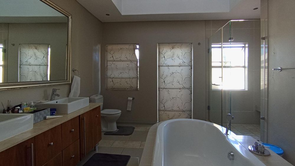 Across the living area is a spacious dining area with a fireplace leading to the Kitchen. This gourmet designed kitchen features ample storage space, high-end finishes, SMEG gas stove and a thoughtful layout for your cooking preps, and a separate scullery and walk in pantry, space for double door fridge, double sink and under counter appliance space. The kitchen opens up through large glass doors onto a spacious patio leading to a heated swimming pool. The outdoor is an entertainers dream with the patio including a bar and braai area, a fire pit and huge garden beautifully manicured with big open spaces.