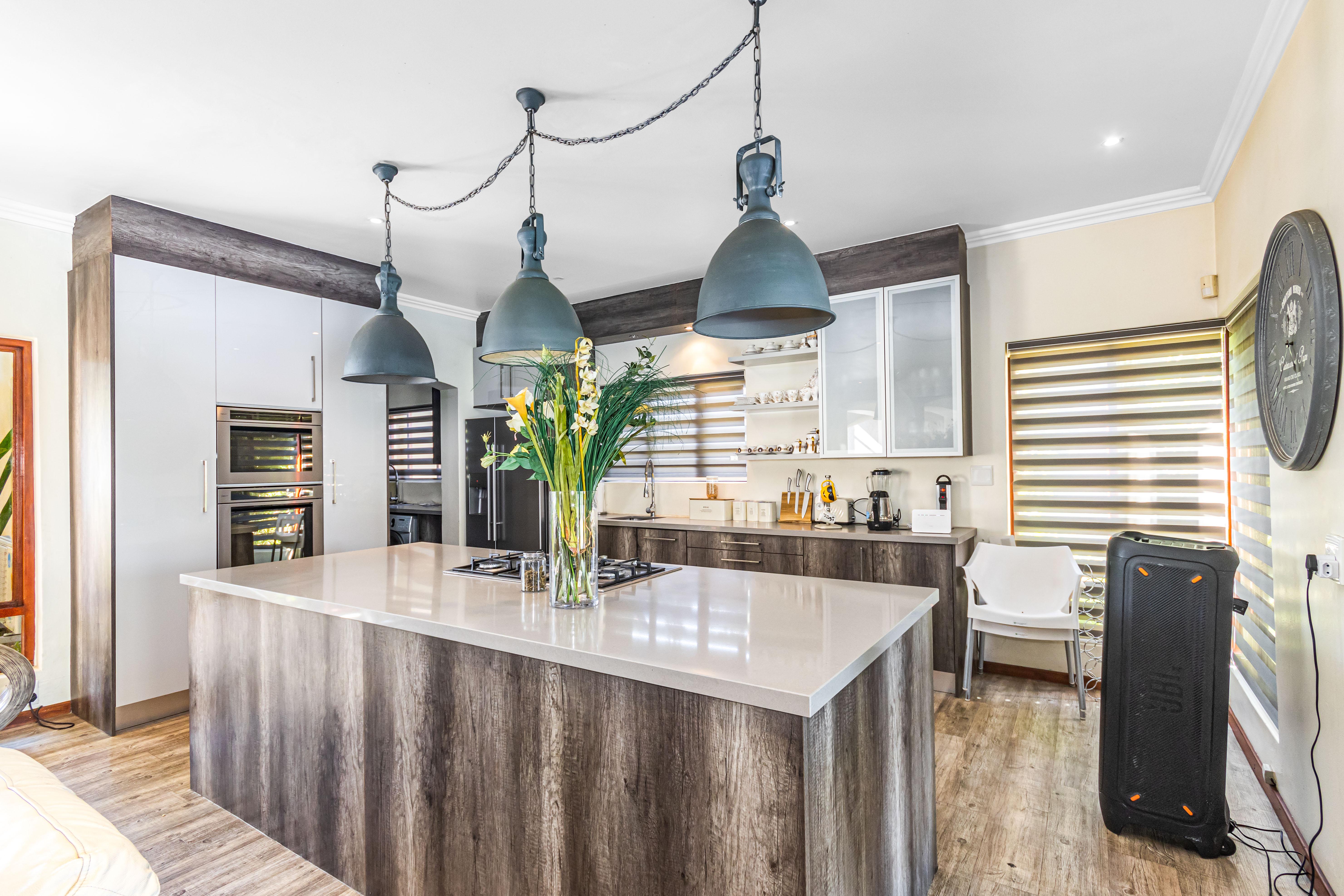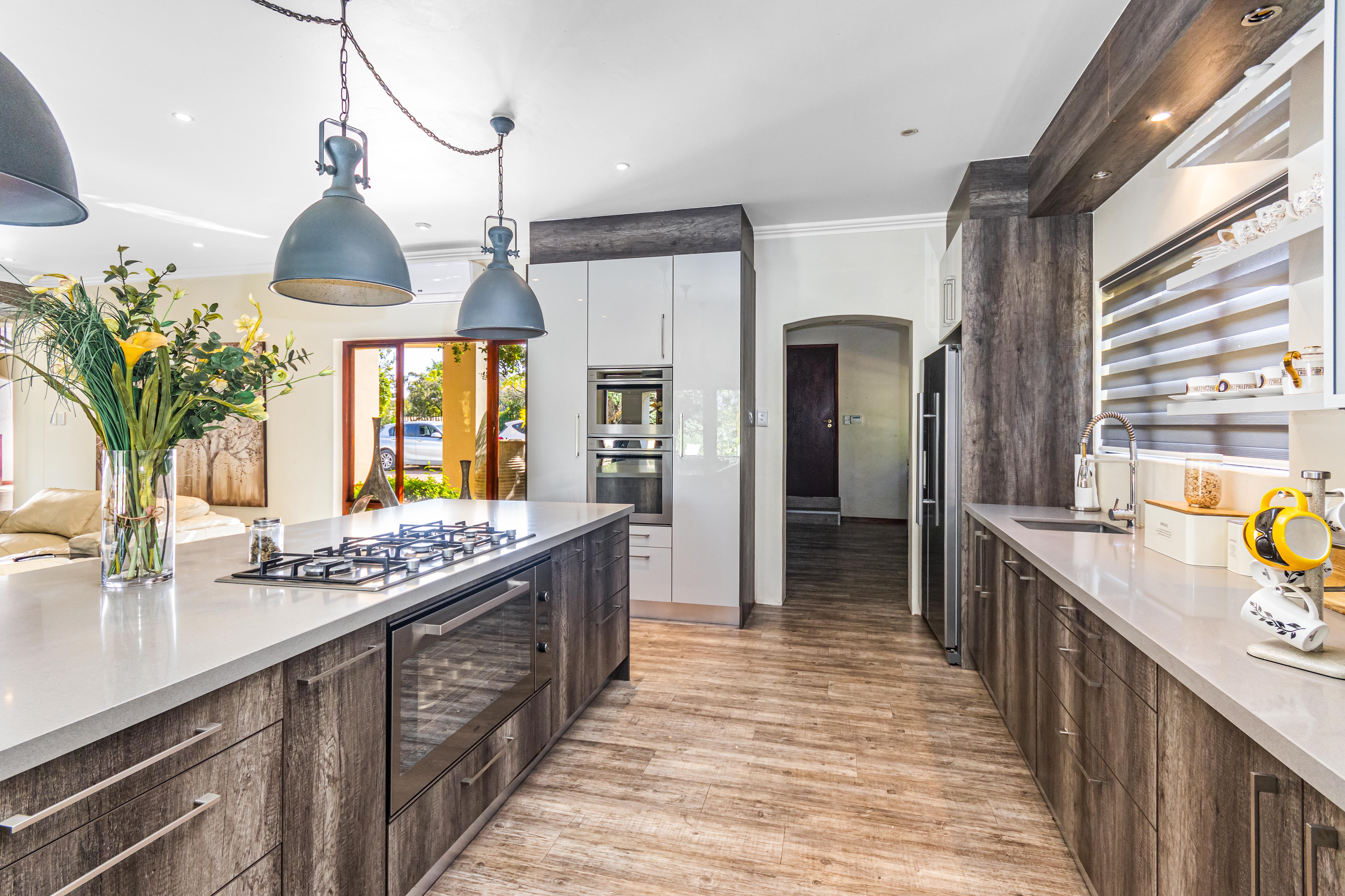 The kitchen is open plan with the lounge and features a gas stove top with 5 burners and a scullery with space for 3 undercounter appliances. The garage is accessible through the scullery.