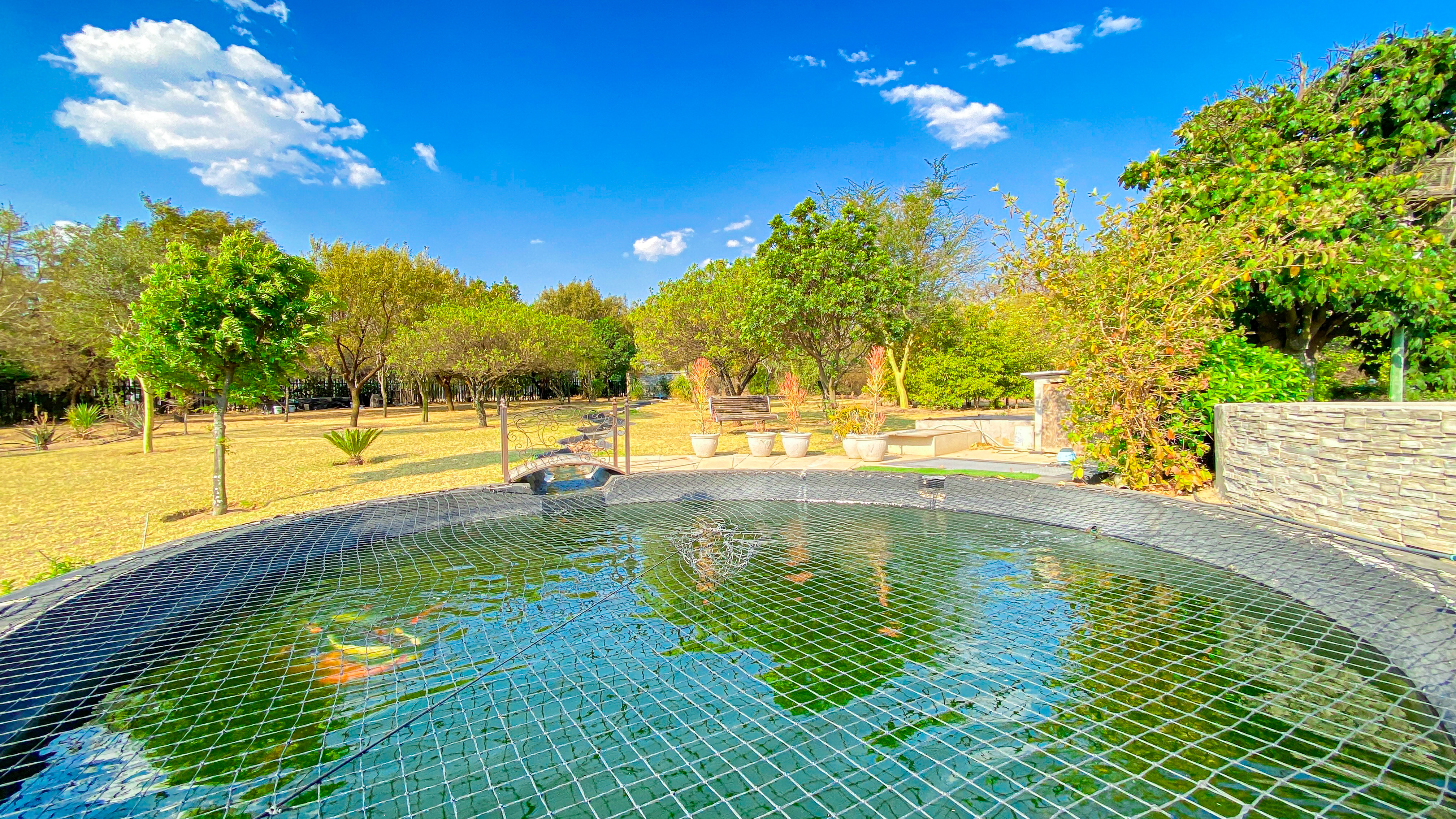 Sustainable Water Management: With a borehole and two weeks' worth of water storage capacity, you'll have an abundant supply of fresh water. What makes it exceptional is the advanced UV and carbon cleaning system that ensures the water you use is always pure, clean, and safe. The property also includes two koi ponds, adding a touch of serenity to your surroundings.