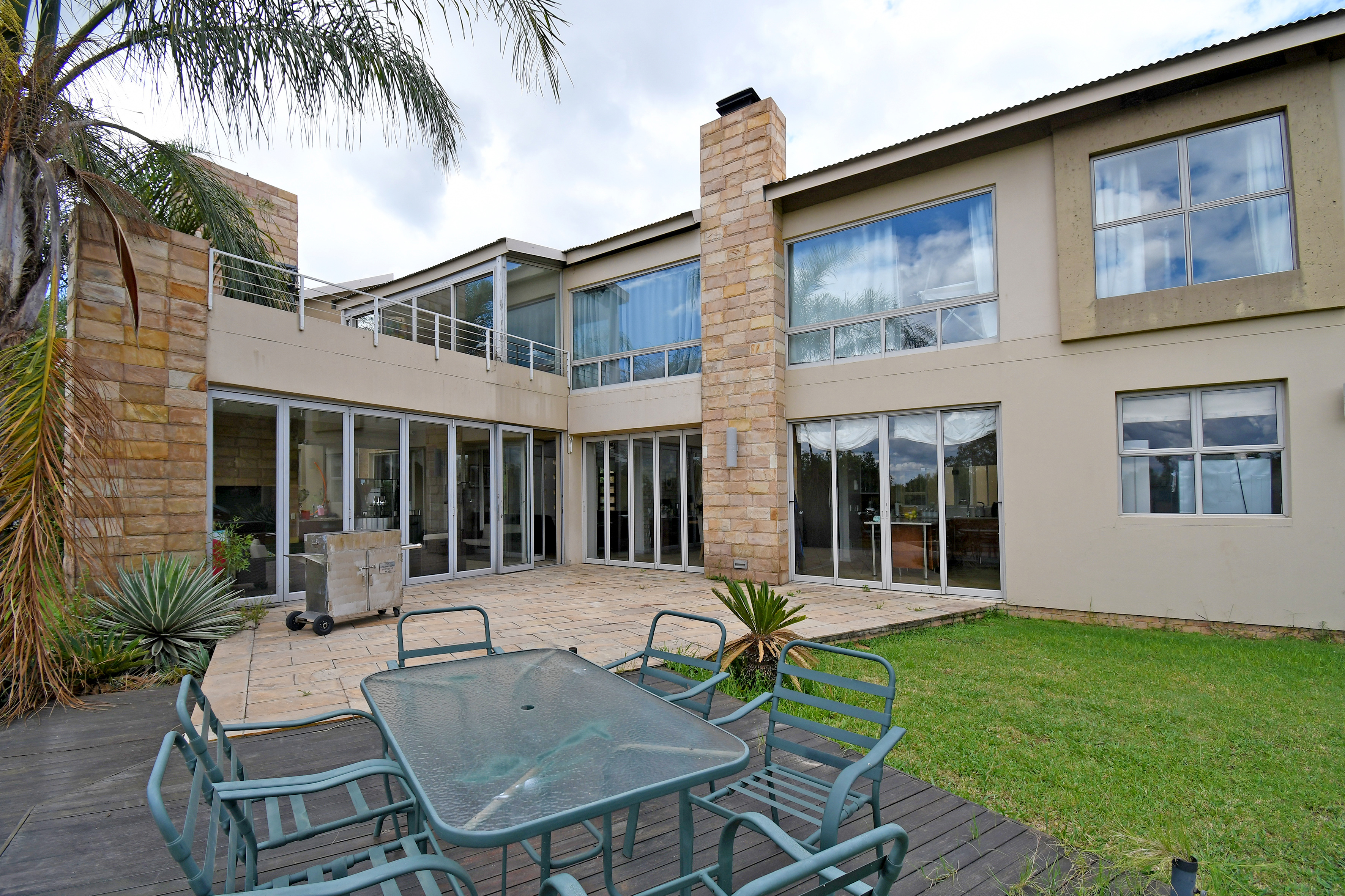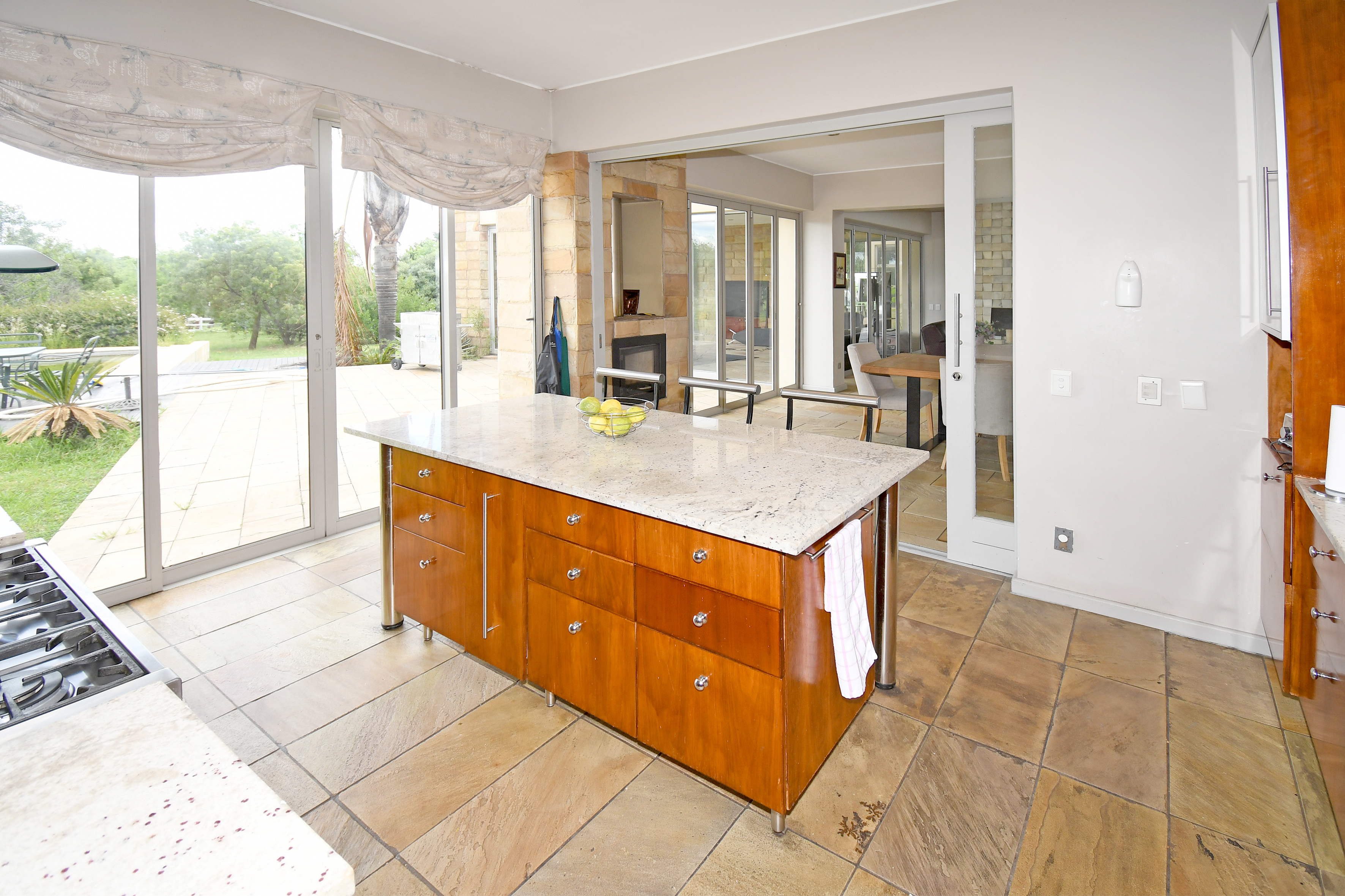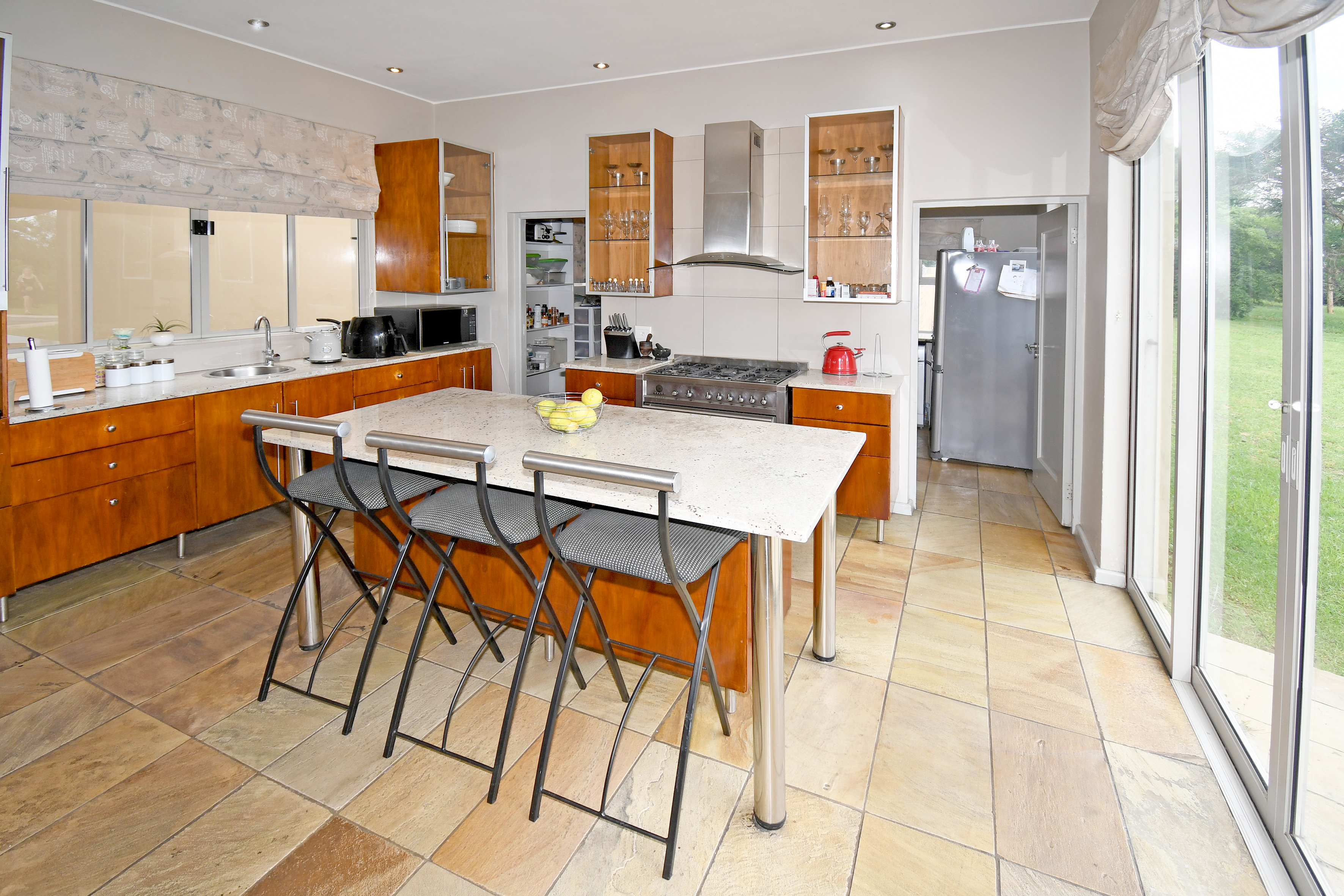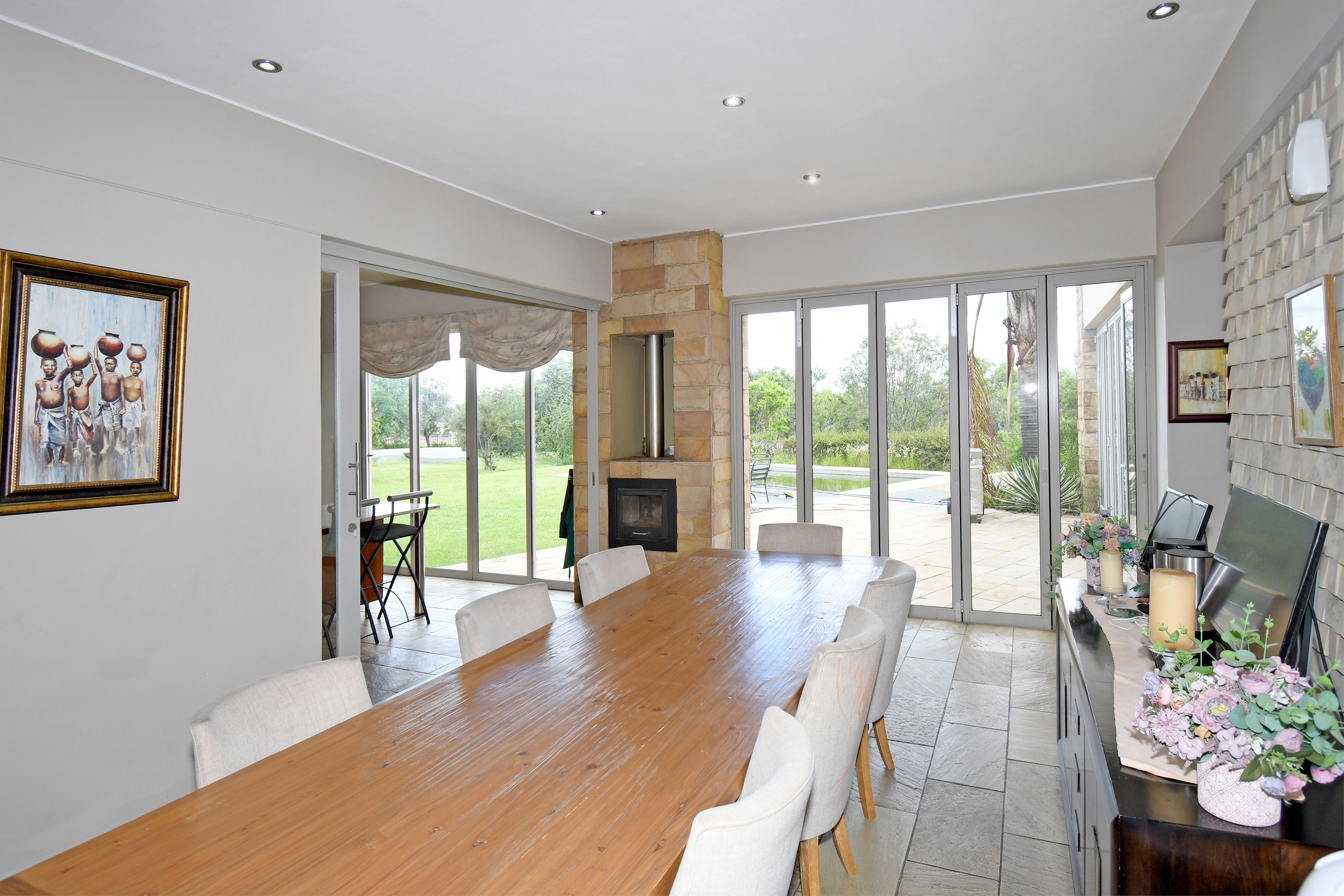 From the moment you step inside, you are welcomed by grand open-plan living areas, bathed in natural light. A sleek, gourmet kitchen flows effortlessly into the dining and lounge areas, all opening onto a sprawling enclosed patio with a built in braai and prep bowl, overlooking the gardens and pool. Kitchen boasts a centre island, gas hob, stacker doors to the pool, walk in pantry and large separate scullery.