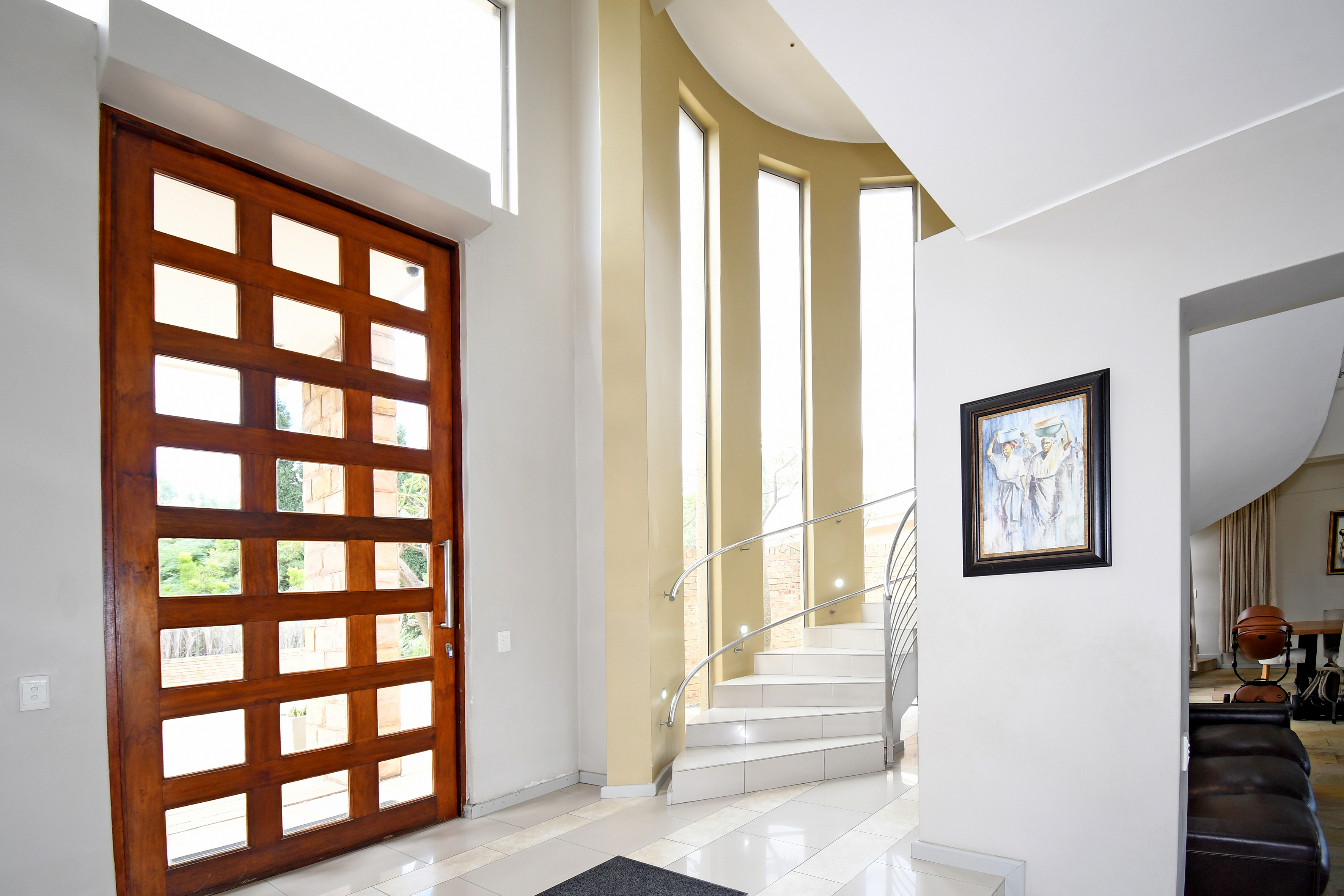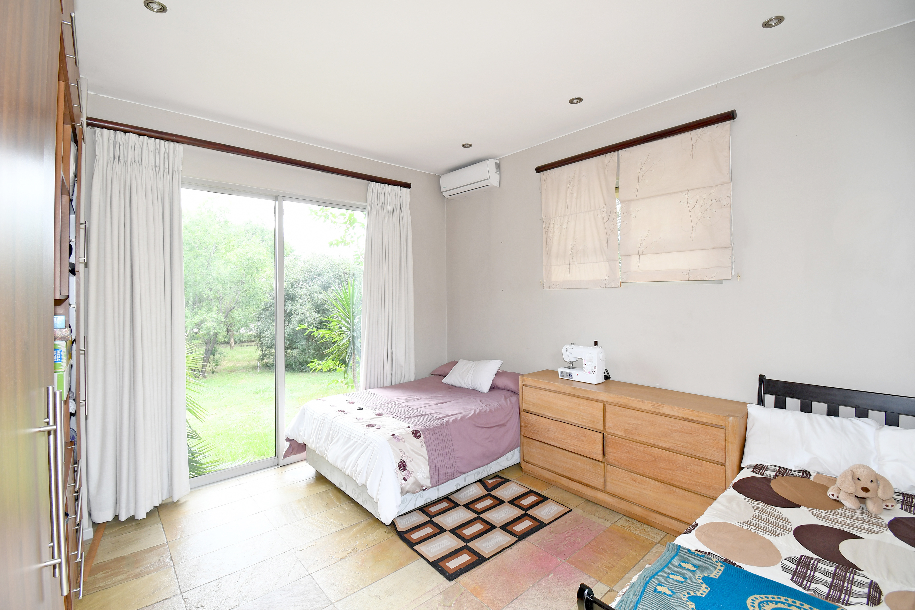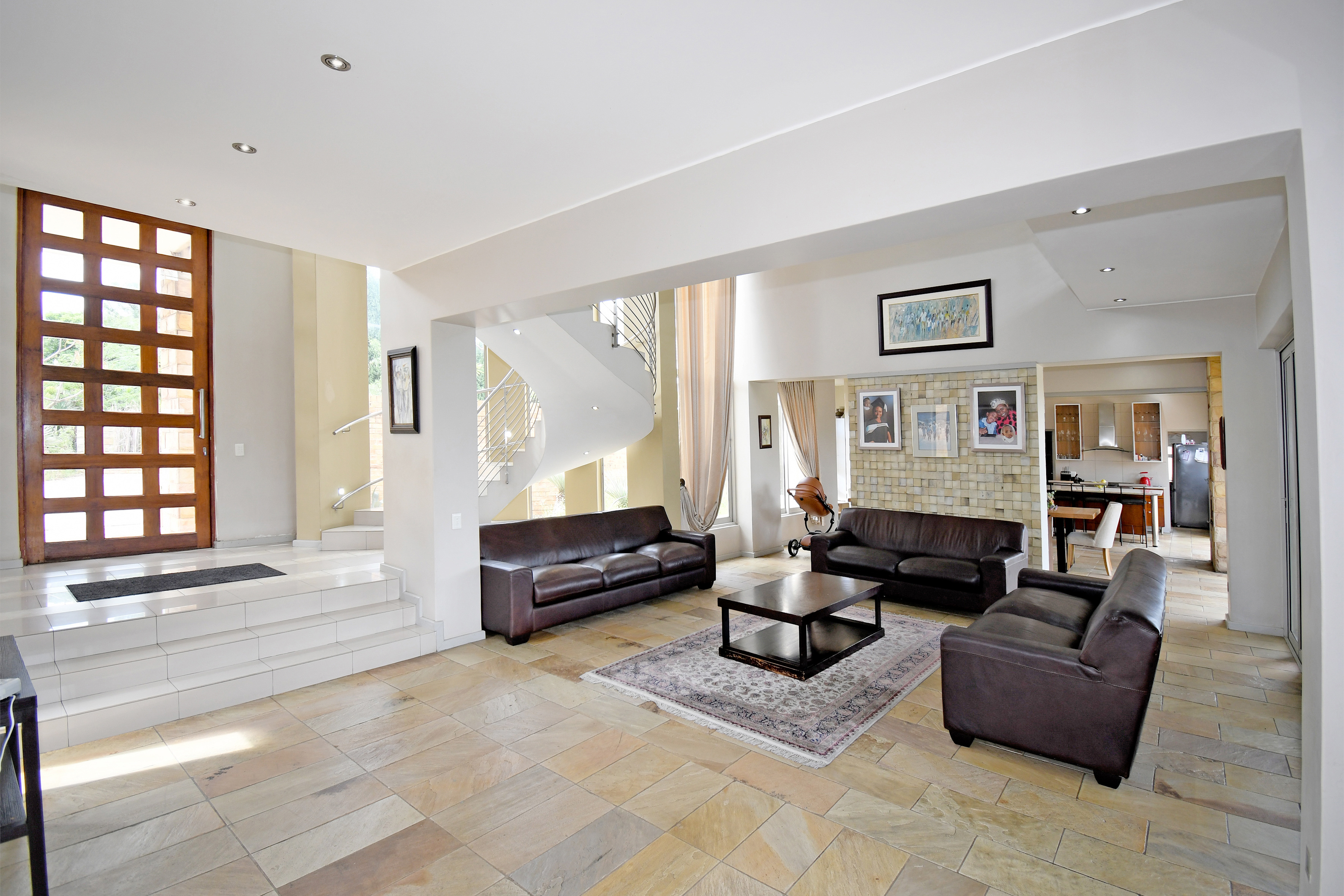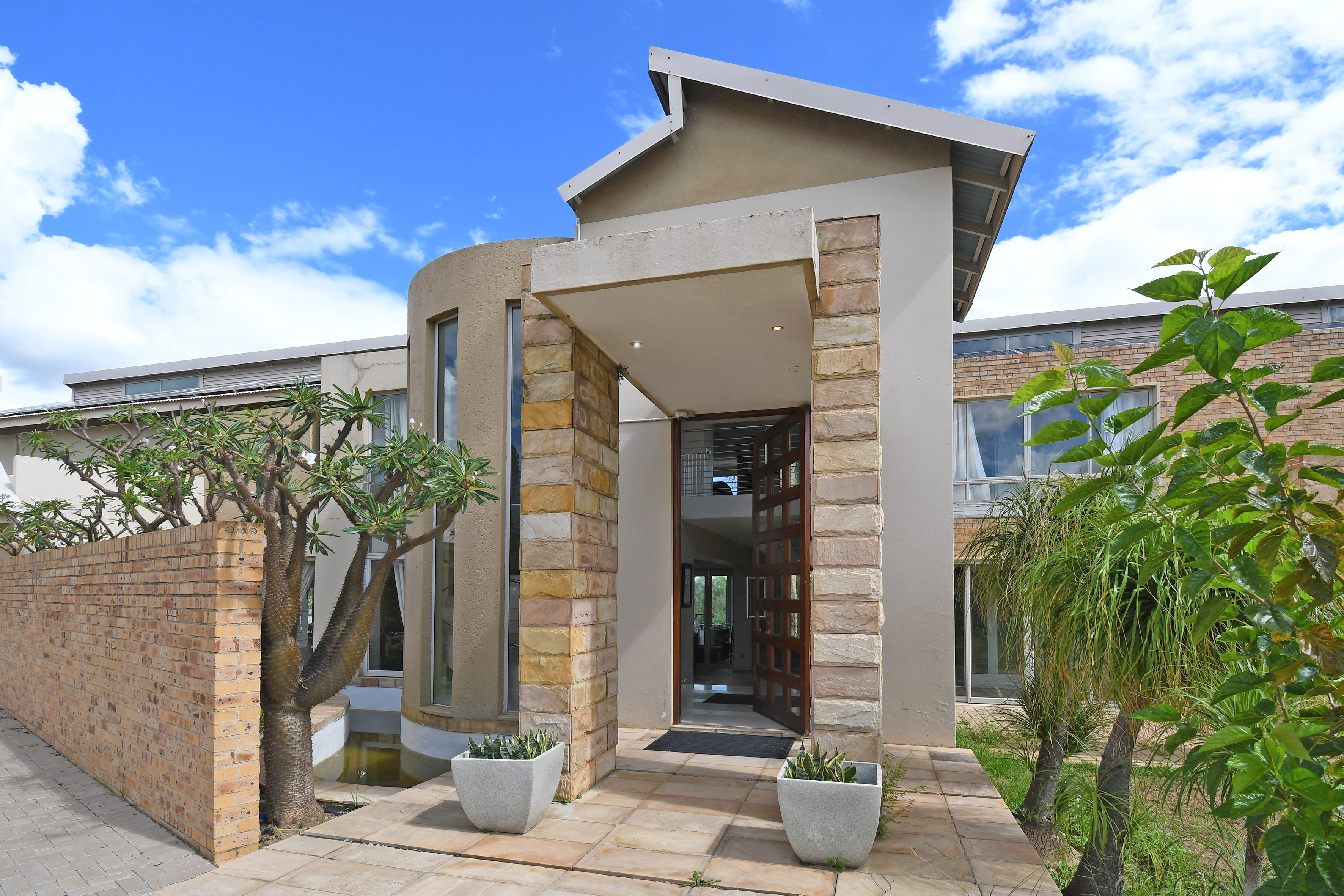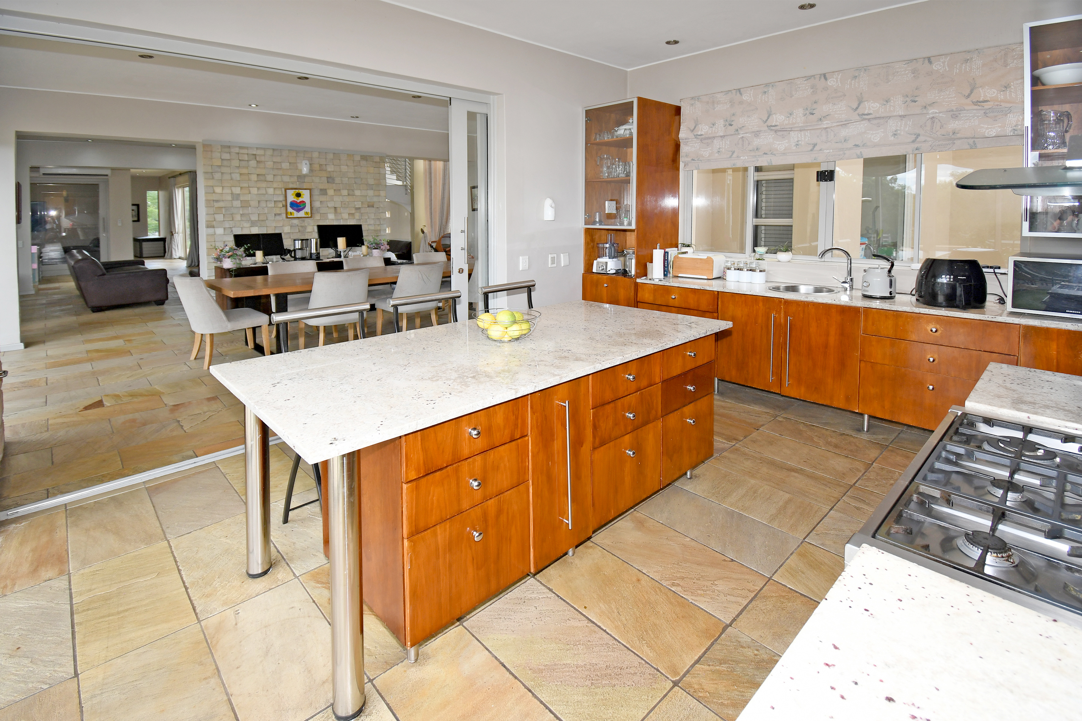 From the moment you step inside, you are welcomed by grand open-plan living areas, bathed in natural light. A sleek, gourmet kitchen flows effortlessly into the dining and lounge areas, all opening onto a sprawling enclosed patio with a built in braai and prep bowl, overlooking the gardens and pool. Kitchen boasts a centre island, gas hob, stacker doors to the pool, walk in pantry and large separate scullery.