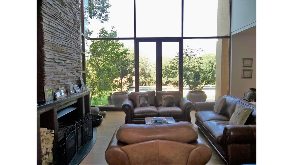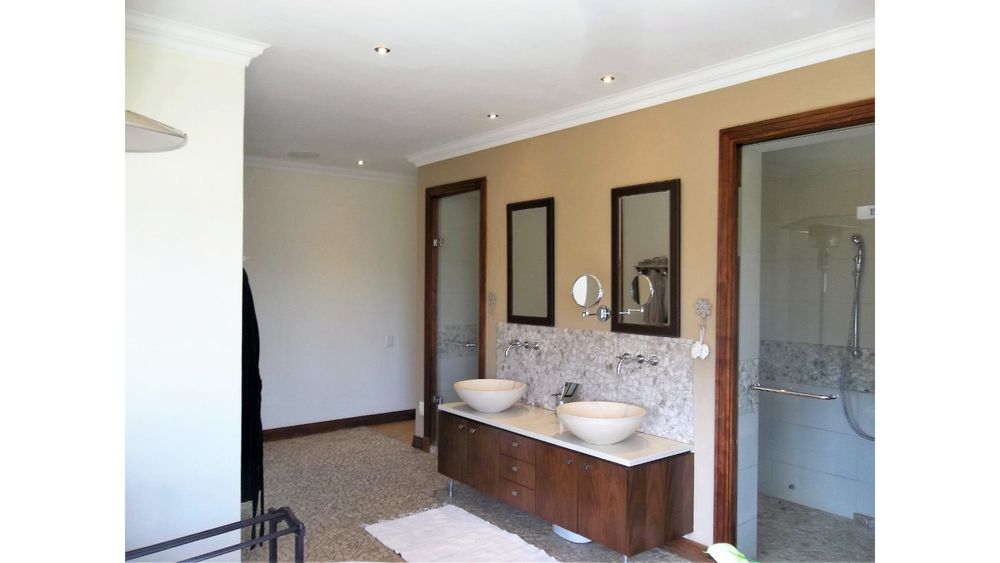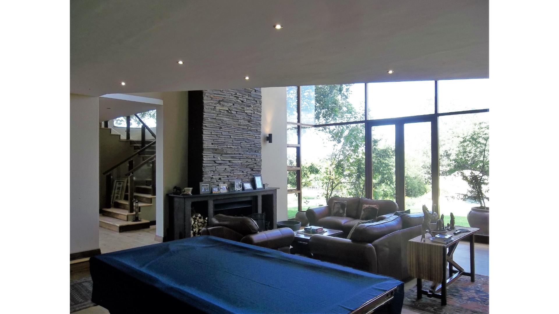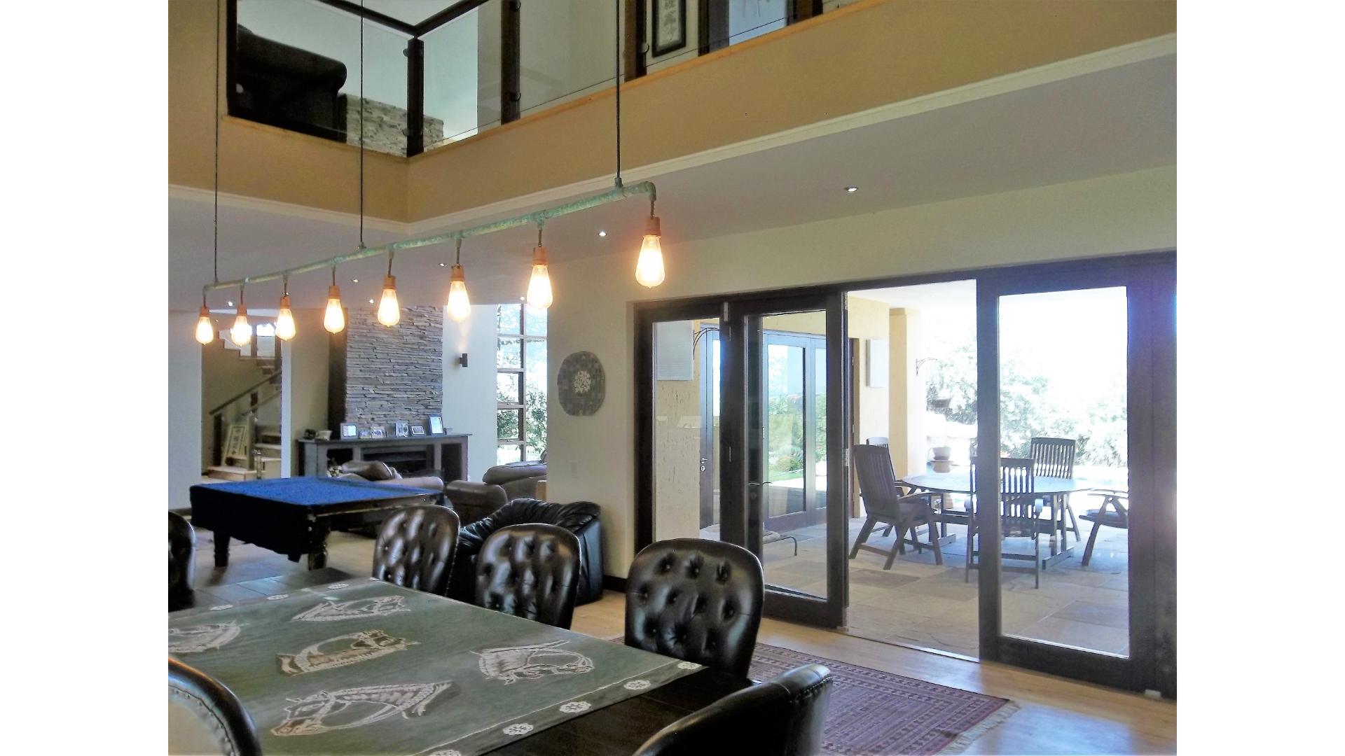 A double volume entrance hall greets you on entry, leading you into the open plan kitchen/lounge/dining area. The formal lounge features a huge wood-burning fireplace and glass doors opening out on to the enclosed entertainment area. The dining area features a pellet-burning fireplace and a large family/TV room with a fireplace also all have glass doors that open out onto the entertainment area, which overlooks the sparkling pool and affords you magnificent views to be enjoyed all year round. A separate study is a perfect room for a work-from-home office or as a kids playroom.