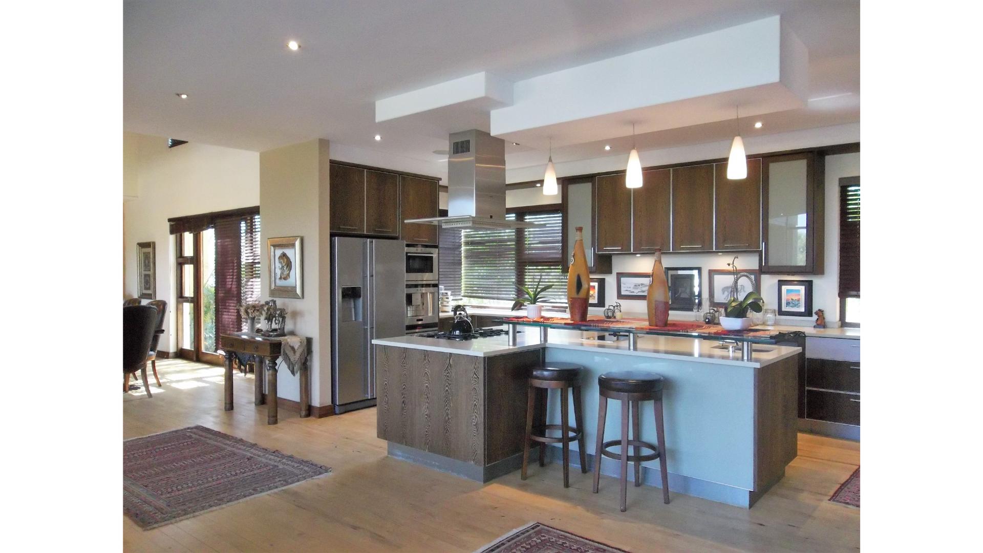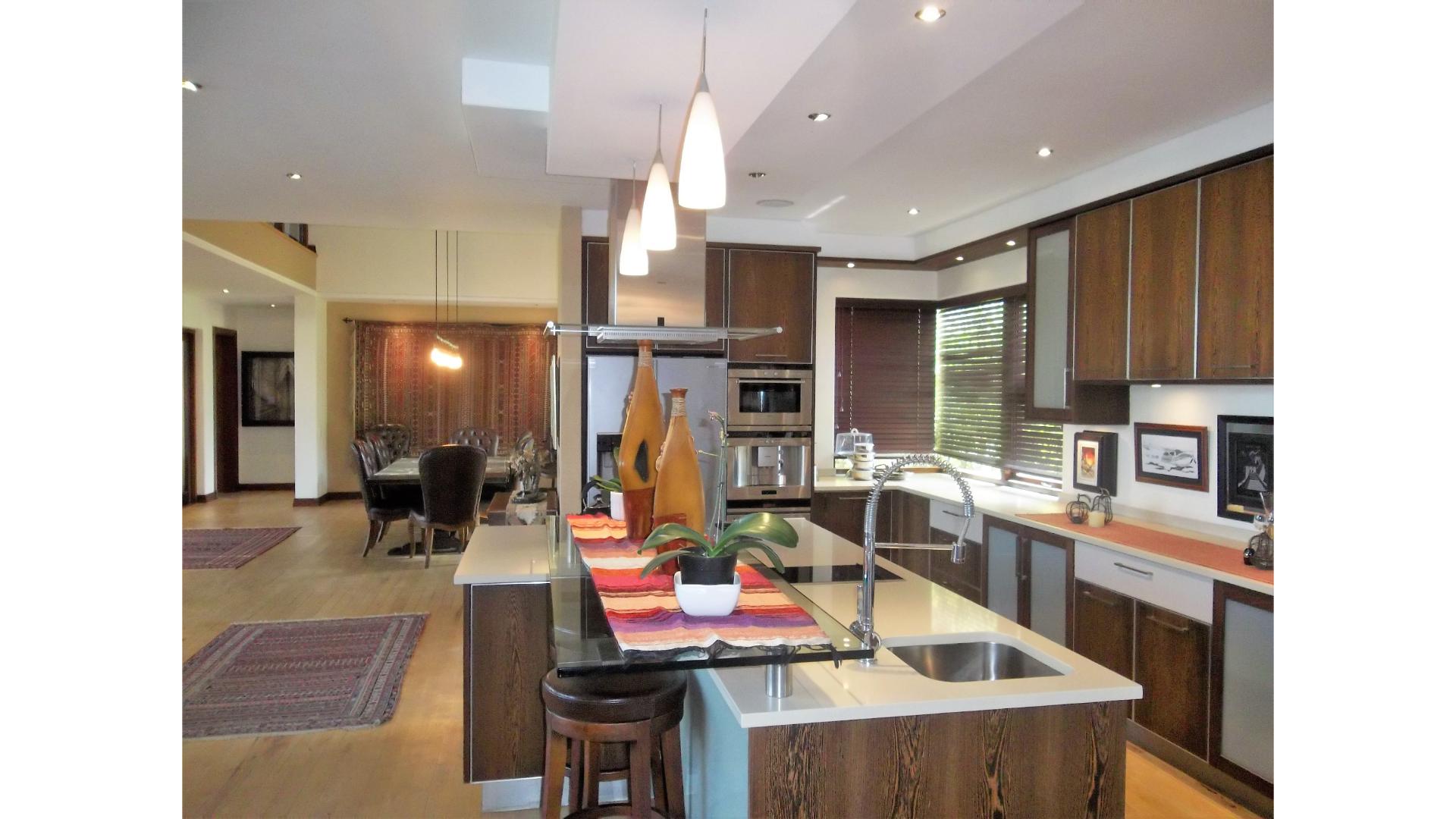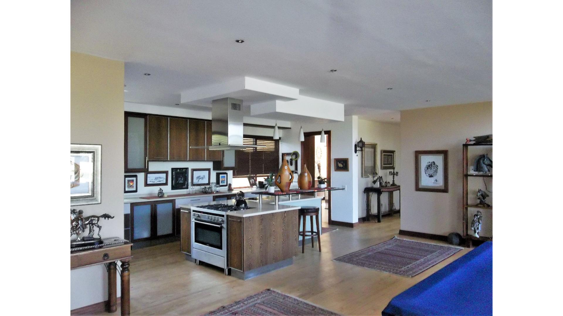 The stunning open plan kitchen has a gas stovetop, built-in coffee machine, a scullery that combines as a second kitchen and has space for 2 under counter appliances as well as an extra fridge. Access to the garage is through the scullery and from the garage you will find a guest suite/cottage with a lounge, kitchenette, bedroom and bathroom.