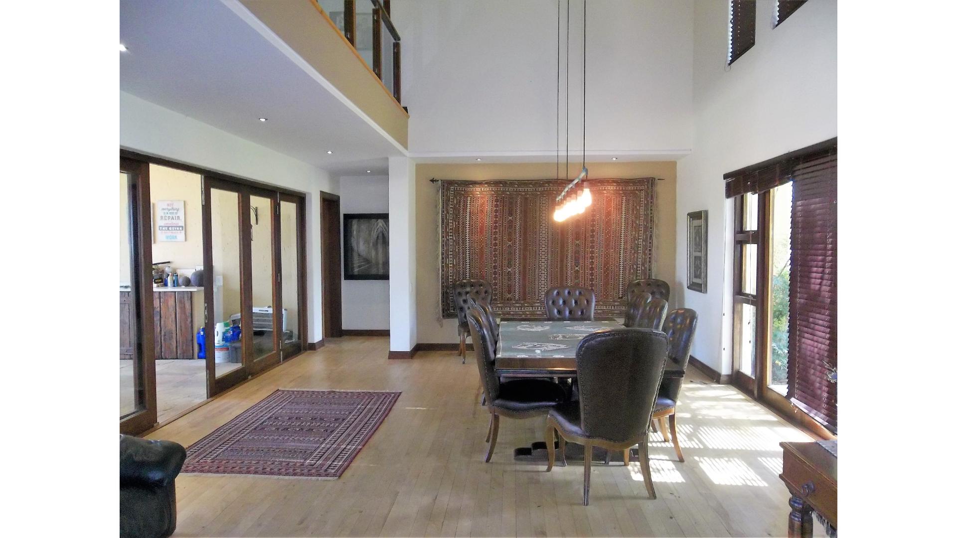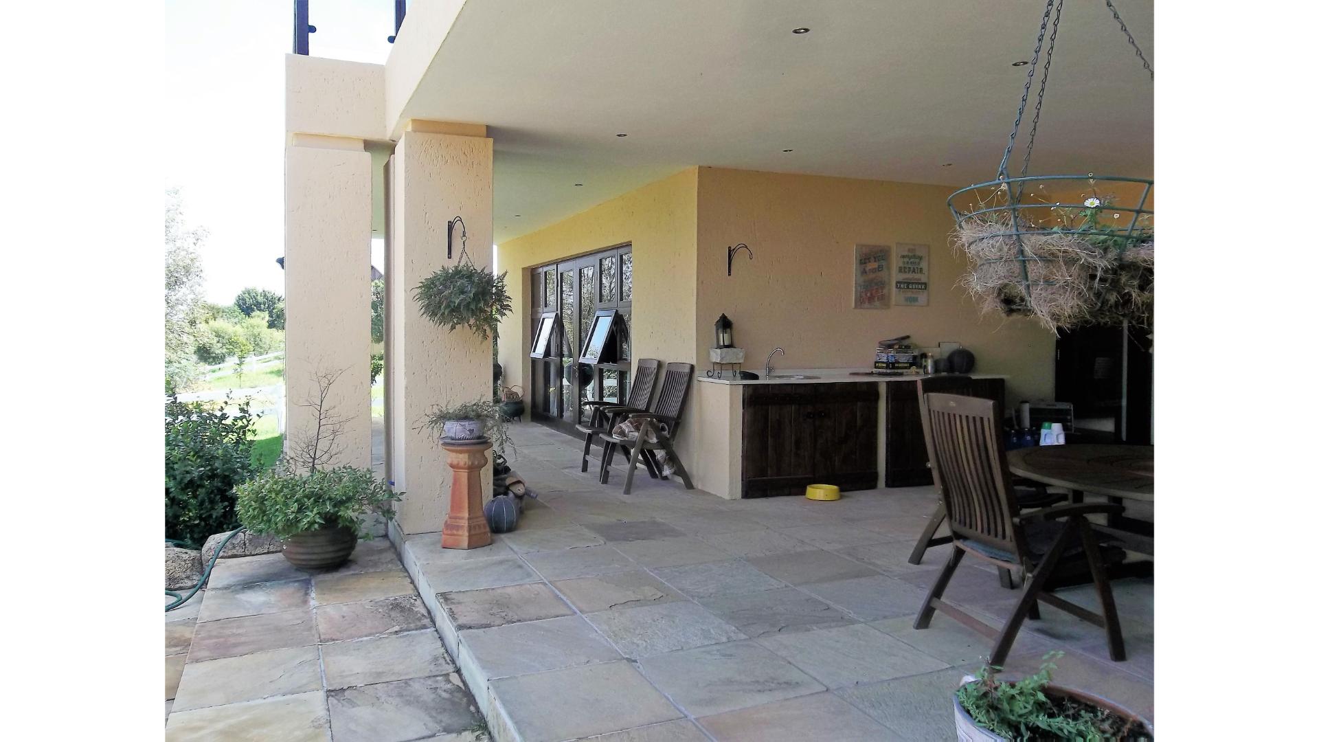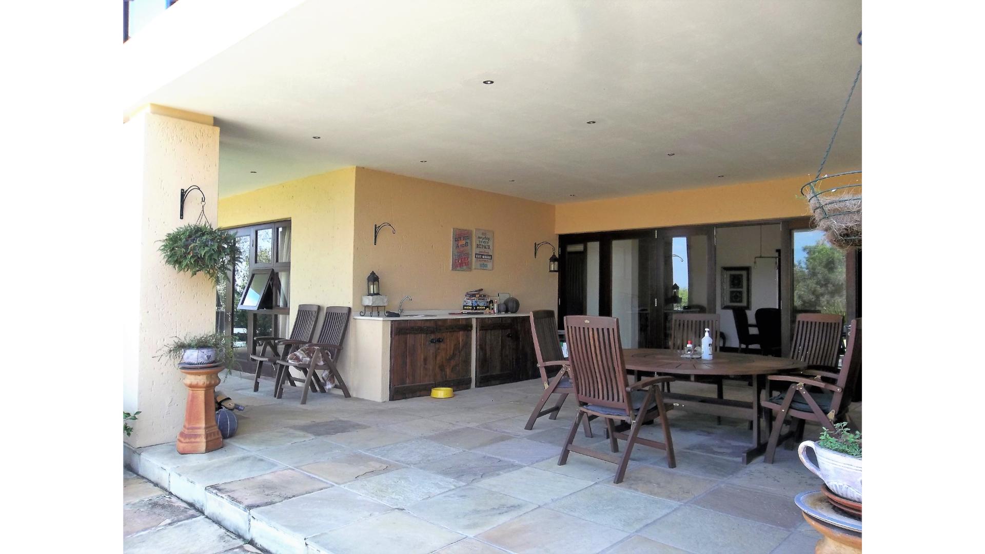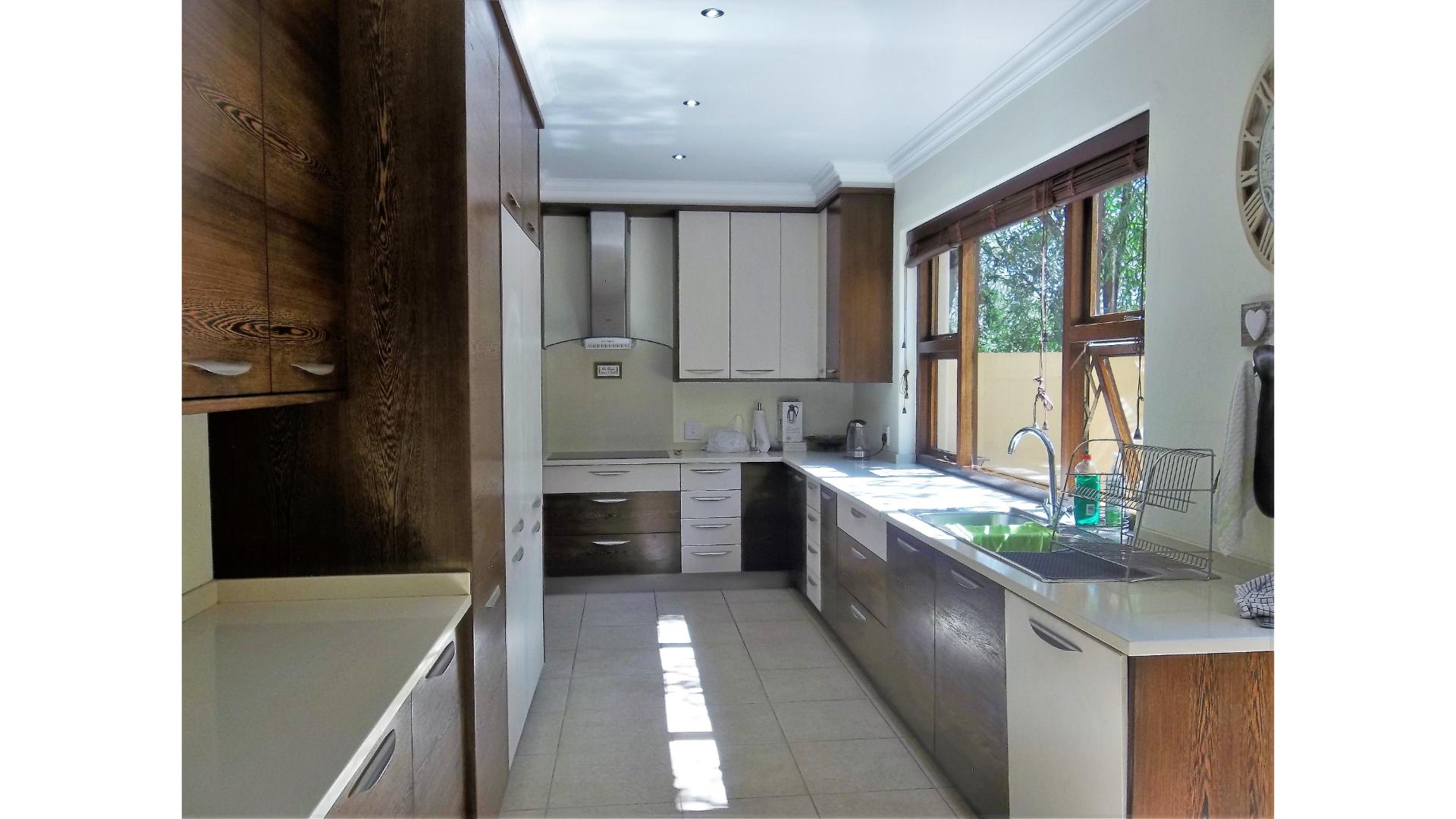 The stunning open plan kitchen has a gas stovetop, built-in coffee machine, a scullery that combines as a second kitchen and has space for 2 under counter appliances as well as an extra fridge. Access to the garage is through the scullery and from the garage you will find a guest suite/cottage with a lounge, kitchenette, bedroom and bathroom.