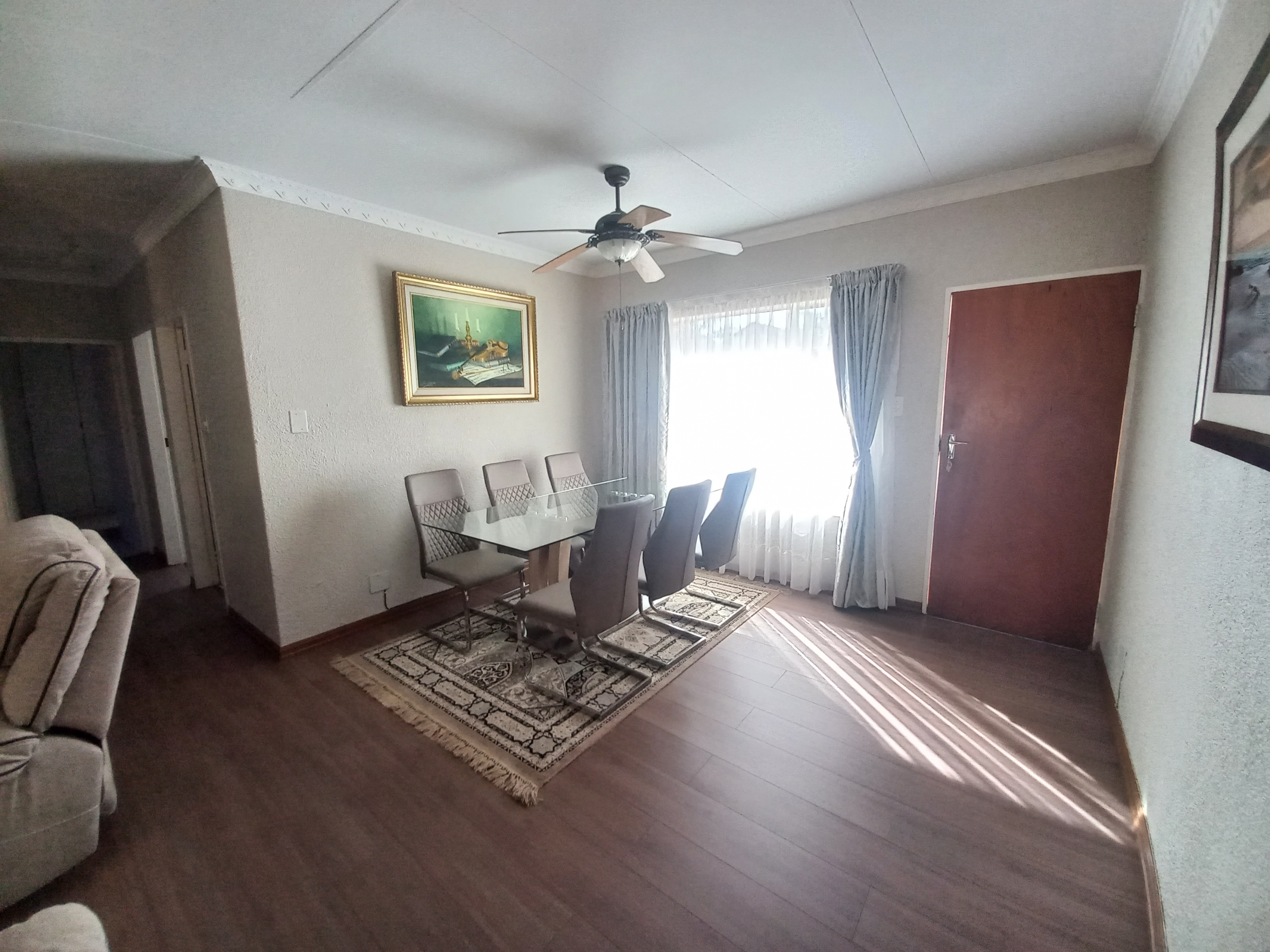 - Open-plan lounge and dining area with elegant laminate flooring
