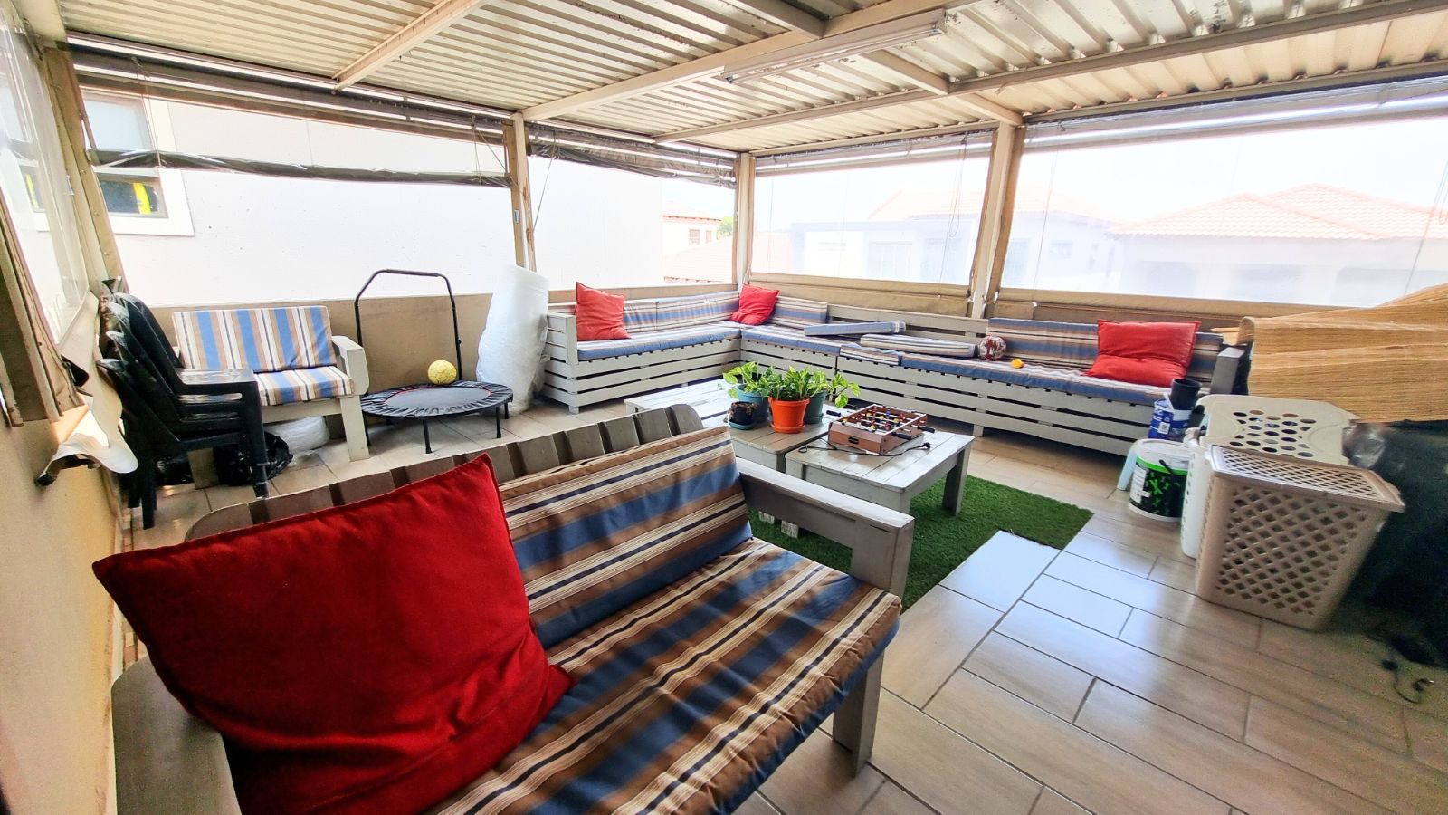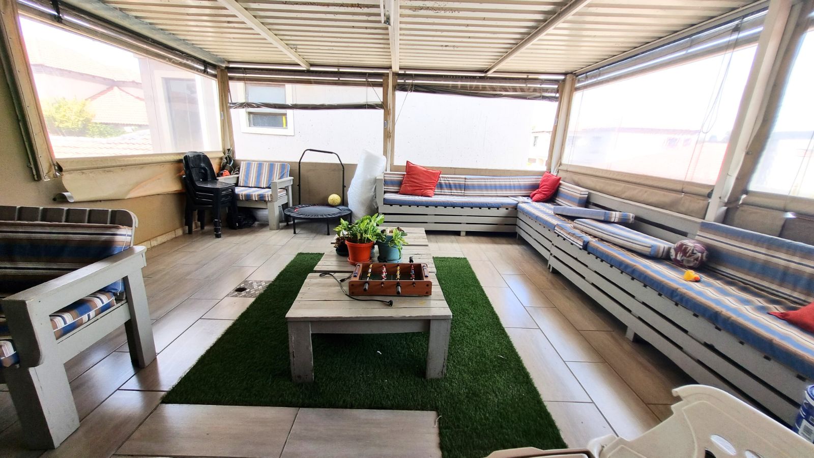 The kitchen boasts high gloss cabinetry, granite countertops, and a striking mosaic-tiled backsplash. It is fully equipped with a built-in glass hob and oven and direct access to the courtyard.