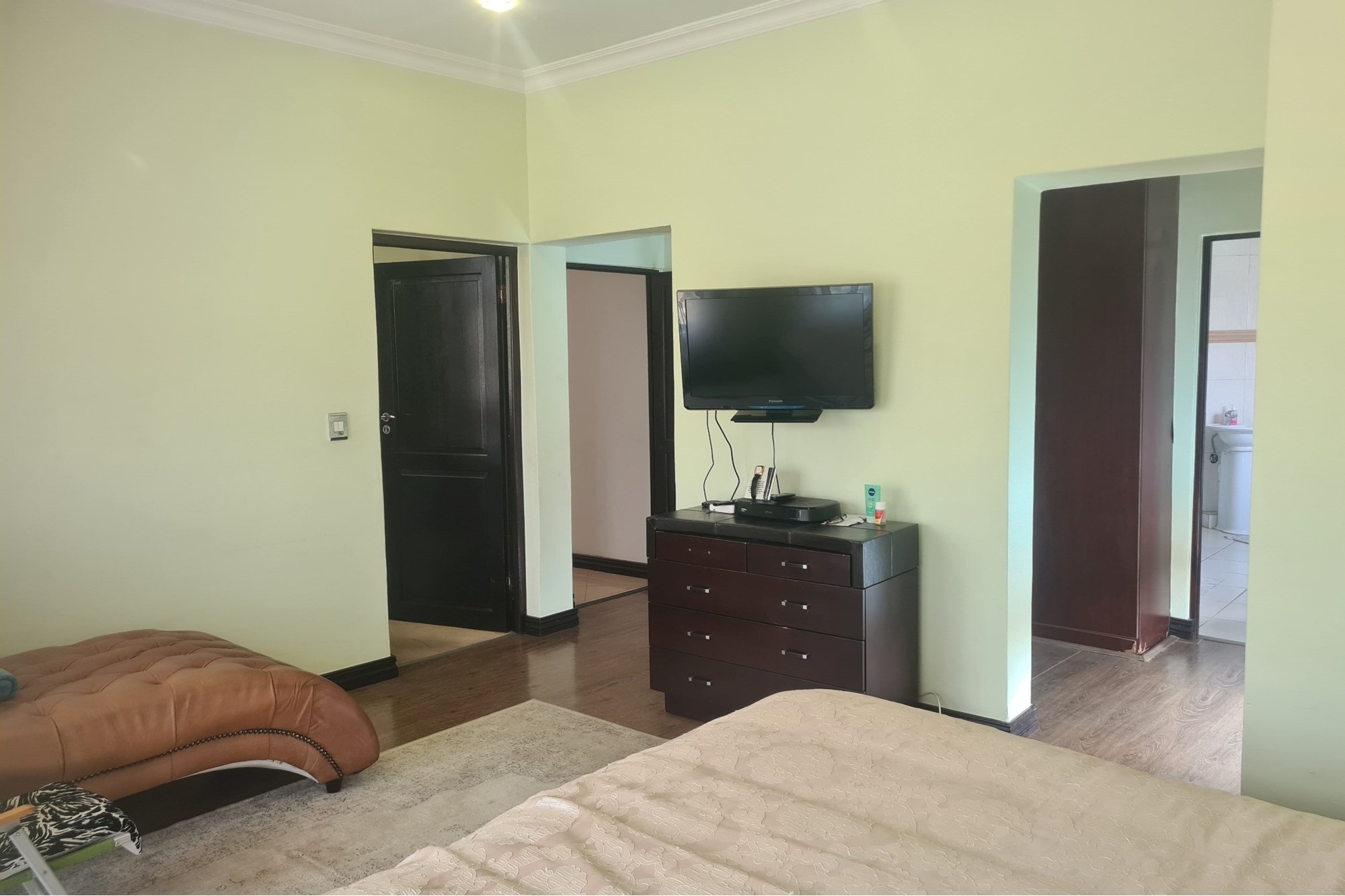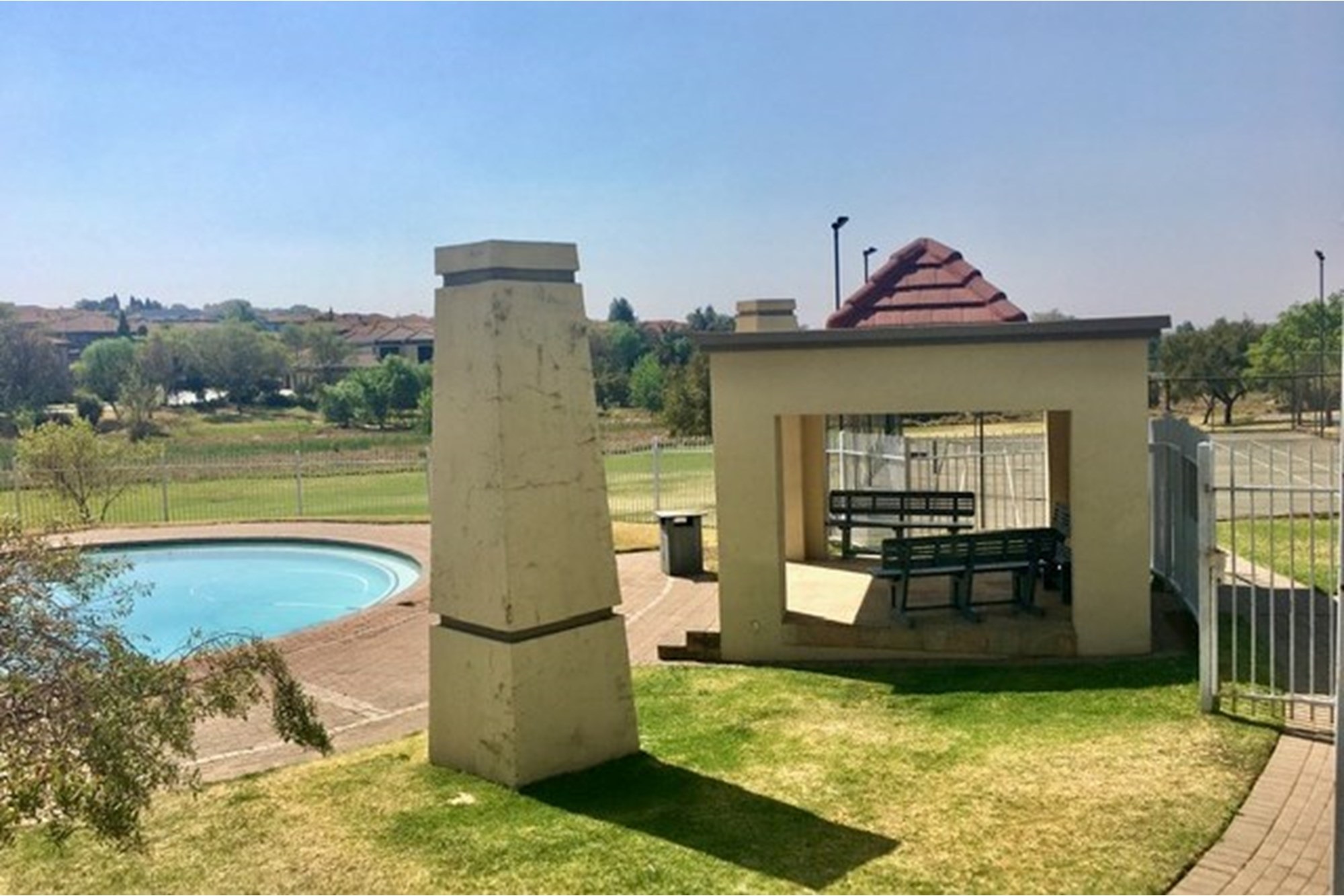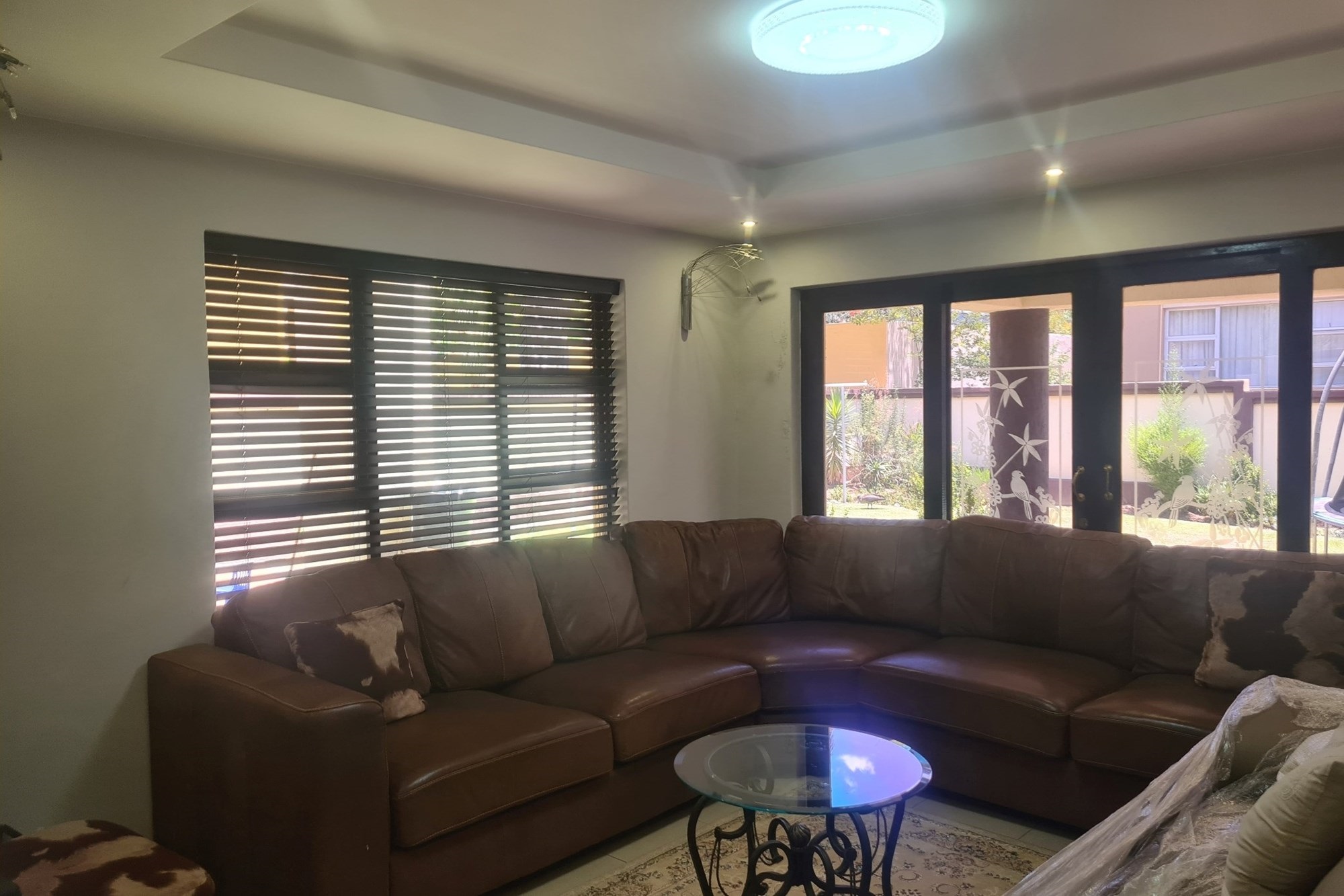 The heart of the home lies in the modern open-plan kitchen, featuring elegant granite countertops, a breakfast nook for casual meals, and a well-appointed scullery for additional storage and convenience. Adjacent to the kitchen, a second lounge leads out through a sliding door to the private patio, providing the perfect space for outdoor entertaining. The patio opens into a dedicated entertainment and braai area, surrounded by a generous garden and rolling lawns, ideal for family functions and activities.