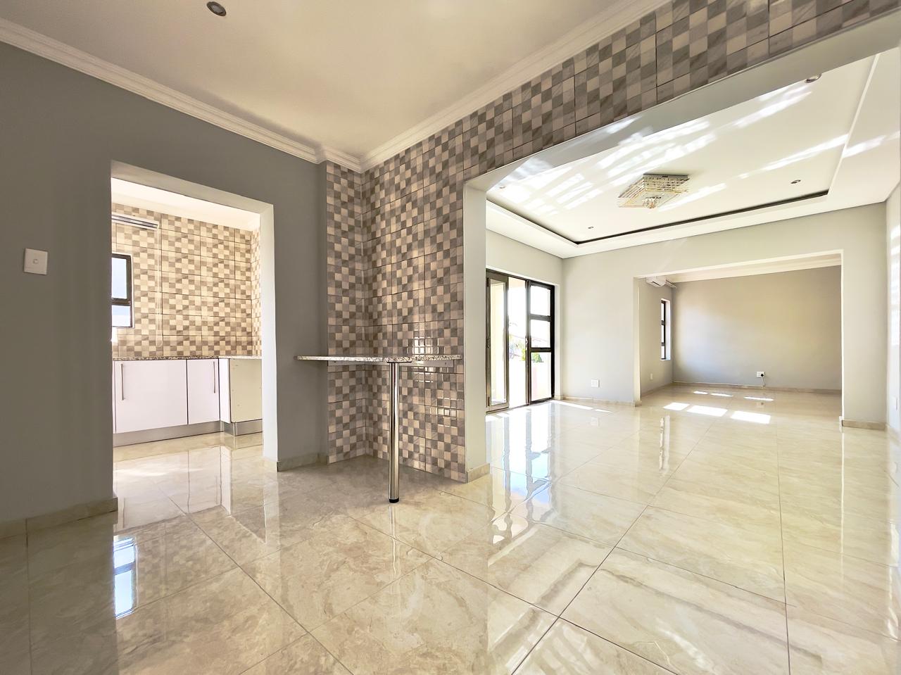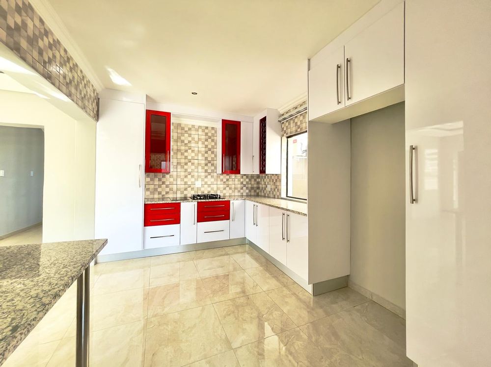 The modern open-plan kitchen is amazing , offering ample cupboard space, Caesarstone countertops, nice island with a waterfall edge and wonderfully-designed breakfast nook, double eye-level ovens, both electric and gas hobs with an extractor fan, a prep basin, and space for a double fridge.