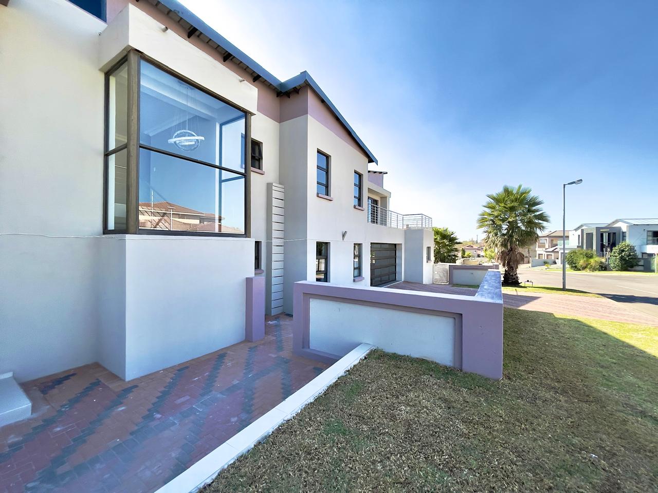 The living areas seamlessly open to a central covered patio with a built-in braai, overlooking a spacious wrap-around garden.