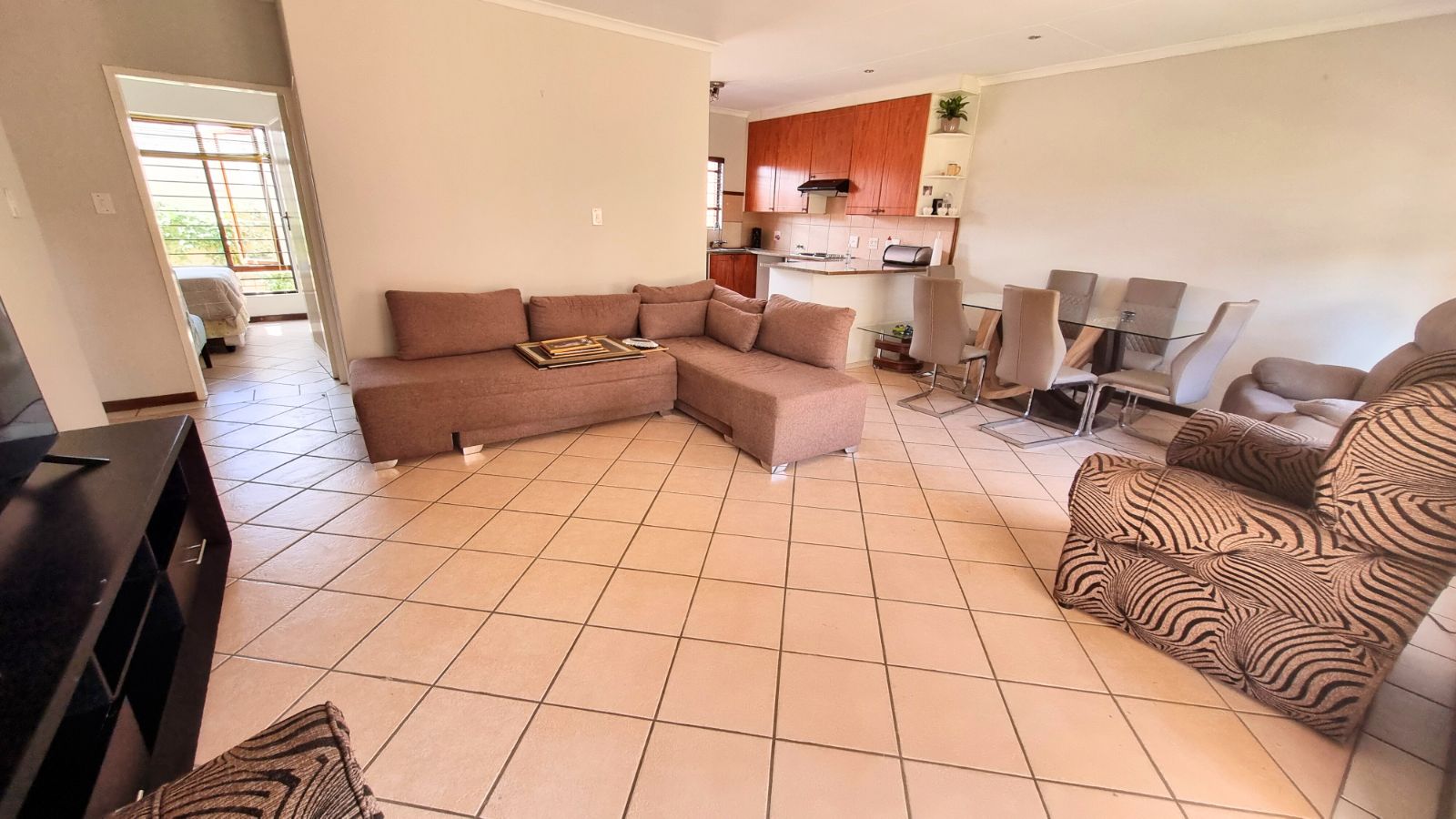 Open-plan contemporary lounge, kitchen and dining area, connects seamlessly. The kitchen has granite countertops and generous storage.
