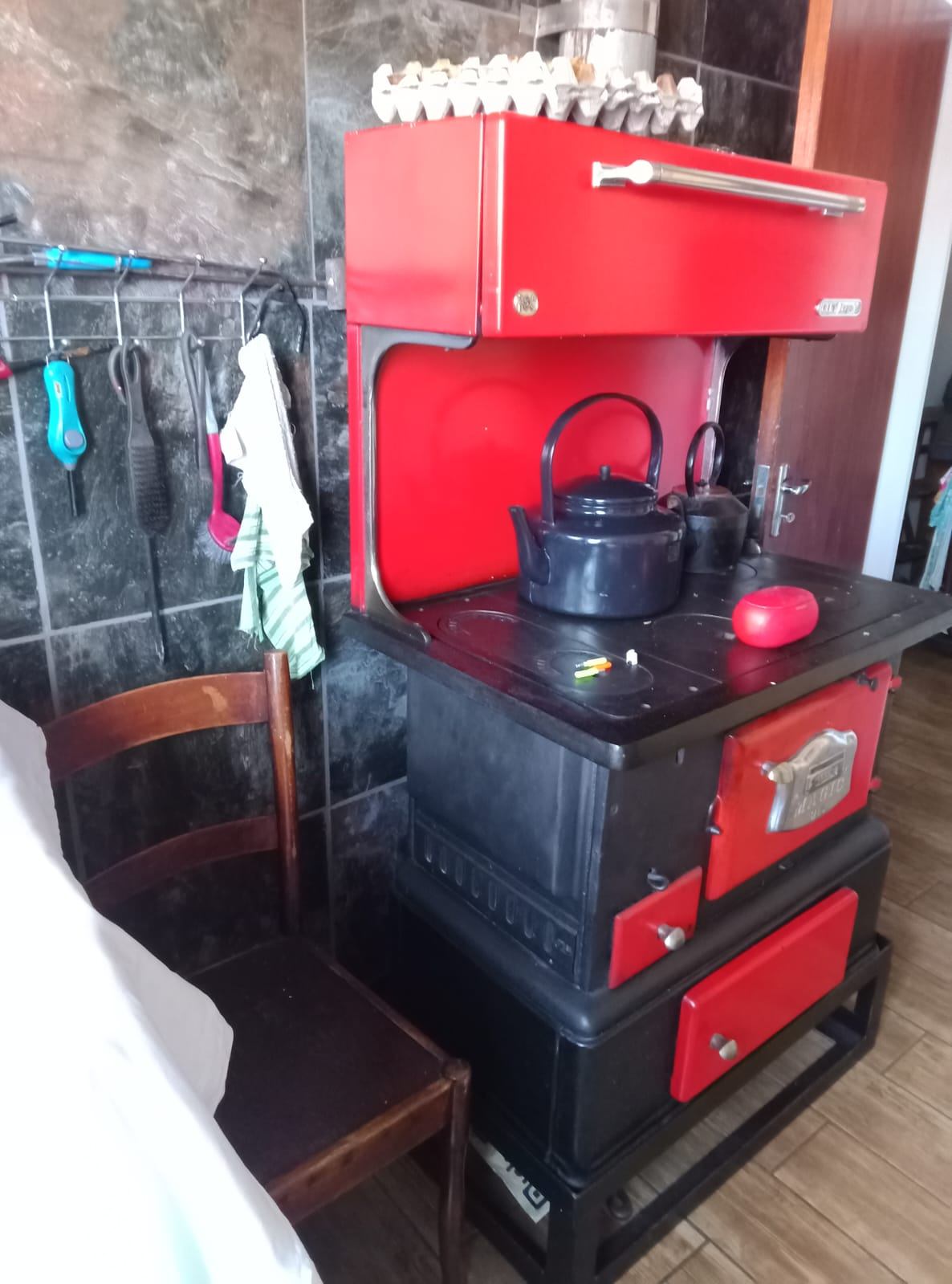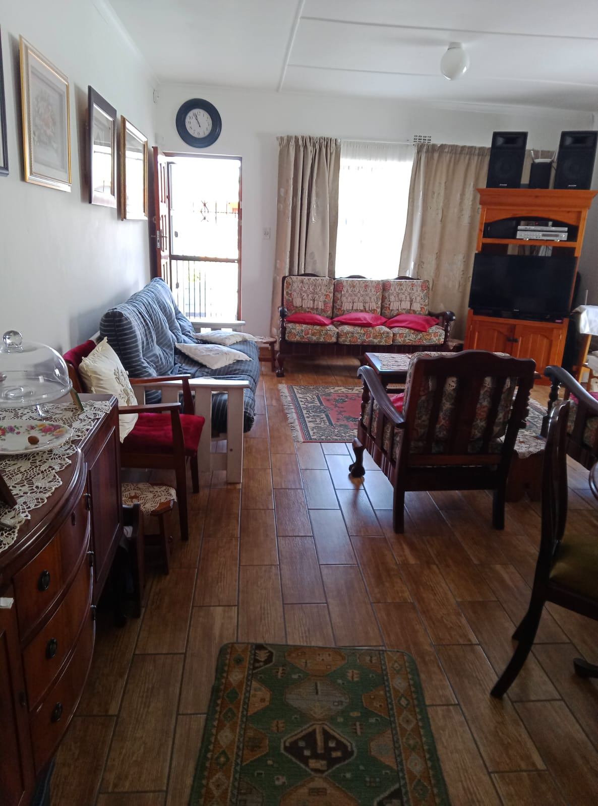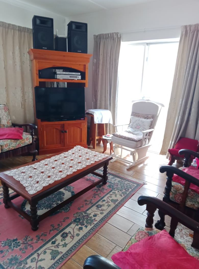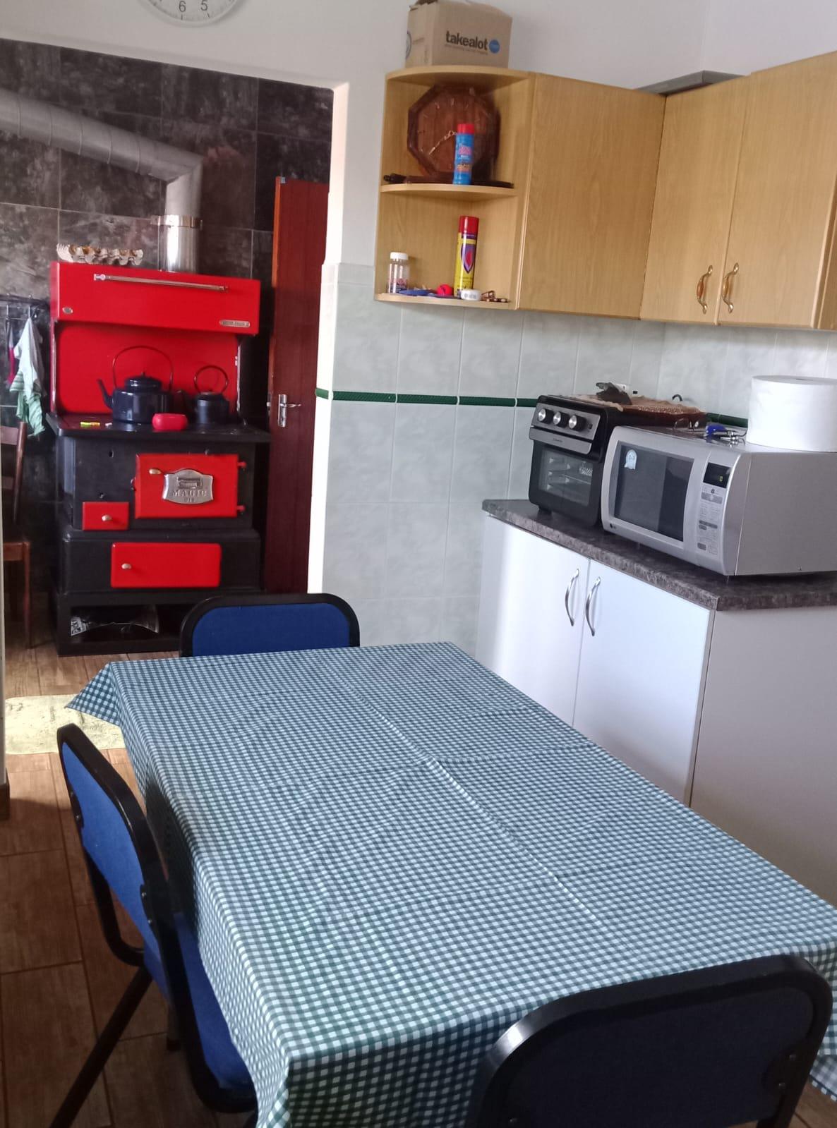 The sunny open-plan lounge and dining area, complete with a built-in braai, creates an inviting space for everyday living. Neat tiled floors run throughout, while the well-equipped kitchen offers ample cupboard space and a charming wood-burning stove, with a separate laundry for added convenience.