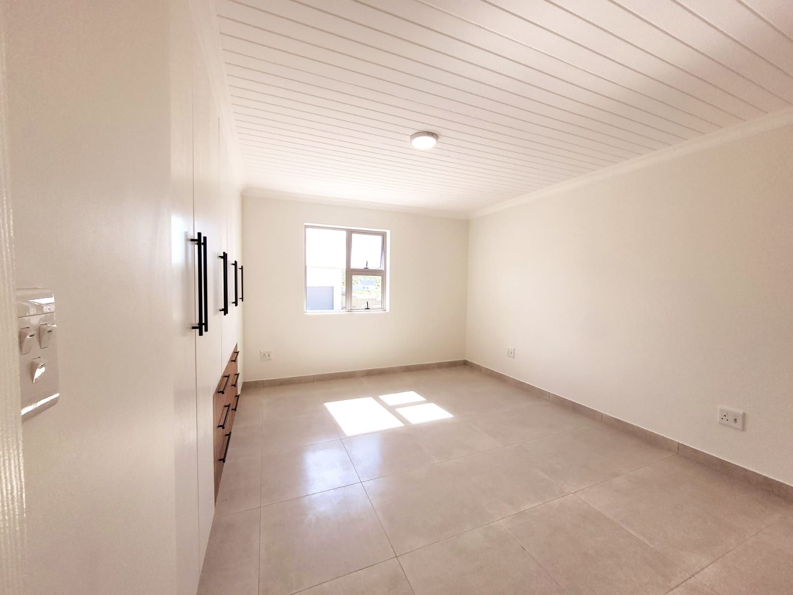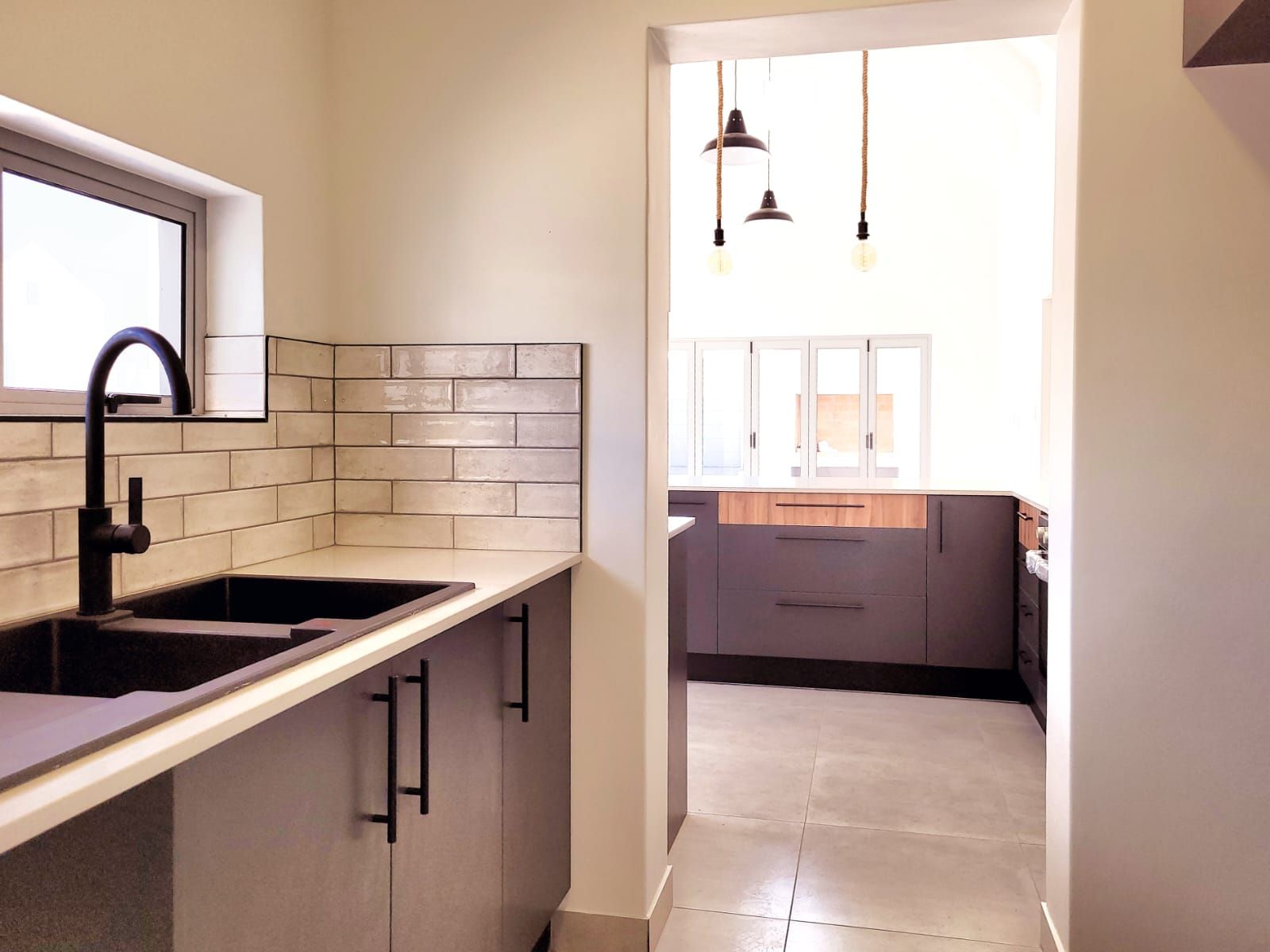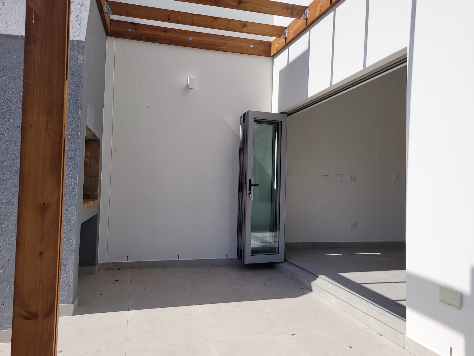The heart of the home is its open-plan kitchen and living area, a space designed for connection. Stacking doors open onto a sunlit patio, seamlessly blending the indoors with the outdoors. The built-in braai turns everyday living into an experience of fresh air, sunshine, and the gentle sounds of nature.
