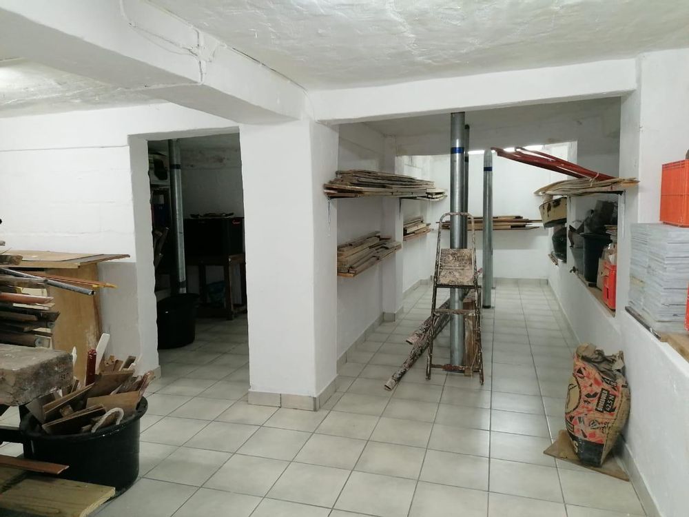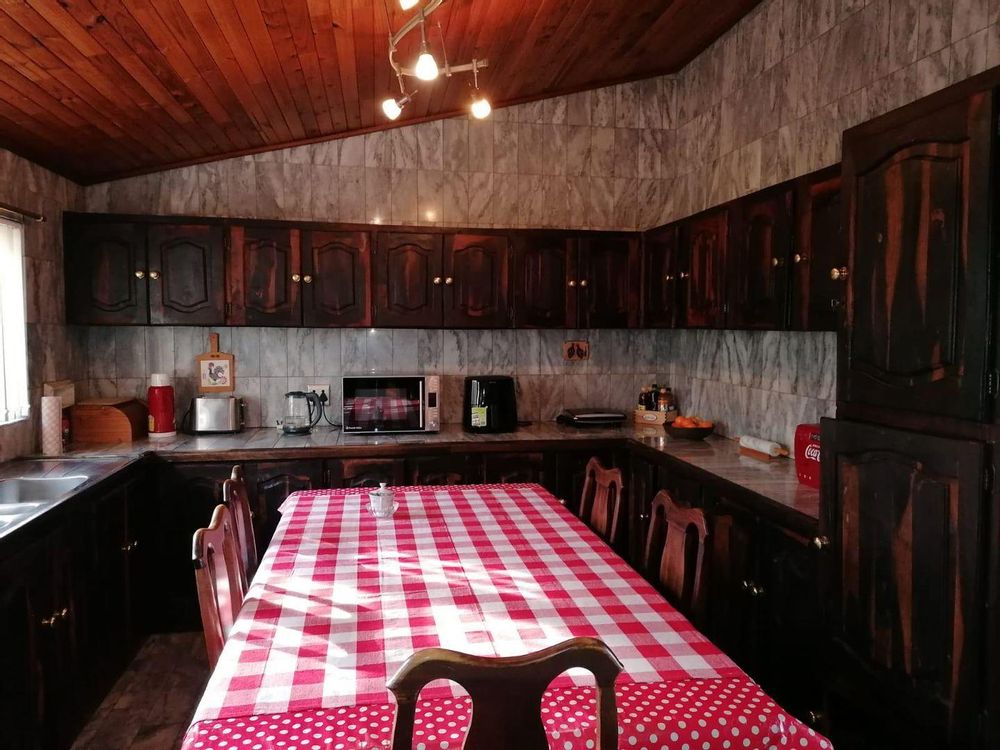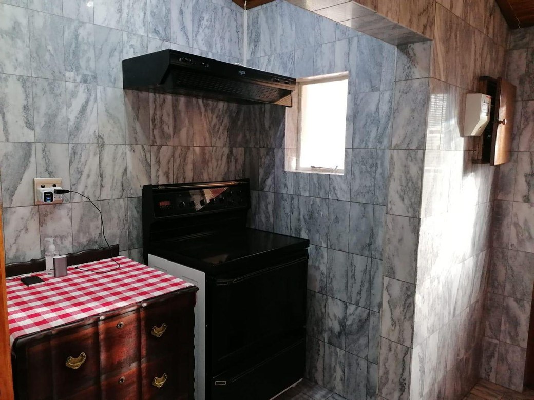 Across the hallway, you have access to a lovely, spacious kitchen with proper wood cupboards, a free-standing electric stove, and a marble finish with a door leading to the outside buildings and garden.