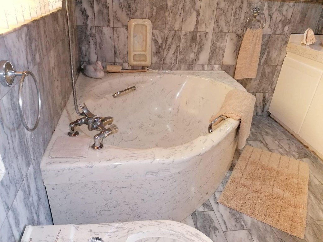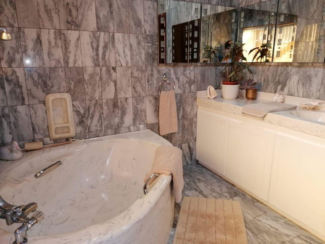 Master bedroom with an en-suite bathroom with marble finishes.