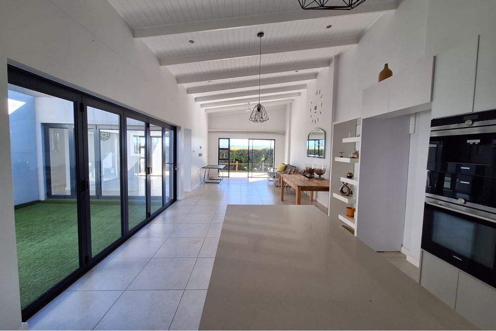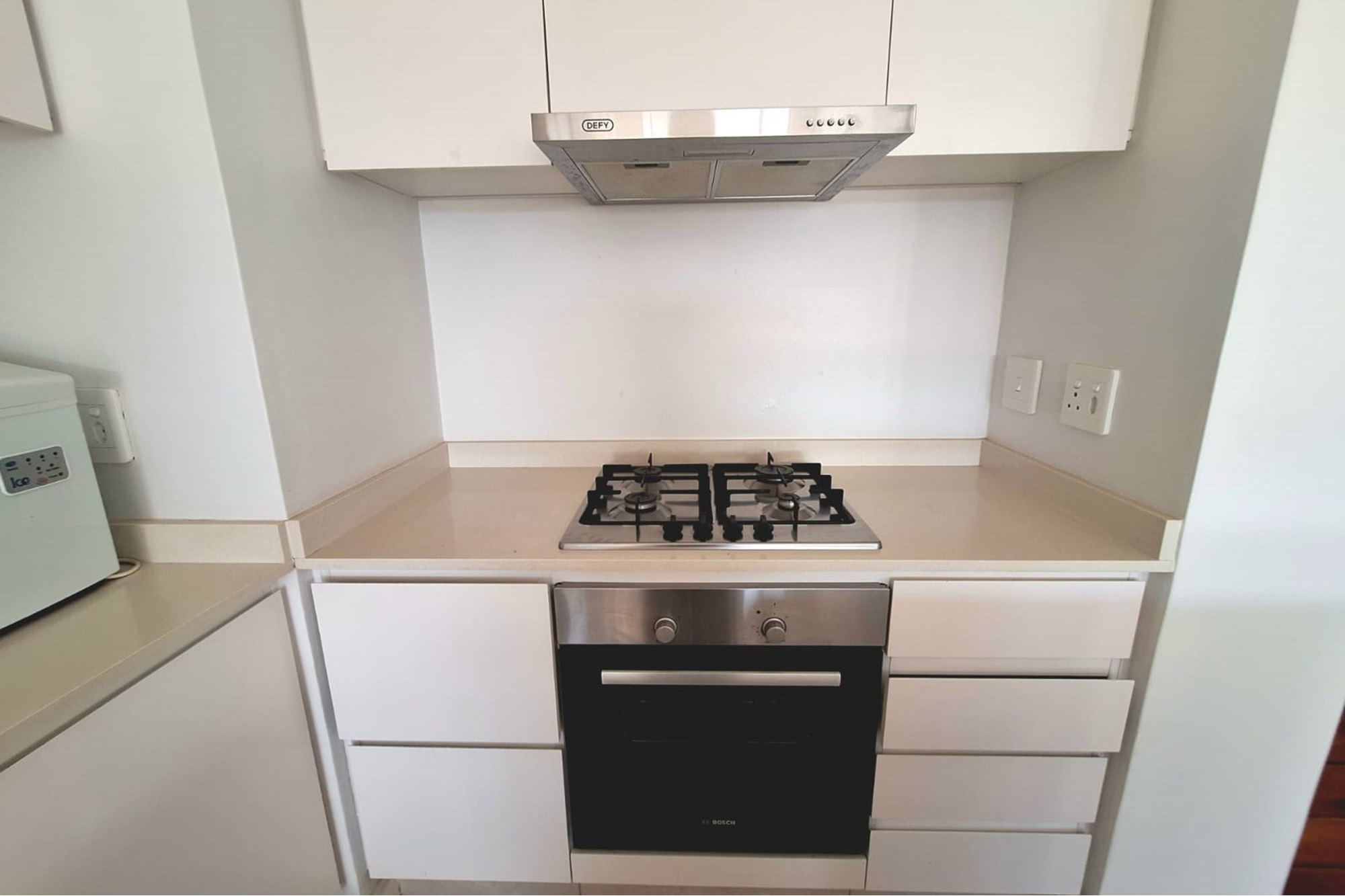 The airy, high white-painted ceilings enhance the sense of space in the open plan living area. The sleek kitchen is equipped modern appliances, a gas stove and built in coffee machine, with a separate scullery for added convenience.