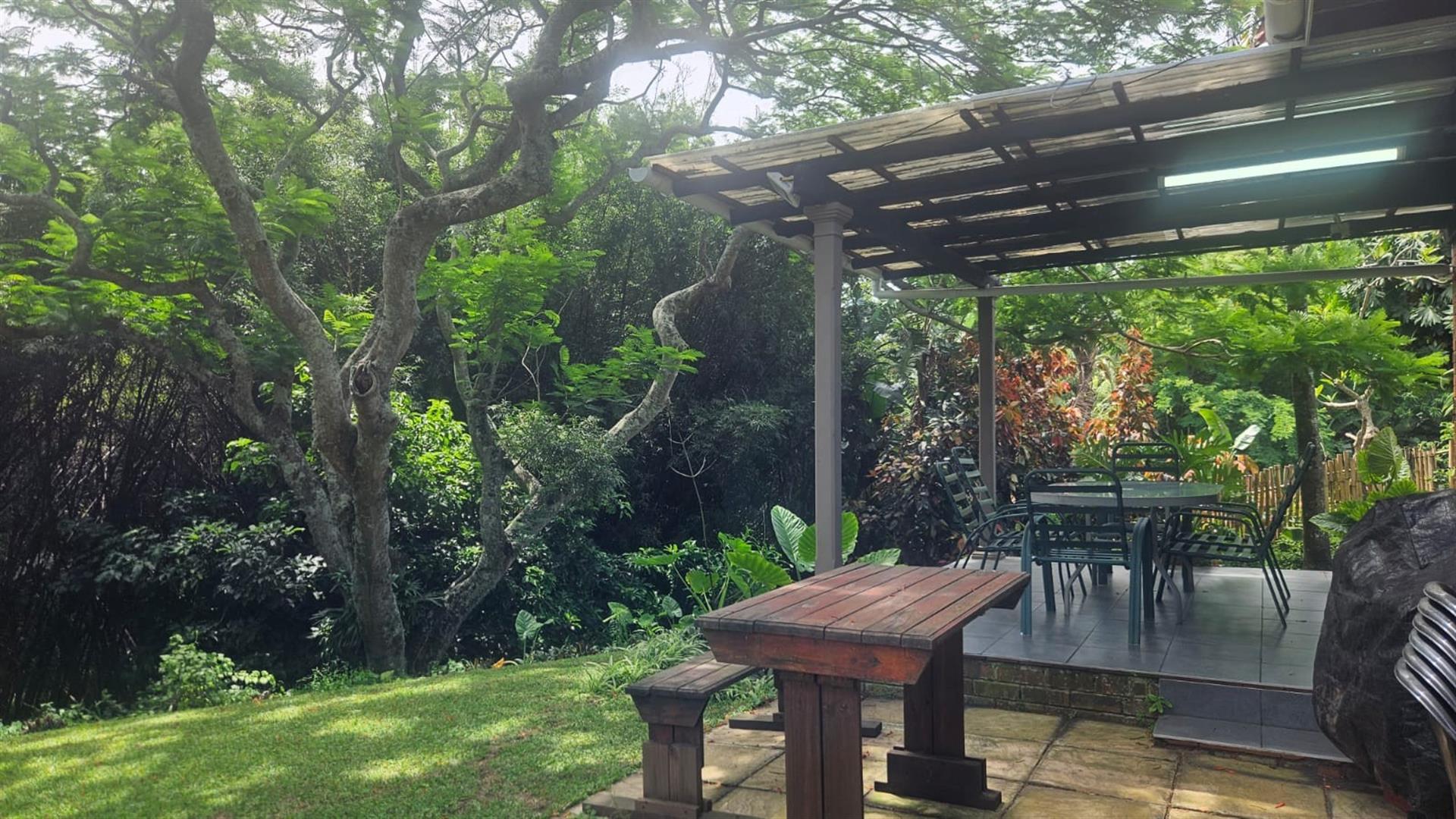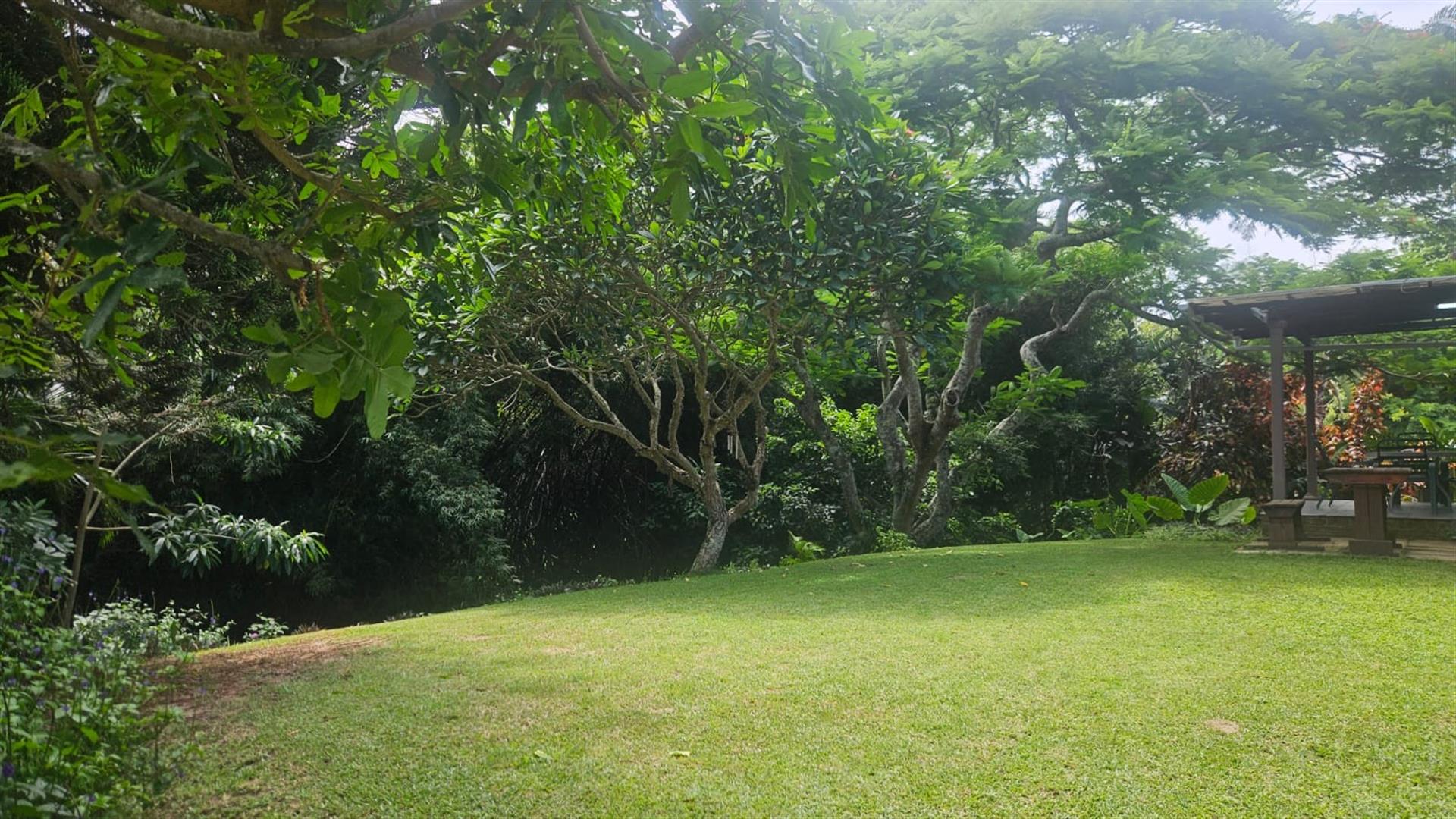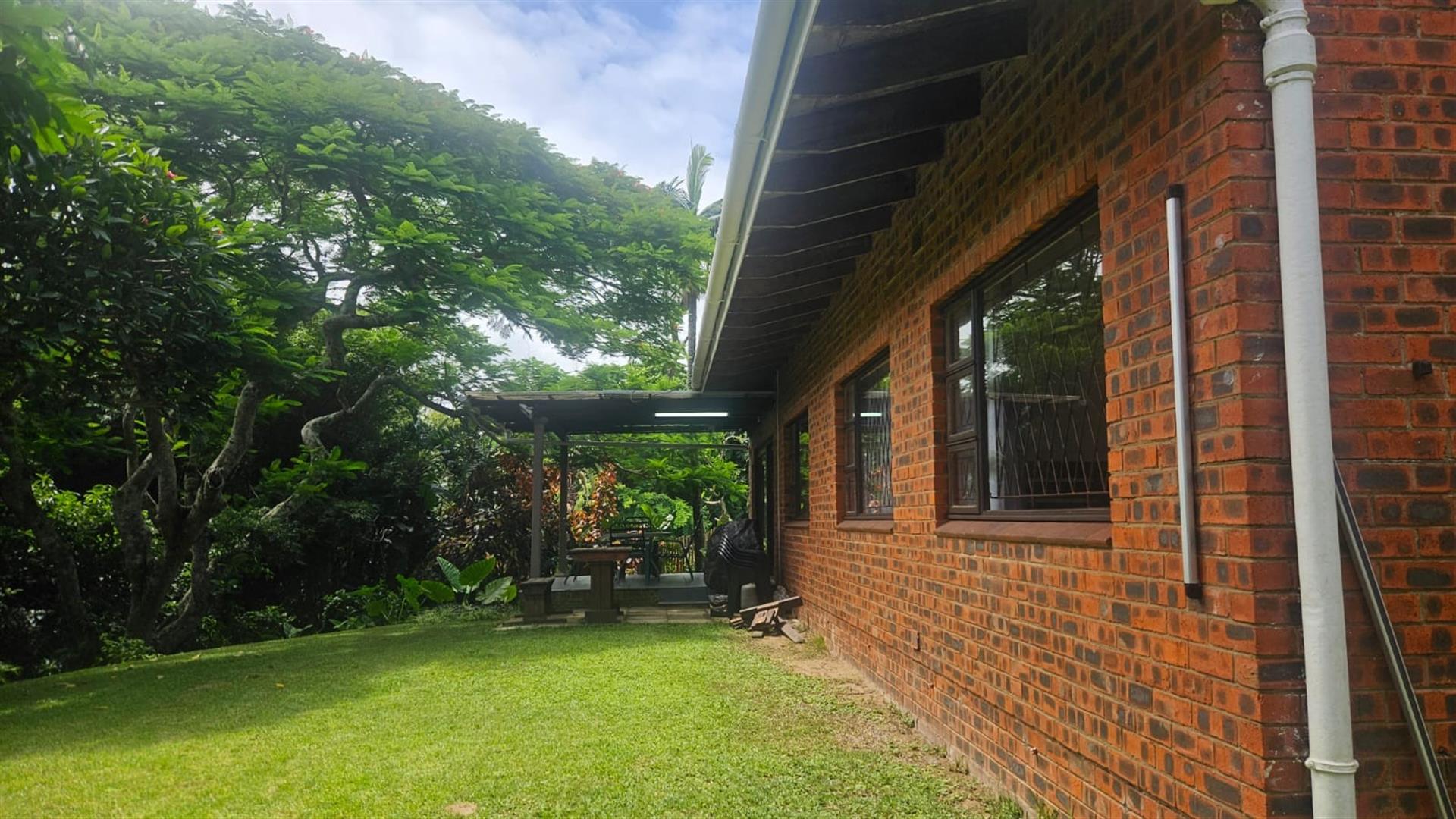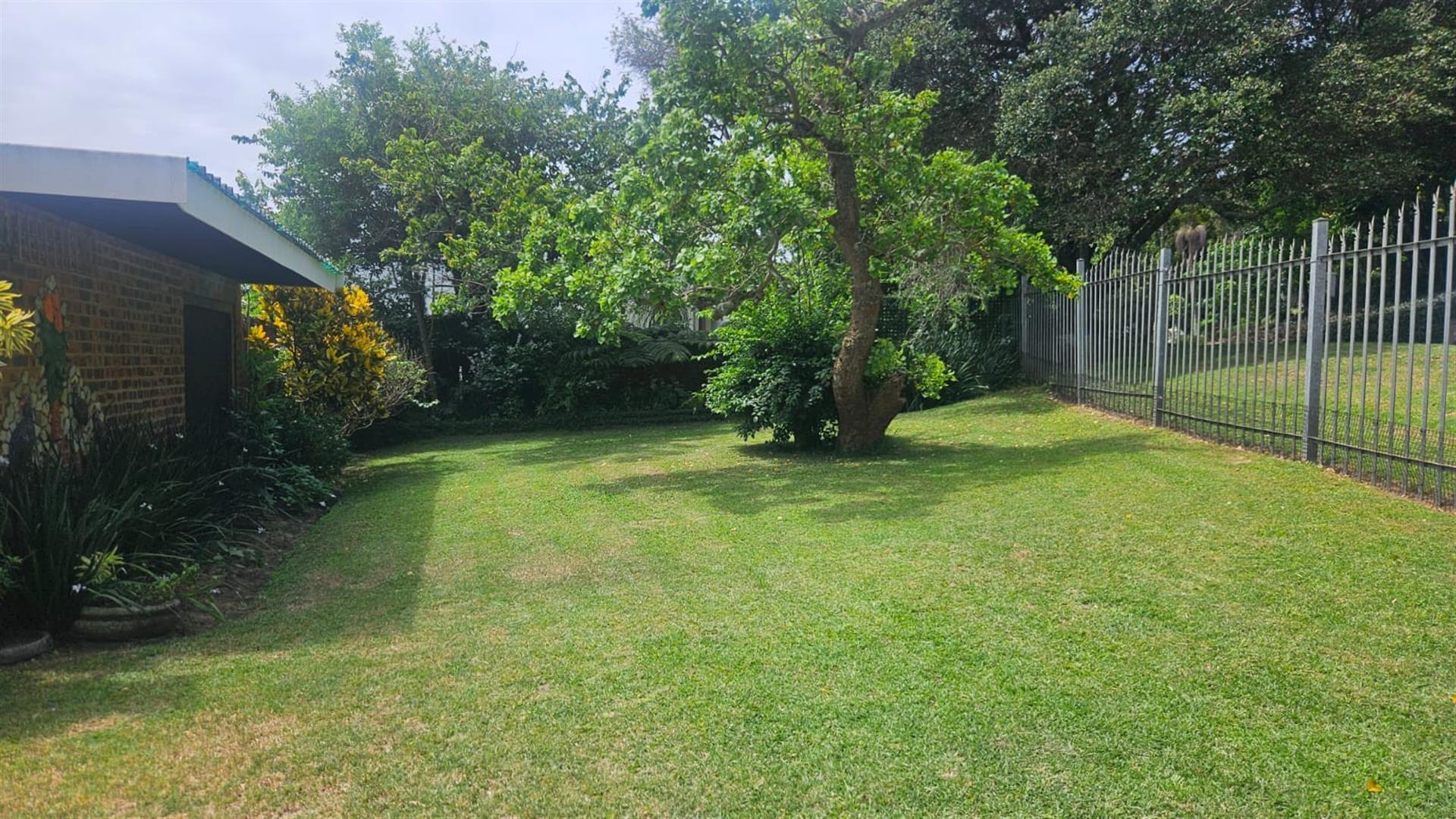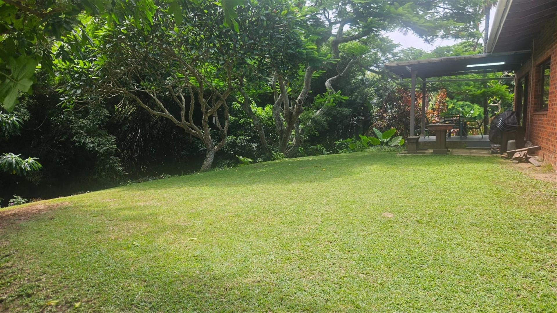 The open-plan lounge and dining area create a welcoming living space, enhanced by air conditioning in the lounge and main bedroom, with fans fitted throughout the home. A linen cupboard adds extra storage convenience. Sliding doors from the lounge lead out to a covered patio overlooking a large grassy garden with established trees, perfect for outdoor living and entertaining. Below the property, a river runs along the lower boundary, adding a peaceful natural element to the setting.