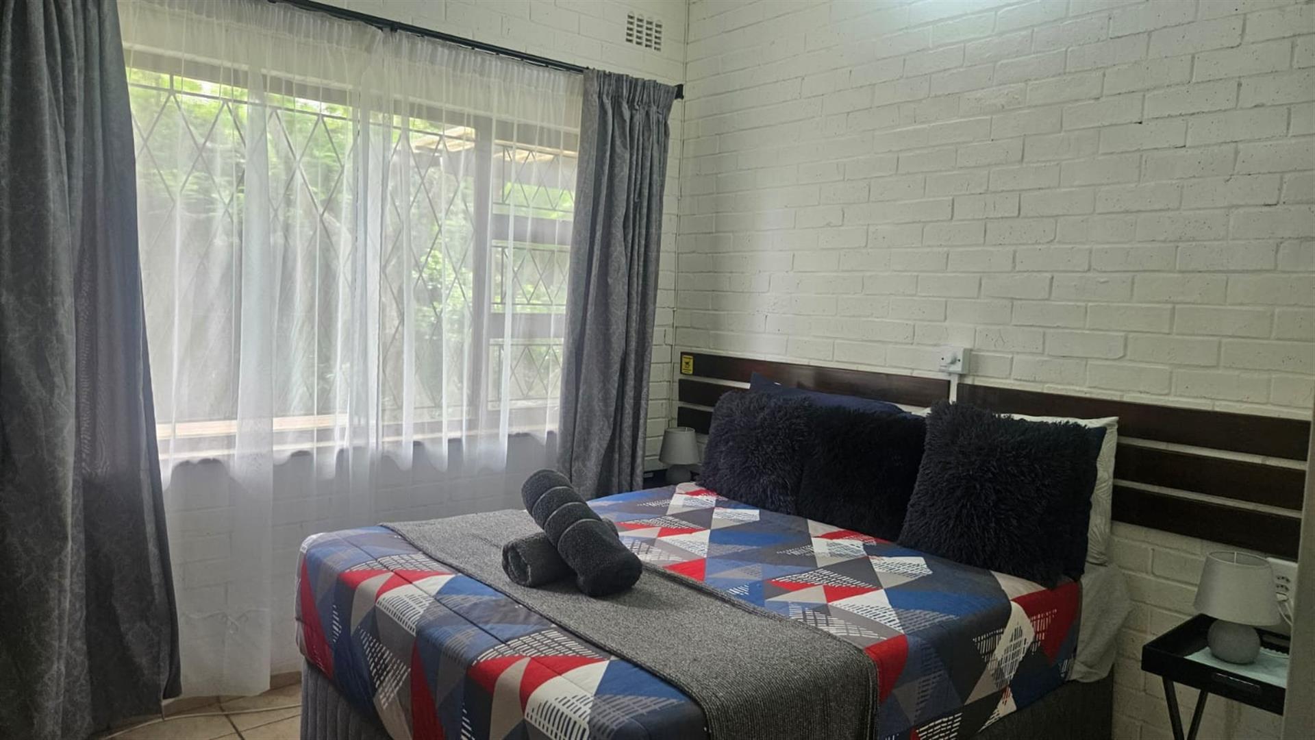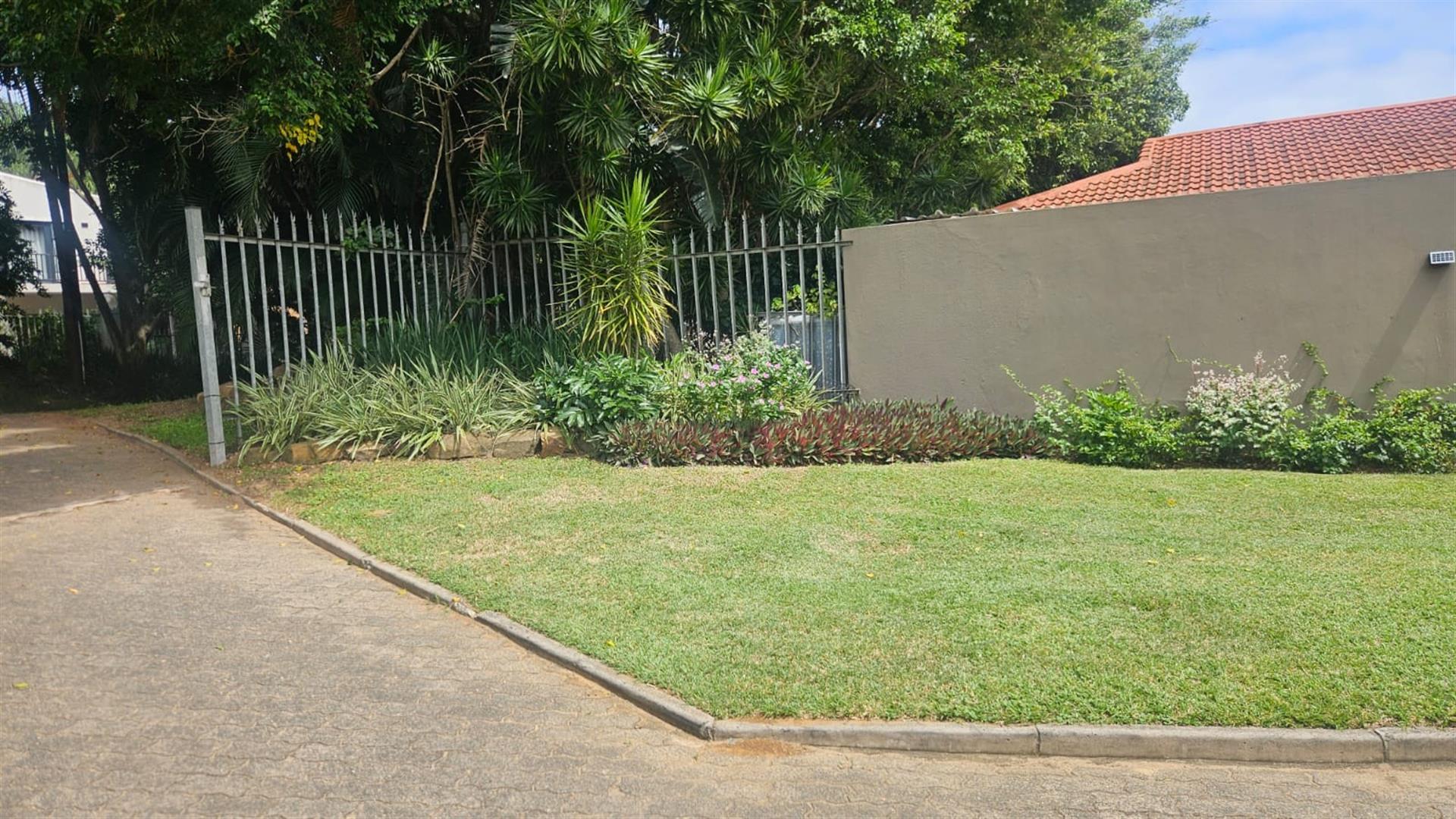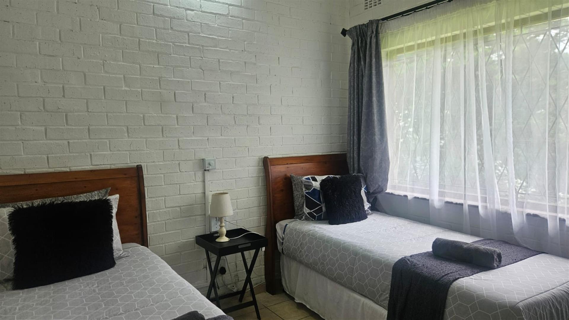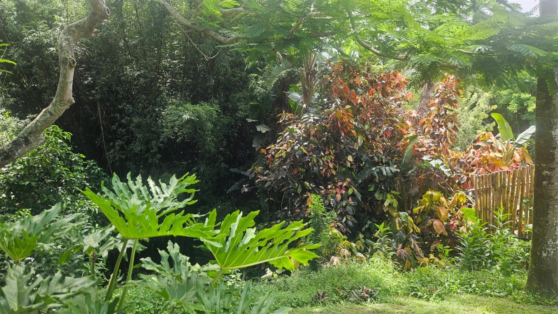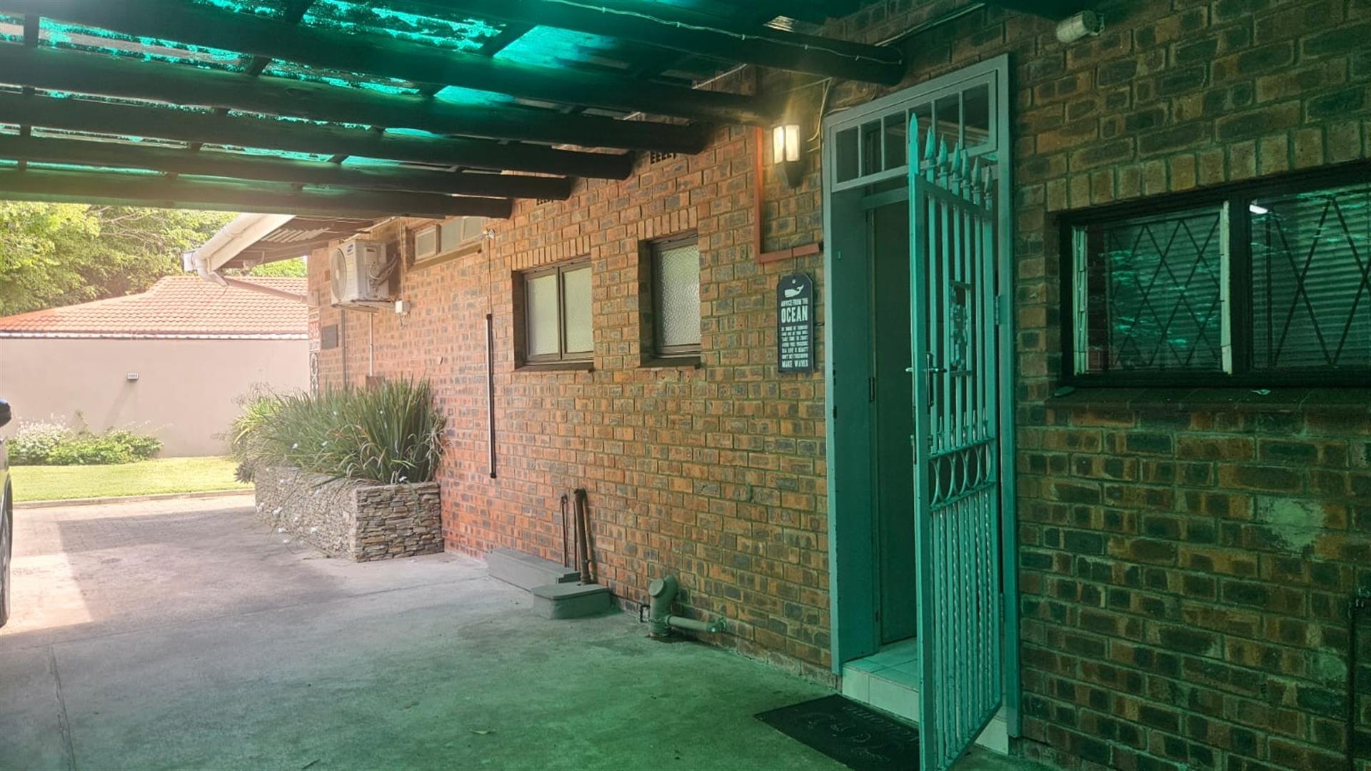 The open-plan lounge and dining area create a welcoming living space, enhanced by air conditioning in the lounge and main bedroom, with fans fitted throughout the home. A linen cupboard adds extra storage convenience. Sliding doors from the lounge lead out to a covered patio overlooking a large grassy garden with established trees, perfect for outdoor living and entertaining. Below the property, a river runs along the lower boundary, adding a peaceful natural element to the setting.