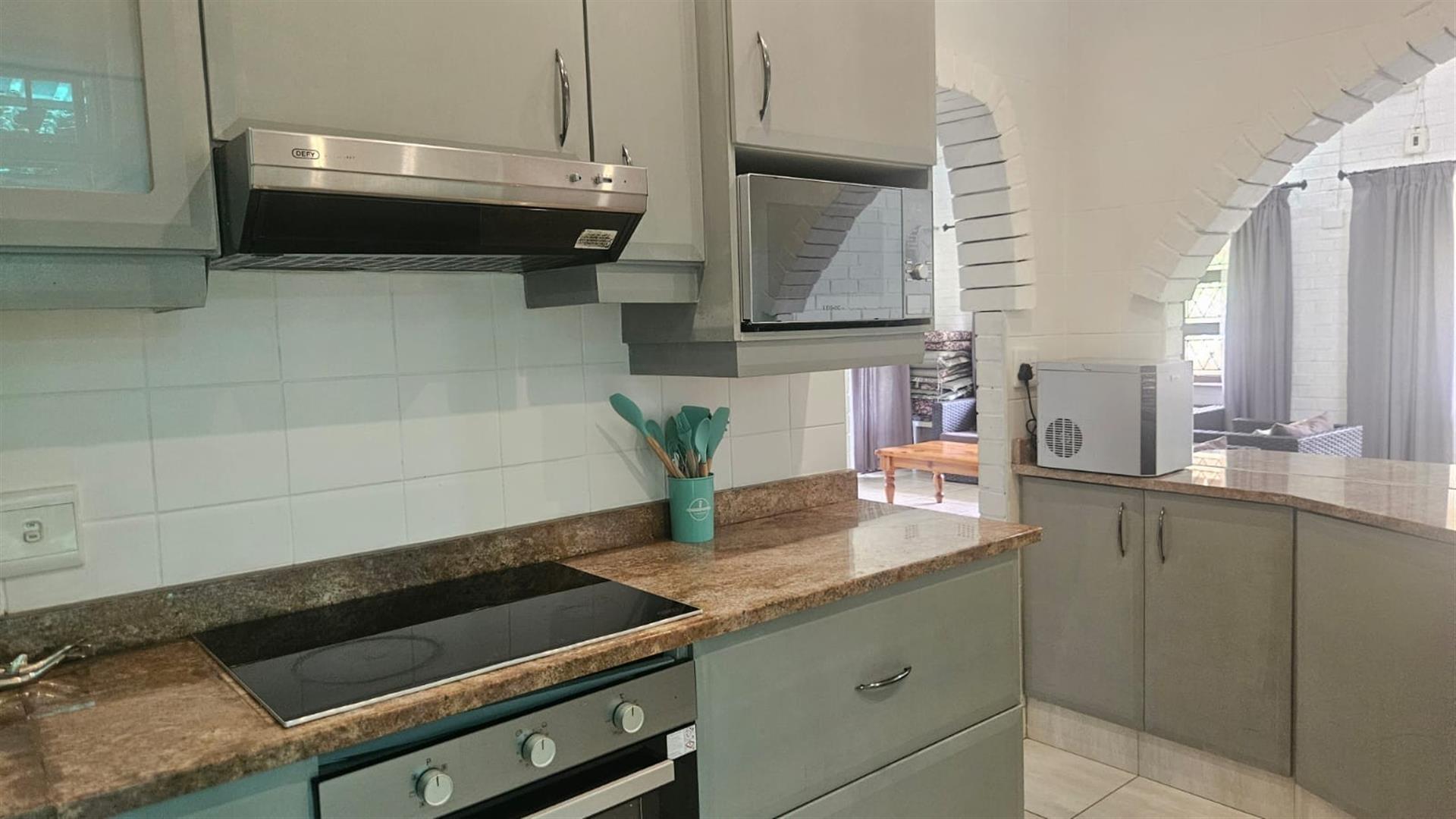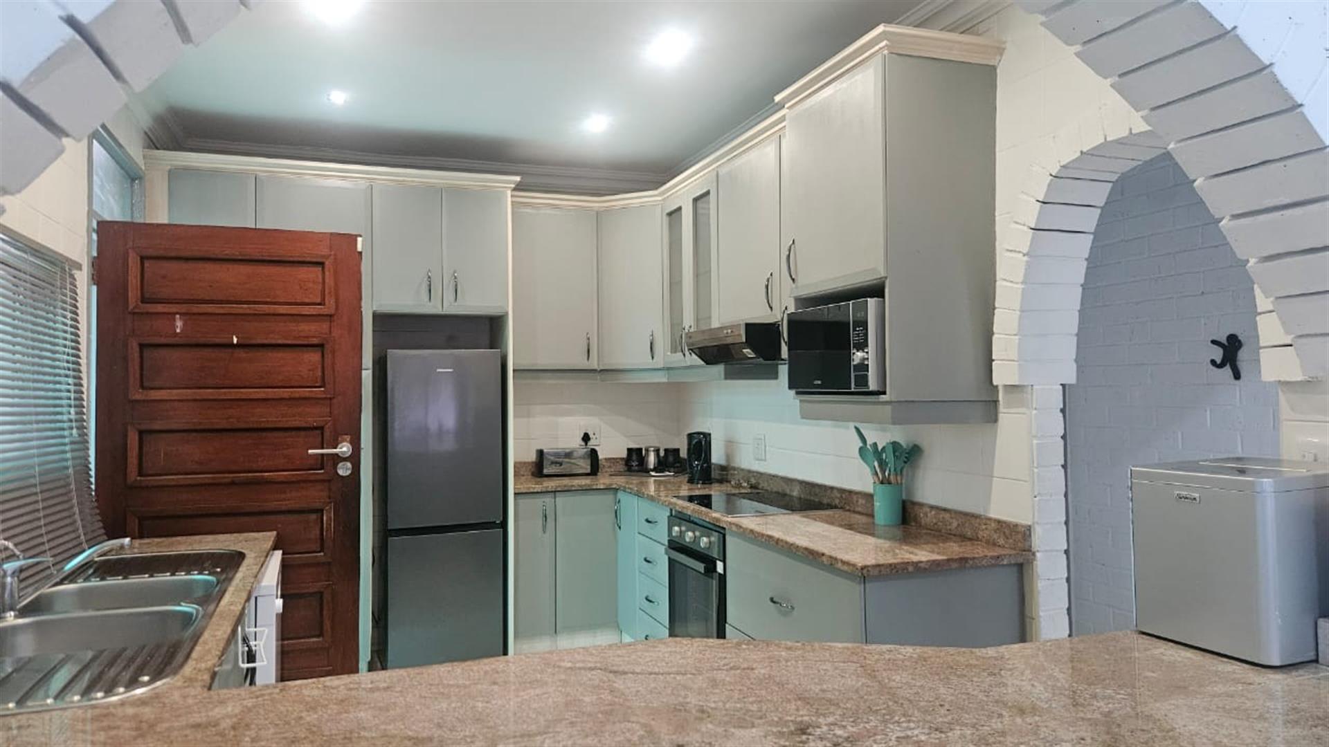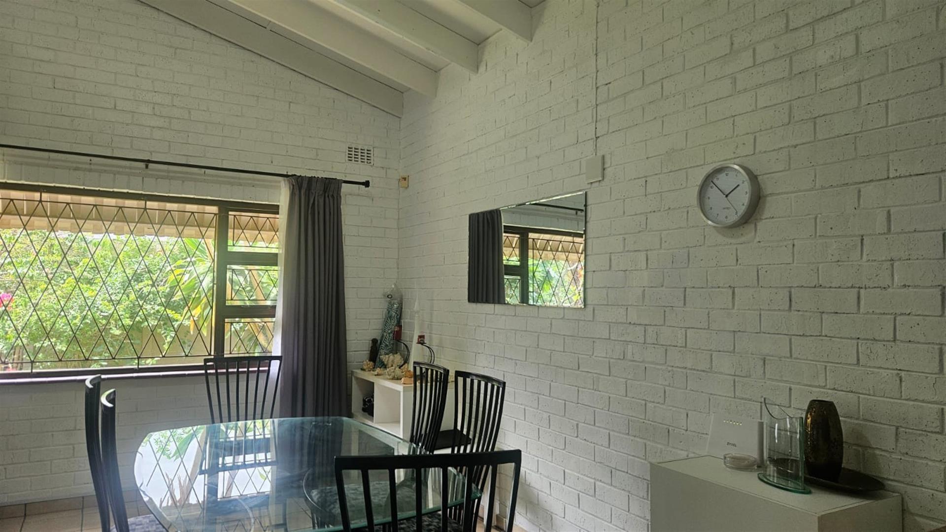 Set on a generous 1146m2 freestanding stand, in a sought after area of Salt Rock, not far from the beach, shops and schools like Curro. This well-maintained home offers space, comfort and excellent lifestyle appeal to a family. The property features three bedrooms and two full bathrooms, including a main en-suite, making it ideal for family living. The well-appointed kitchen offers ample cupboard space, an undercounter electric oven with glass hob and extractor fan, and a practical feed-through to the open-plan dining and lounge area, finished with granite countertops.