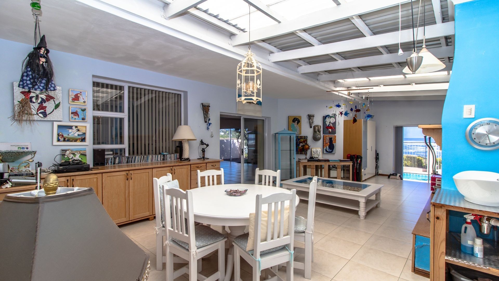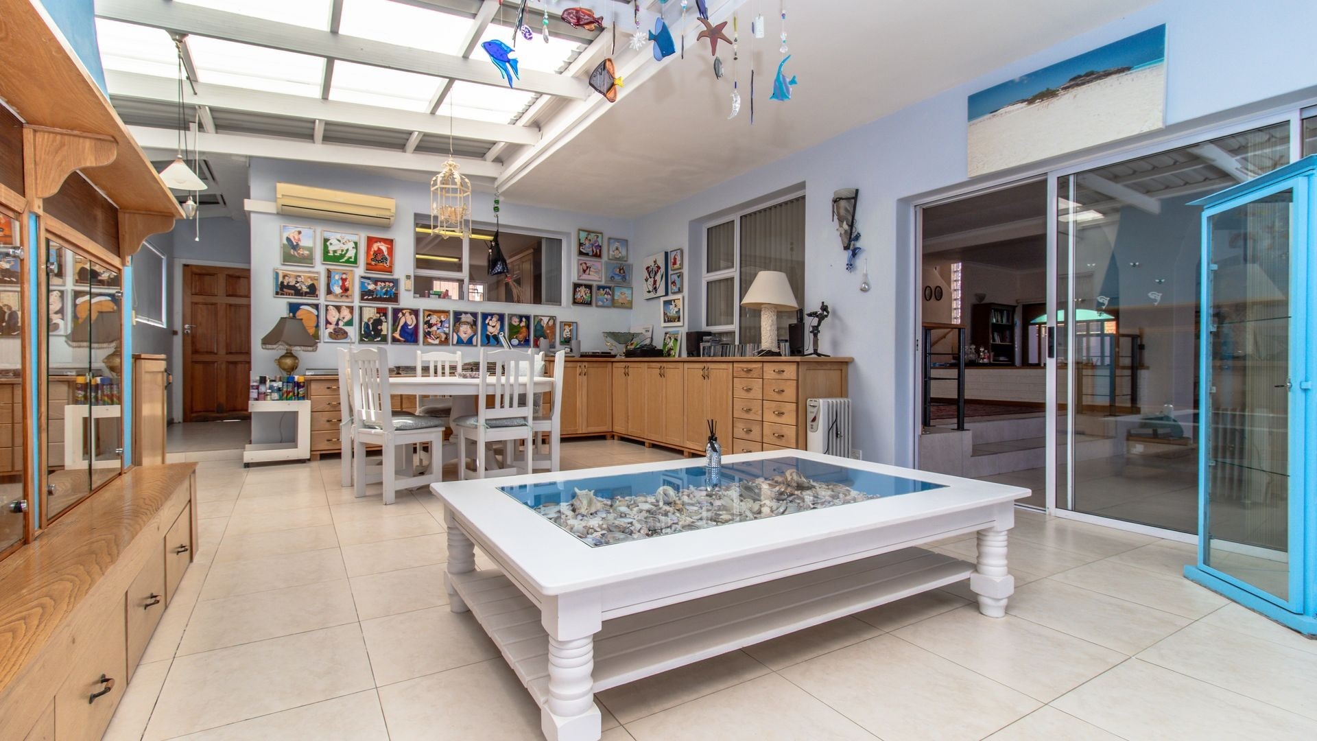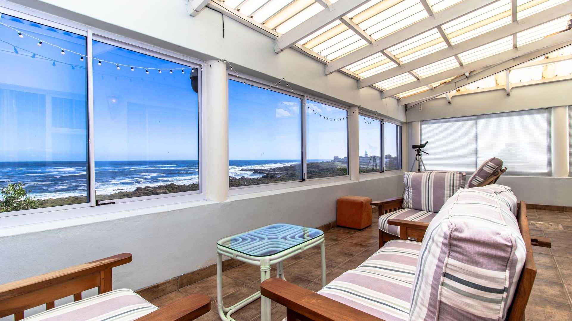 Upstairs, four en-suite bedrooms open onto a covered wrap-around veranda and a sunroom with a built-in braai—the perfect spot to soak in the coastal ambiance. Large sliding aluminum windows invite natural light and sea breezes, creating a relaxing, all-season sanctuary.