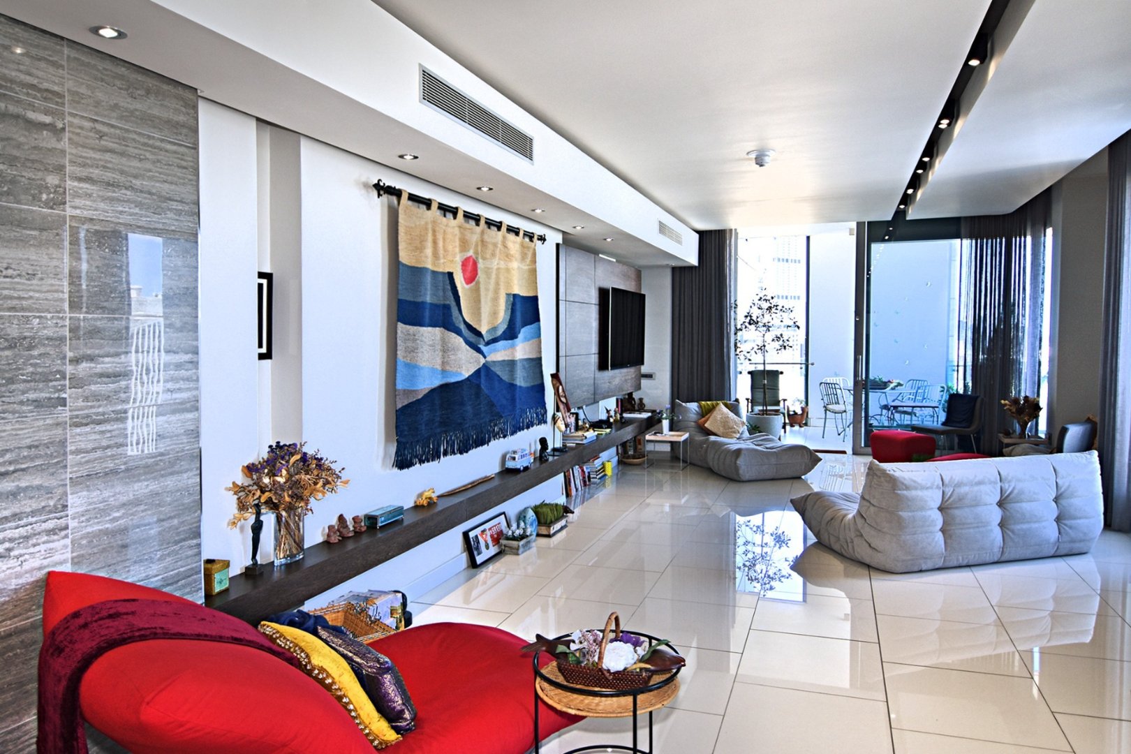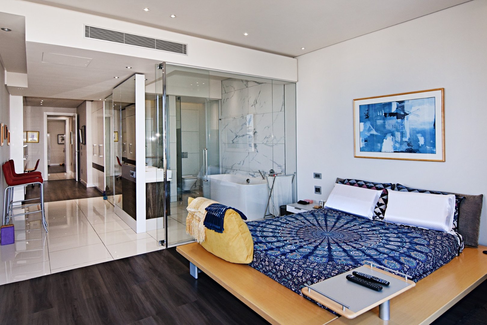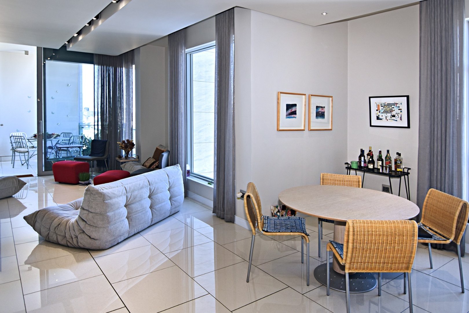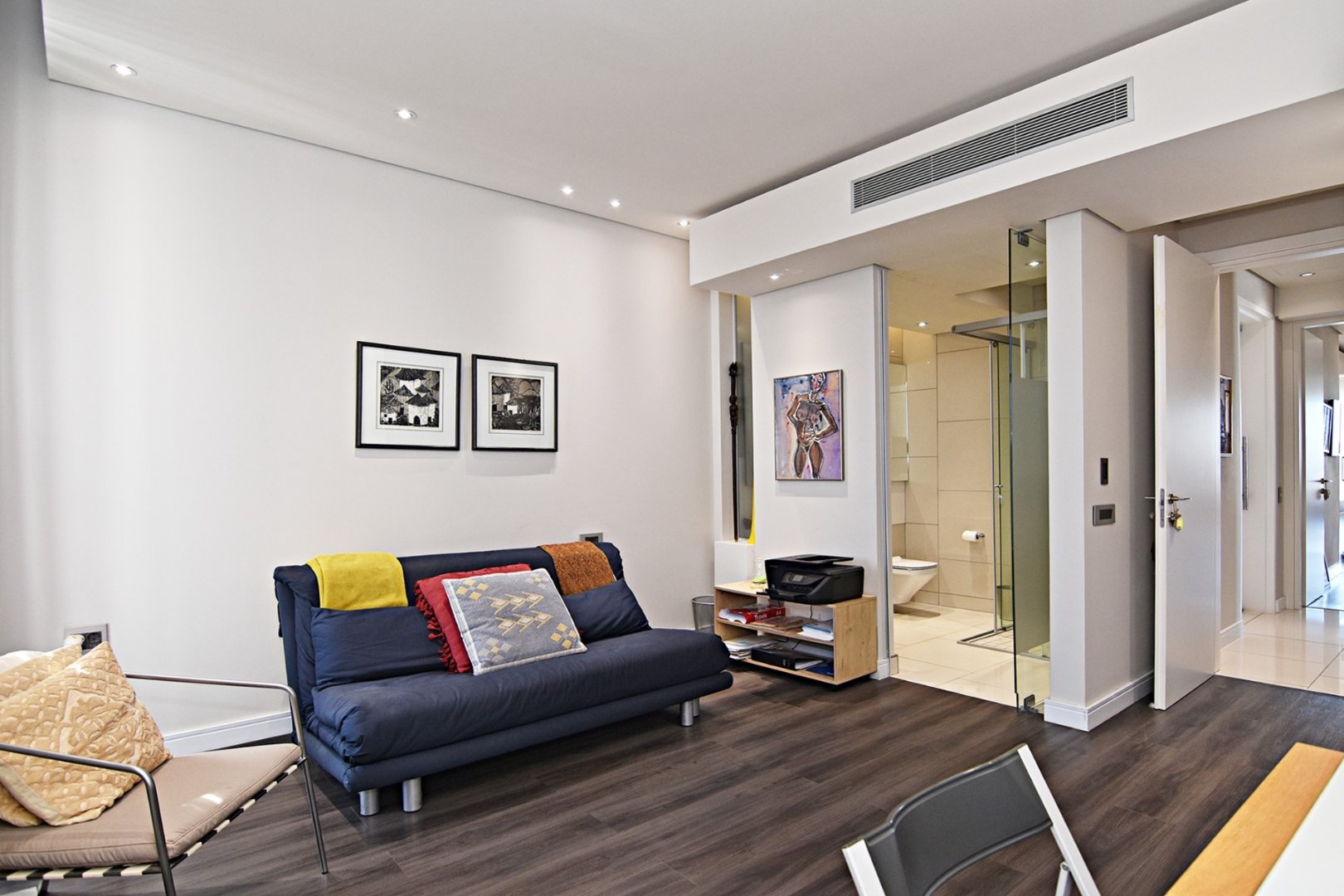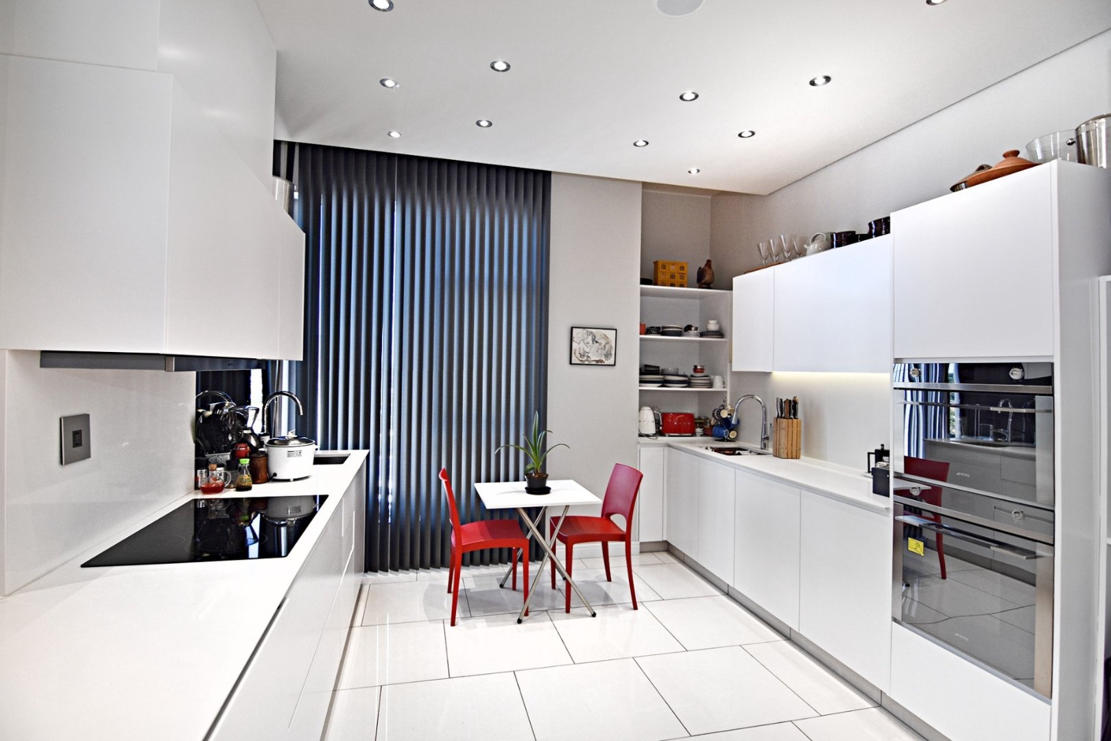 This sophisticated and modern apartment offers an airy open plan modern setup with spacious lounge, dining, and kitchen areas, respectively. The kitchen comes with an ample cupboard and offers all Smeg appliances with a double oven/ glass hob, Washer Dryer, Fridge, Dishwasher, and Caesar stone tops.