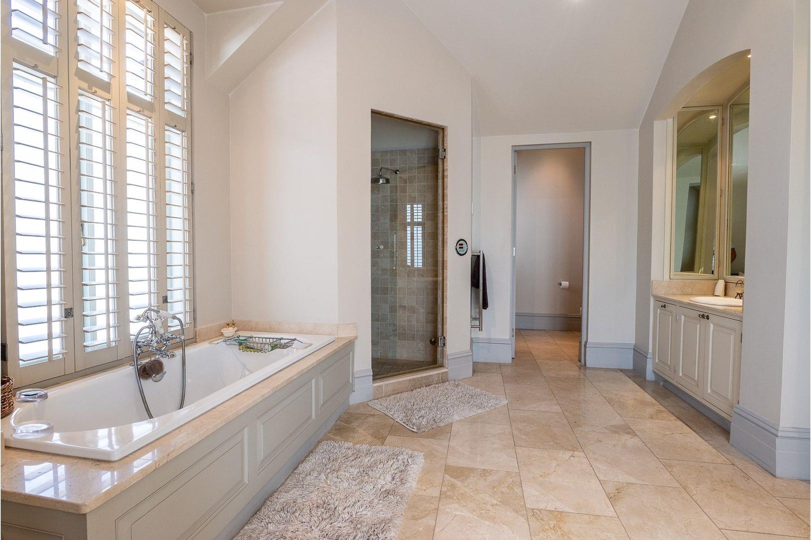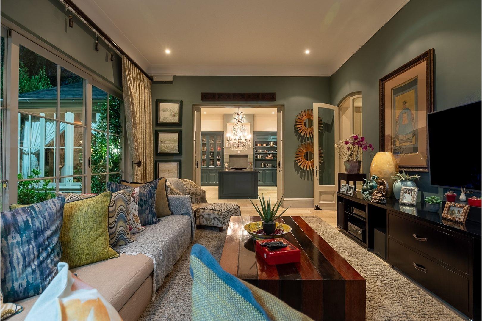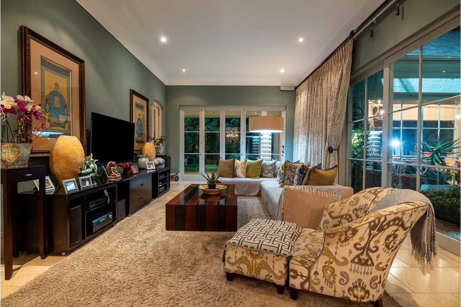 Four expansive receptions flow onto a covered patio with a built-in braai, overlooking the feature pool and landscaped gardens.