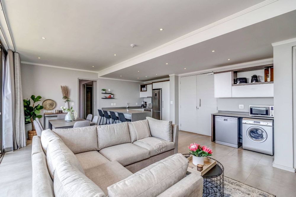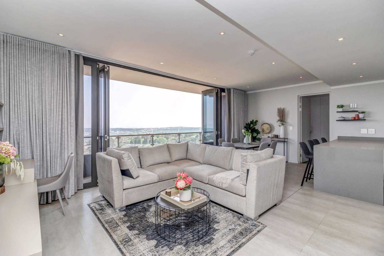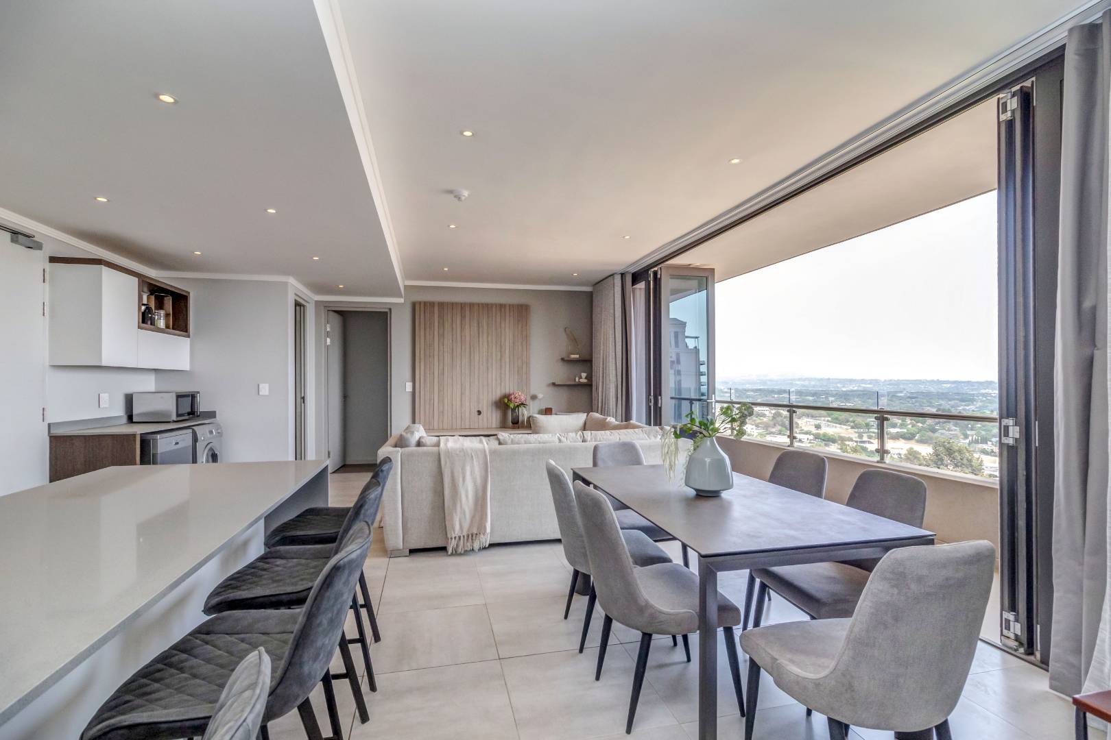 The open plan ultra modern kitchen, lounge and dining with a huge balcony boasting with the most amazing views of JHB