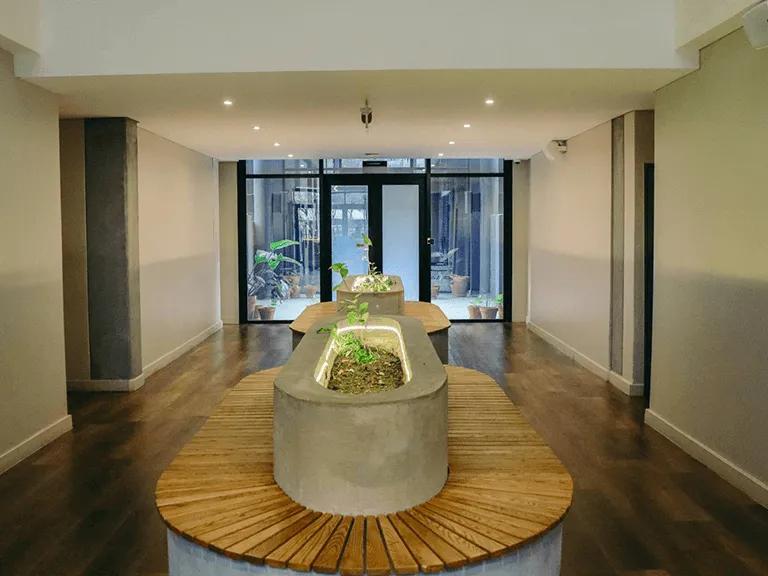 At the entrance, a welcoming coffee bar sets the tone for the building’s creative energy — perfect for grabbing a quick drink before starting your day. Up on the rooftop, you’ll find *Artistry*, a beautifully curated restaurant and social space where you can entertain friends, catch a sports game, or enjoy exceptional meals from morning to night.