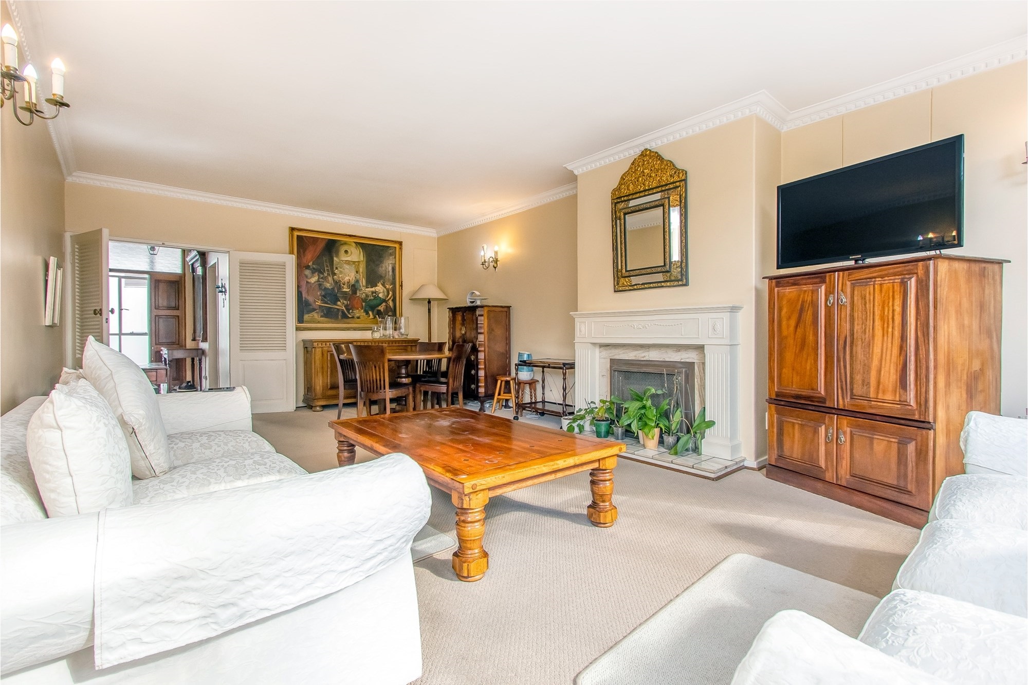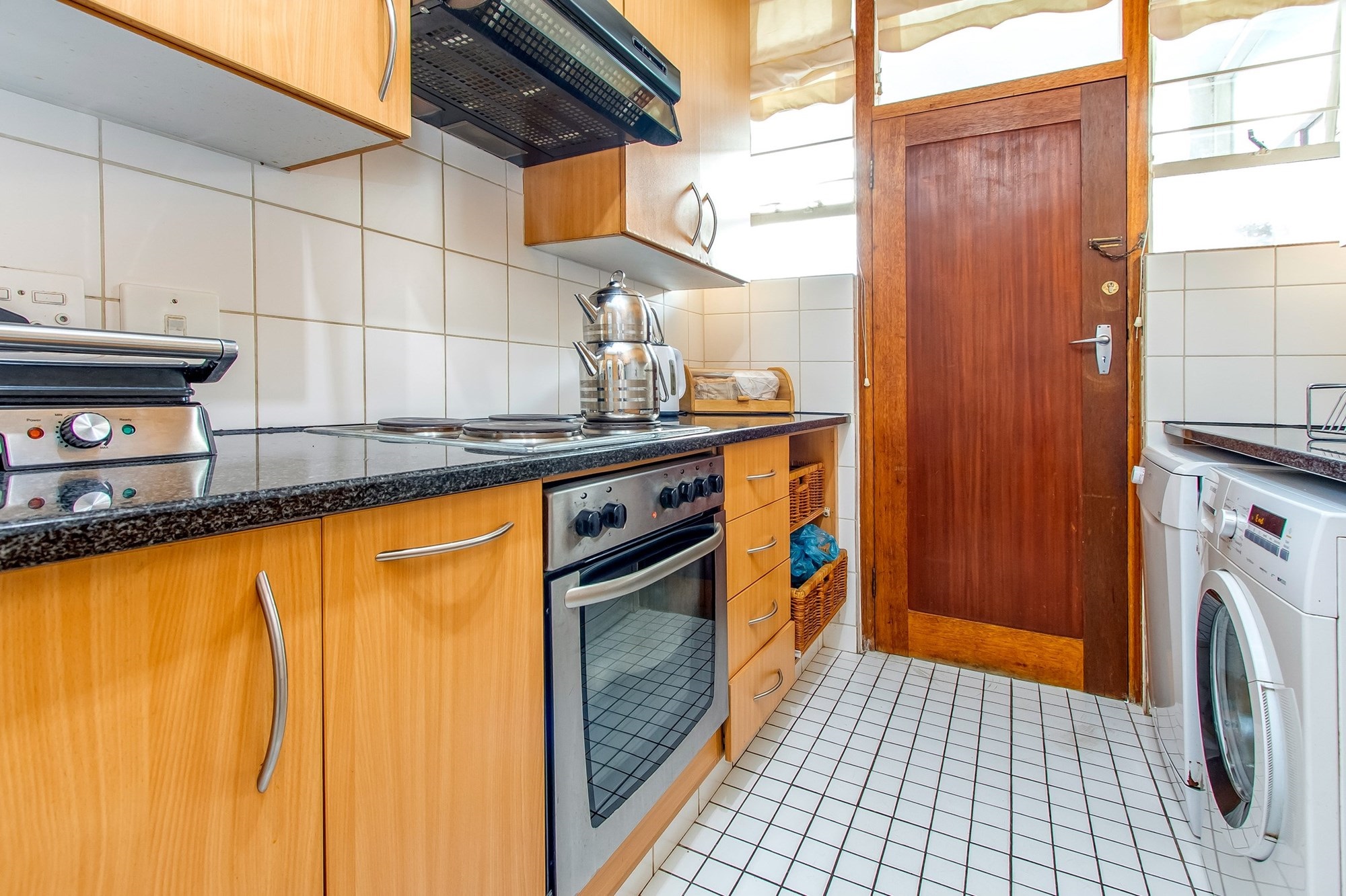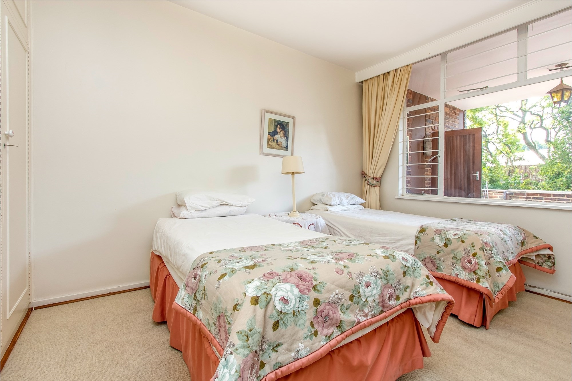 The spacious main bedroom is a serene sanctuary, complete with garden views, direct access to the balcony, wall-to-wall built-in cupboards, and an en-suite bathroom. A comfortable second bedroom with built-in cupboards is serviced by a full family bathroom with enclosed shower and separate bath.