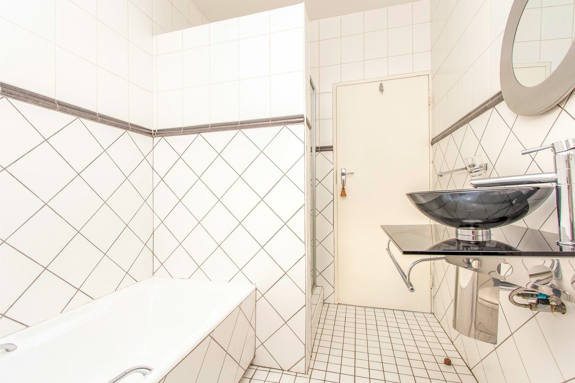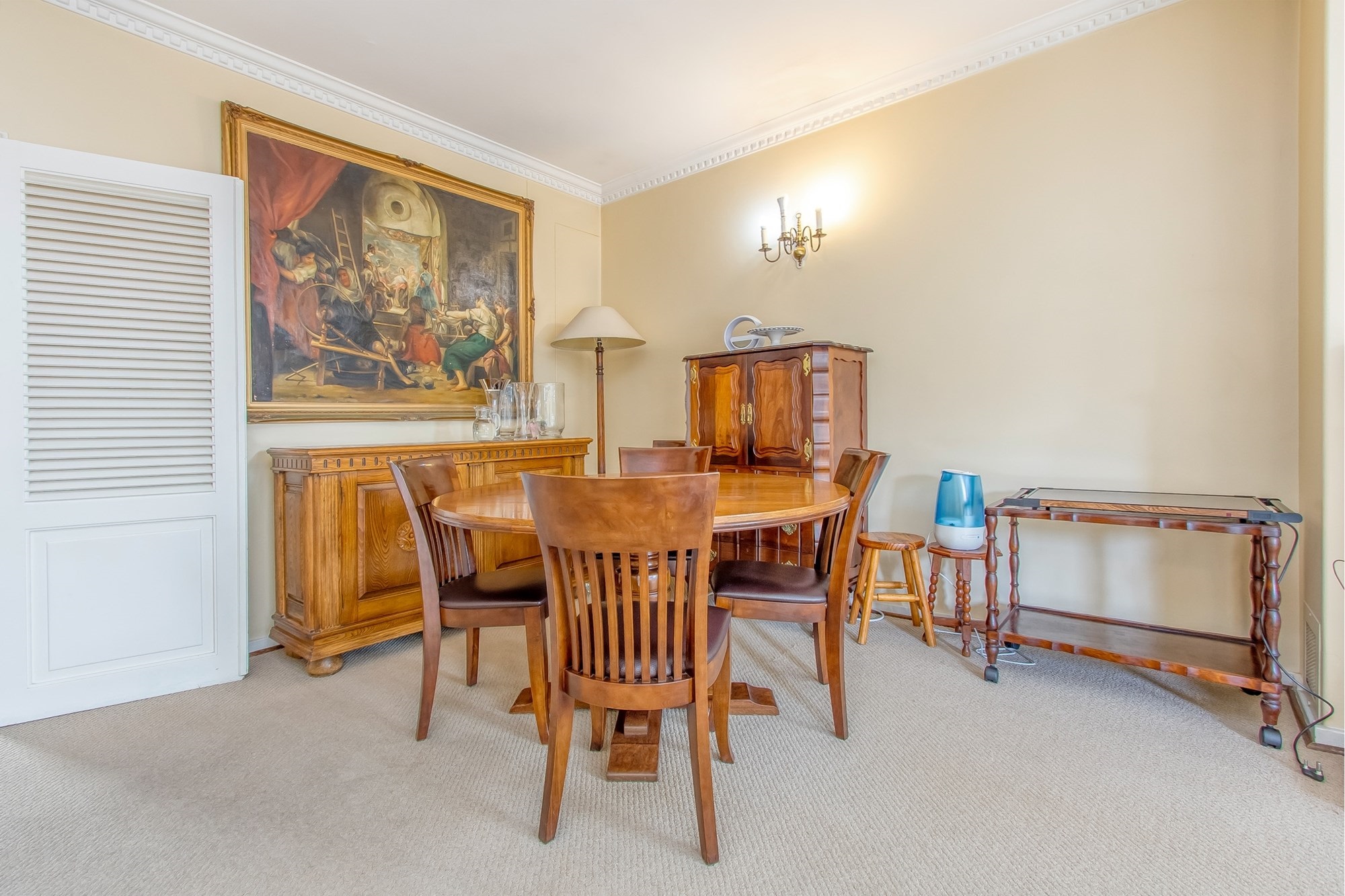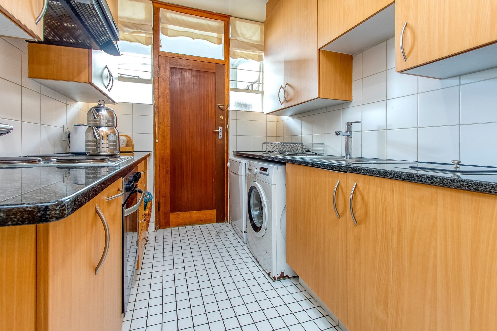 The spacious main bedroom is a serene sanctuary, complete with garden views, direct access to the balcony, wall-to-wall built-in cupboards, and an en-suite bathroom. A comfortable second bedroom with built-in cupboards is serviced by a full family bathroom with enclosed shower and separate bath.