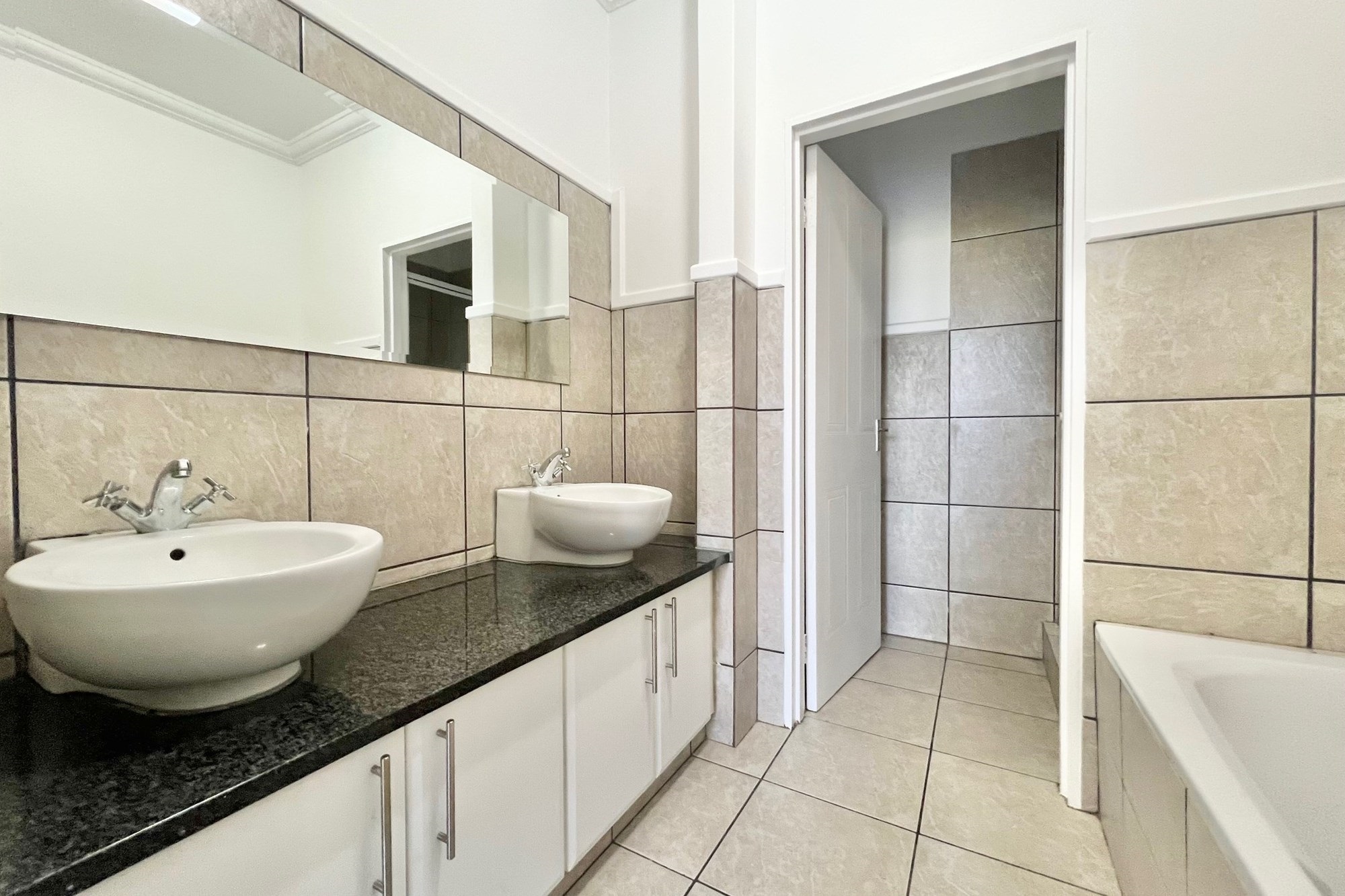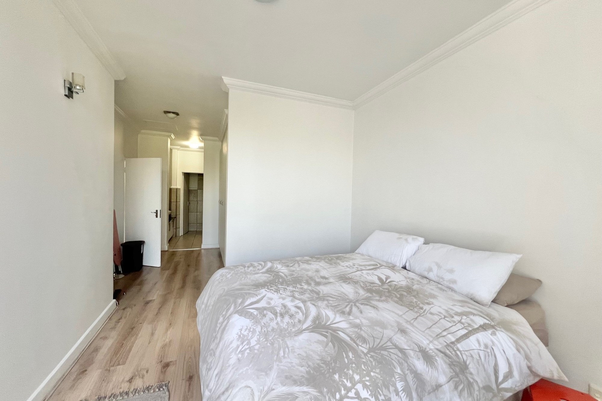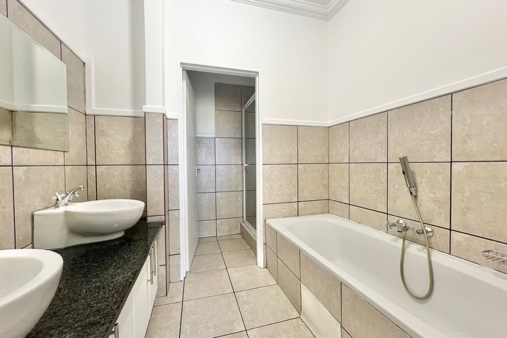 The spacious bedroom features elegant laminate flooring and flows into a luxurious en-suite bathroom complete with a shower, bath, toilet, and his and hers basins.