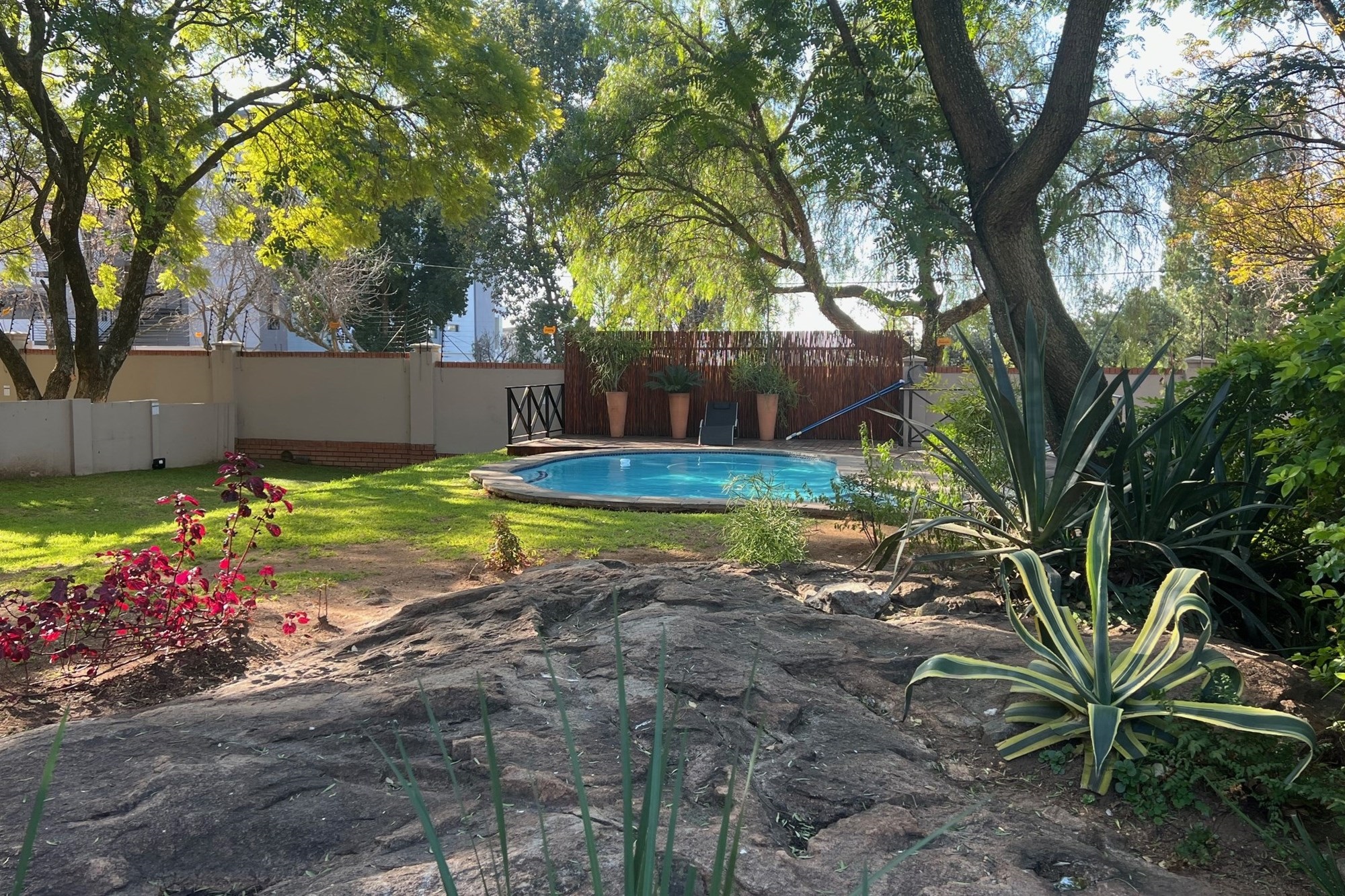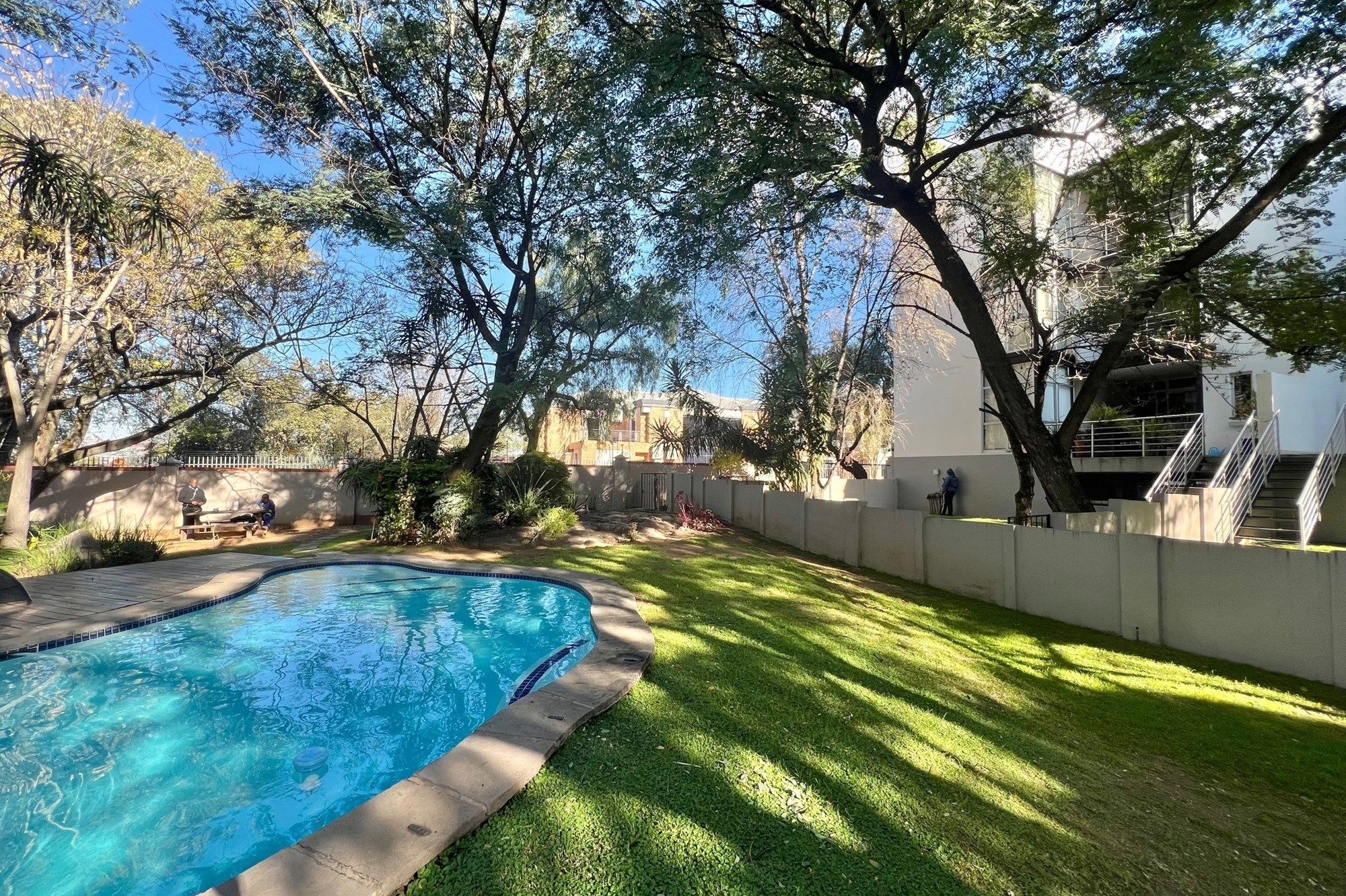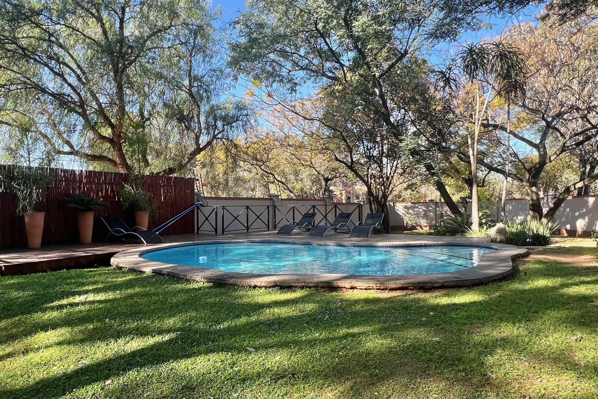 The communal swimming pool boasts poolside loungers for residents to enjoy and is surrounded by natural life.
