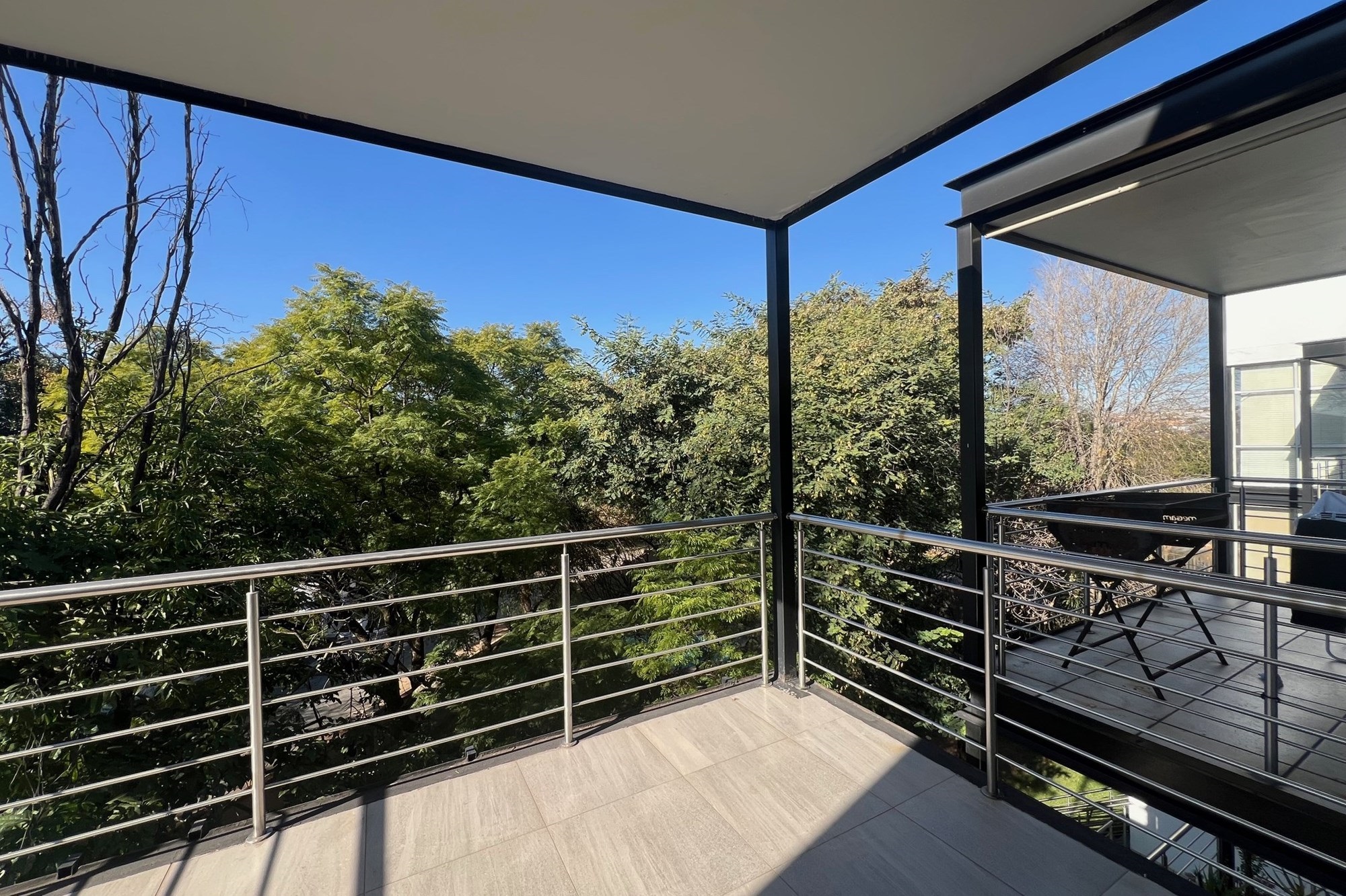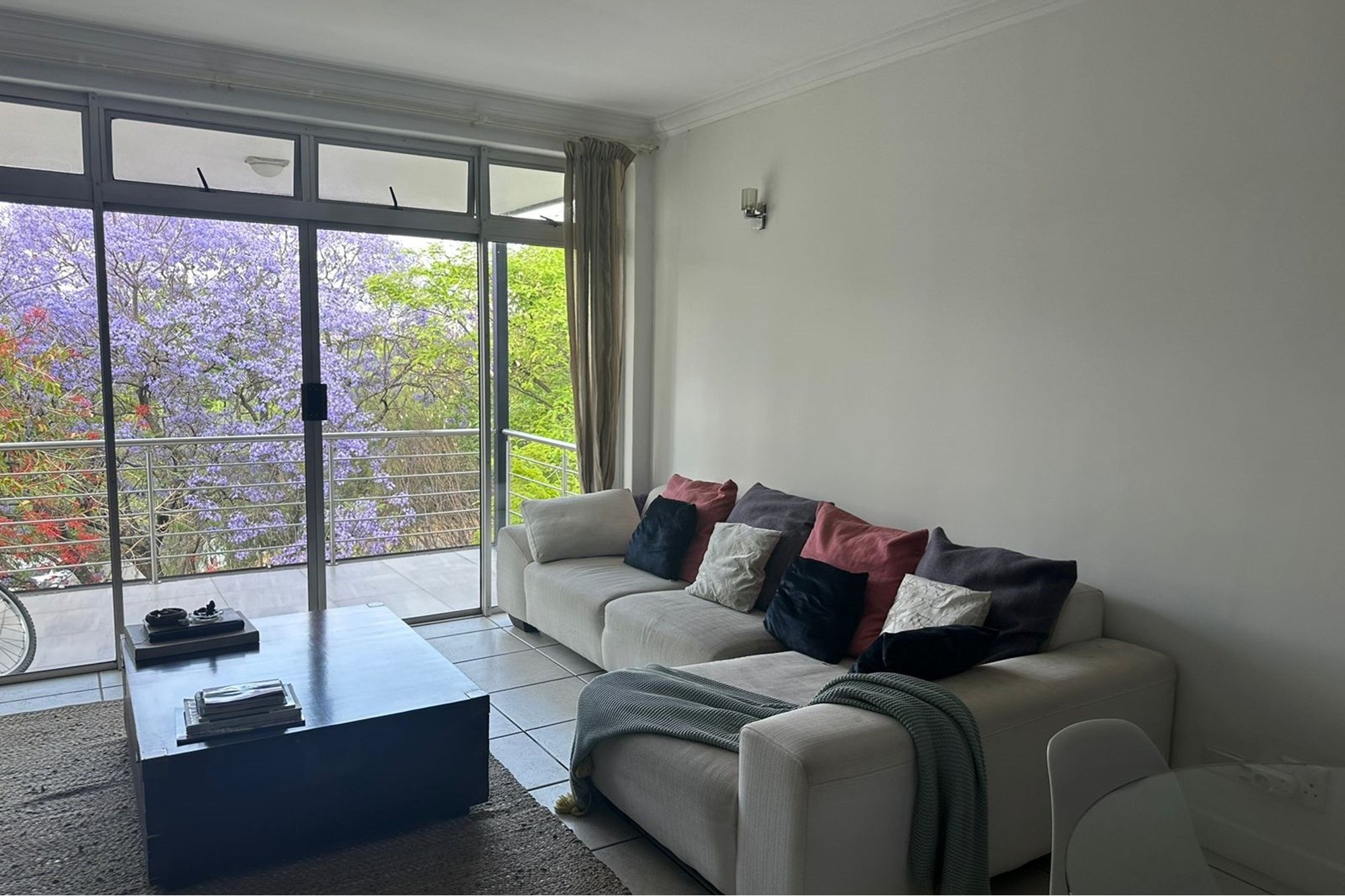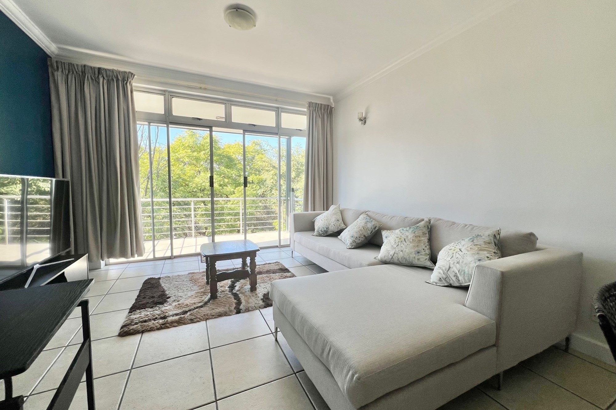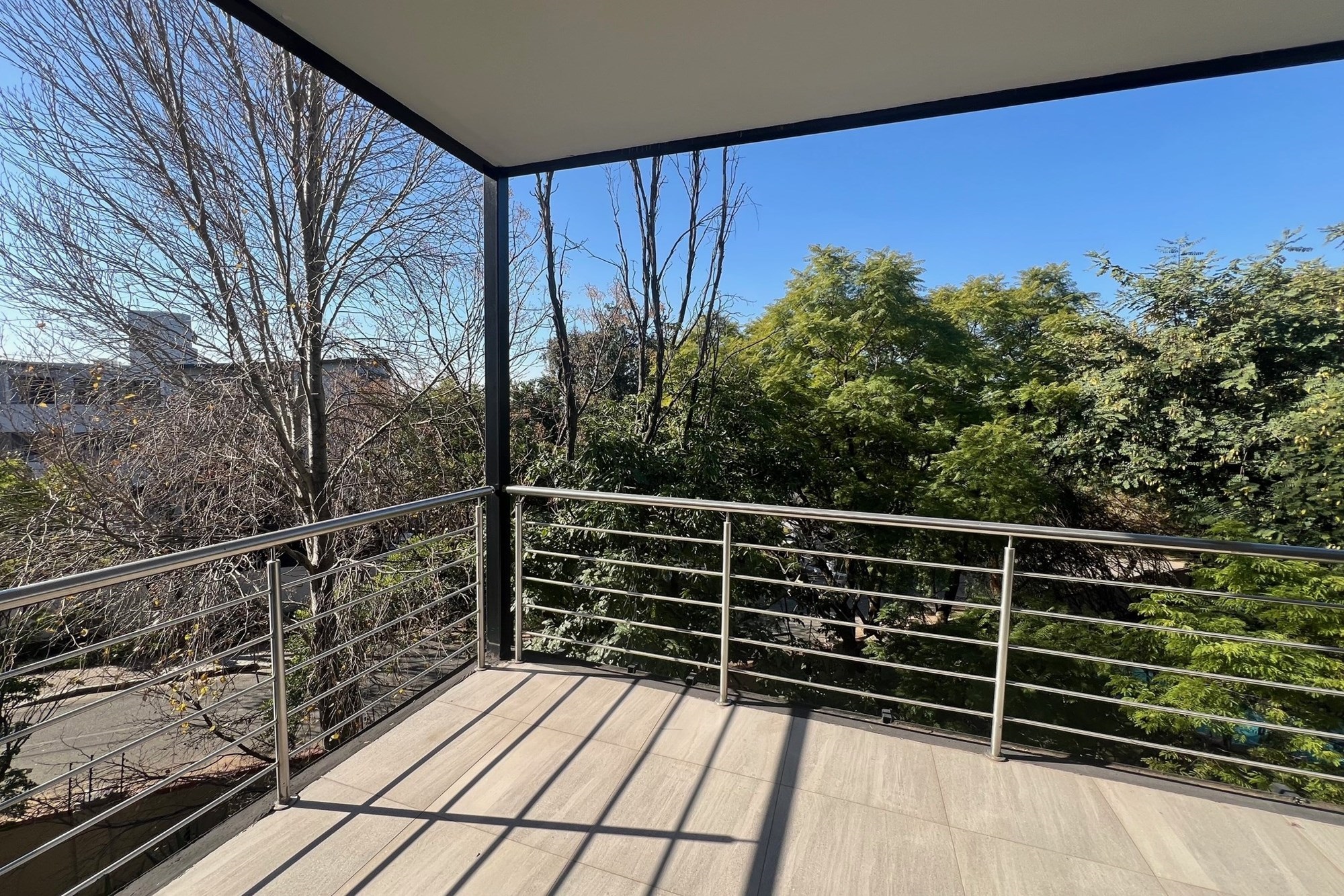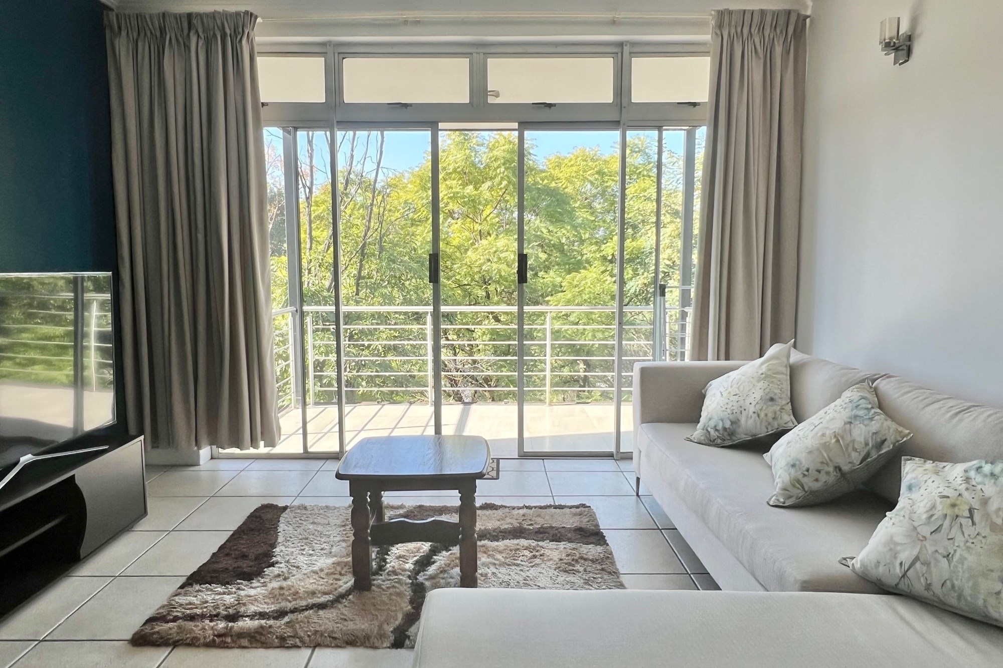 Flooded with natural light, the living area opens up to a generously sized, covered balcony, surrounded by lush treetops and accessed through floor-to-ceiling windows, bringing the outdoors in and creating a serene canopy feel.