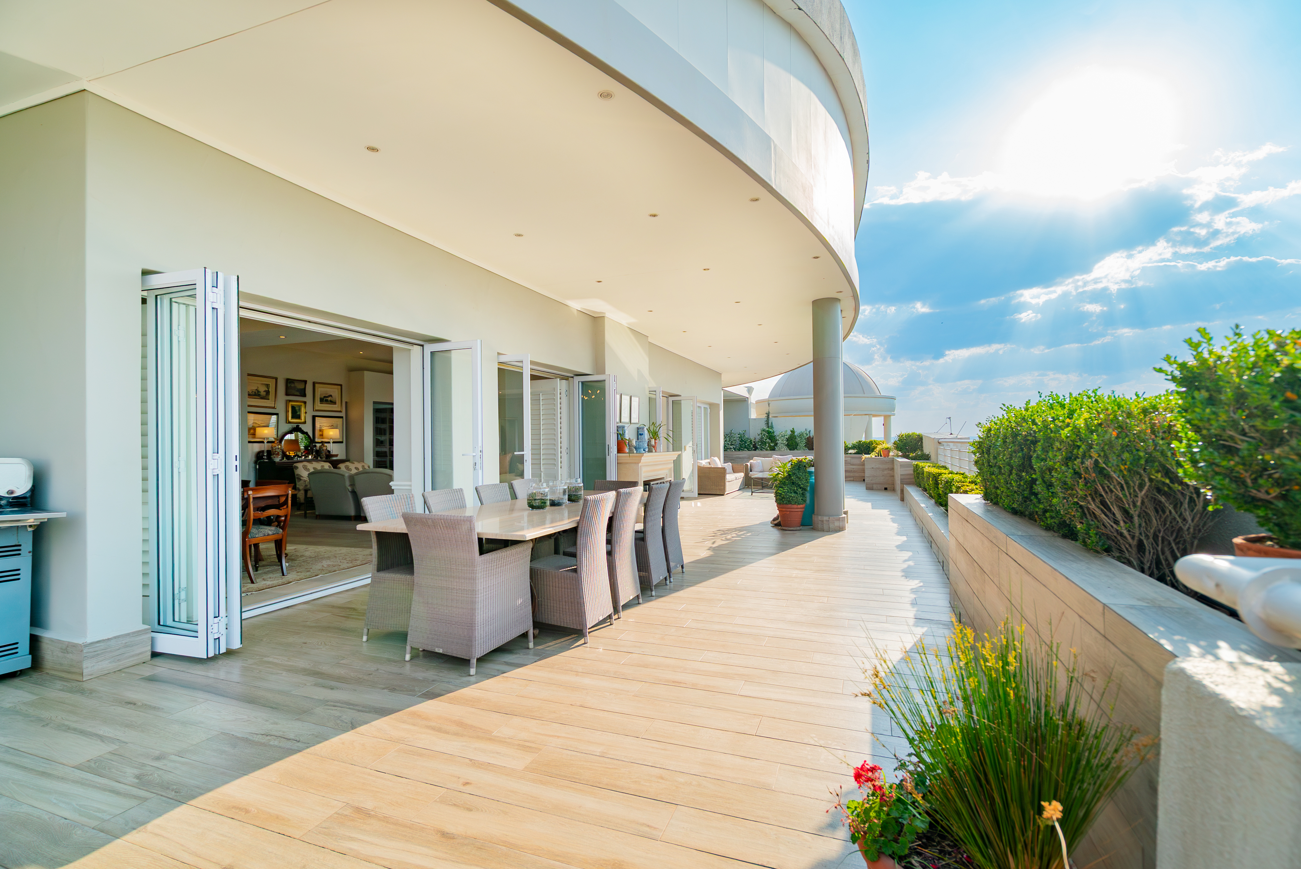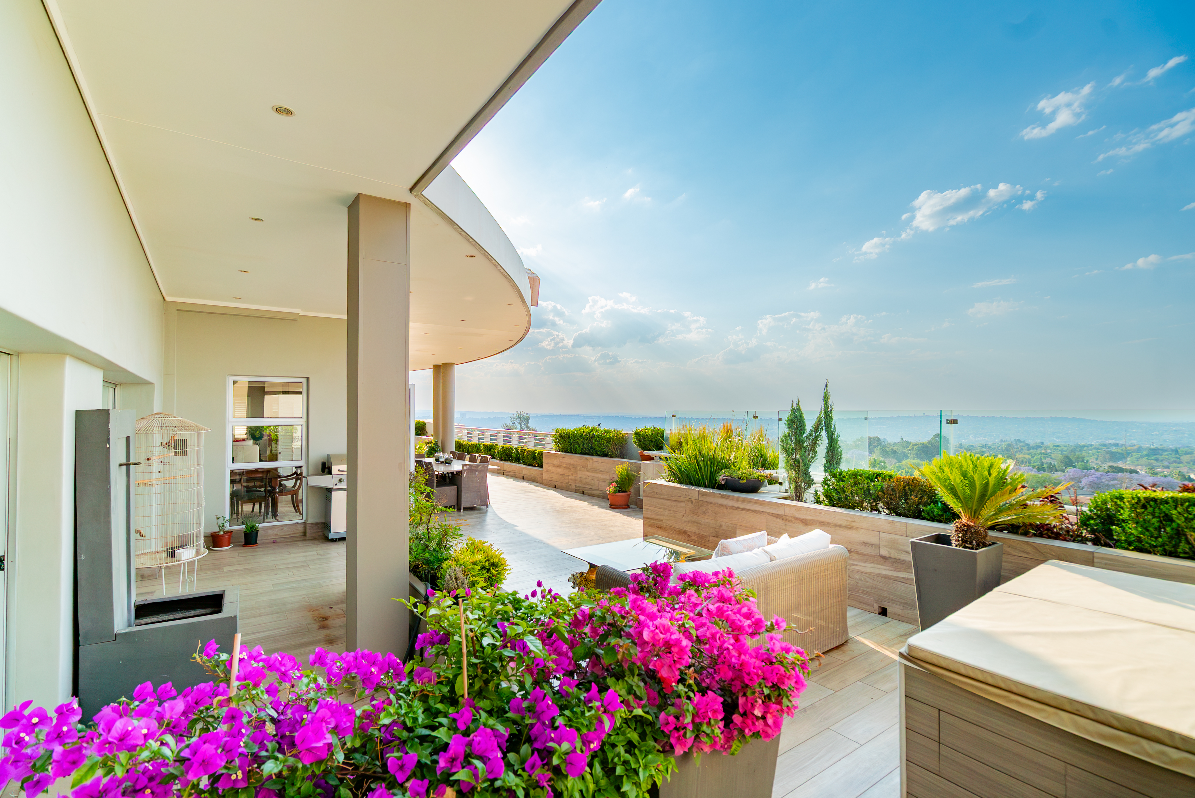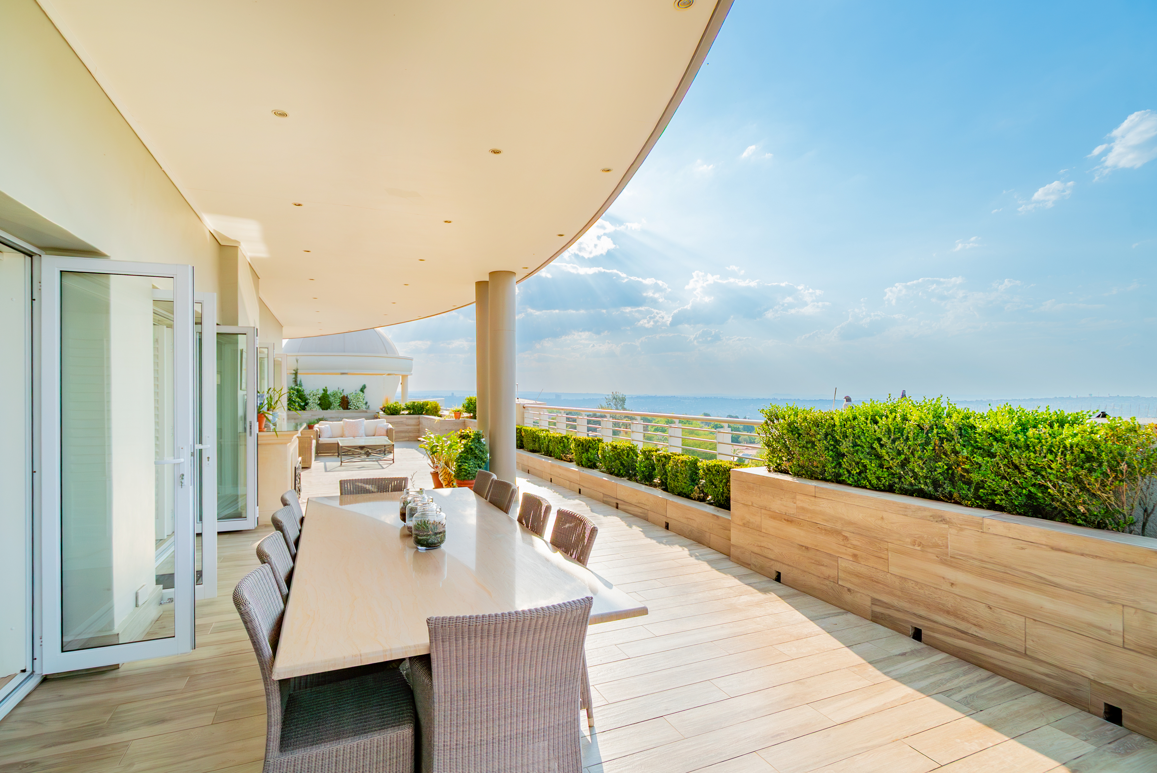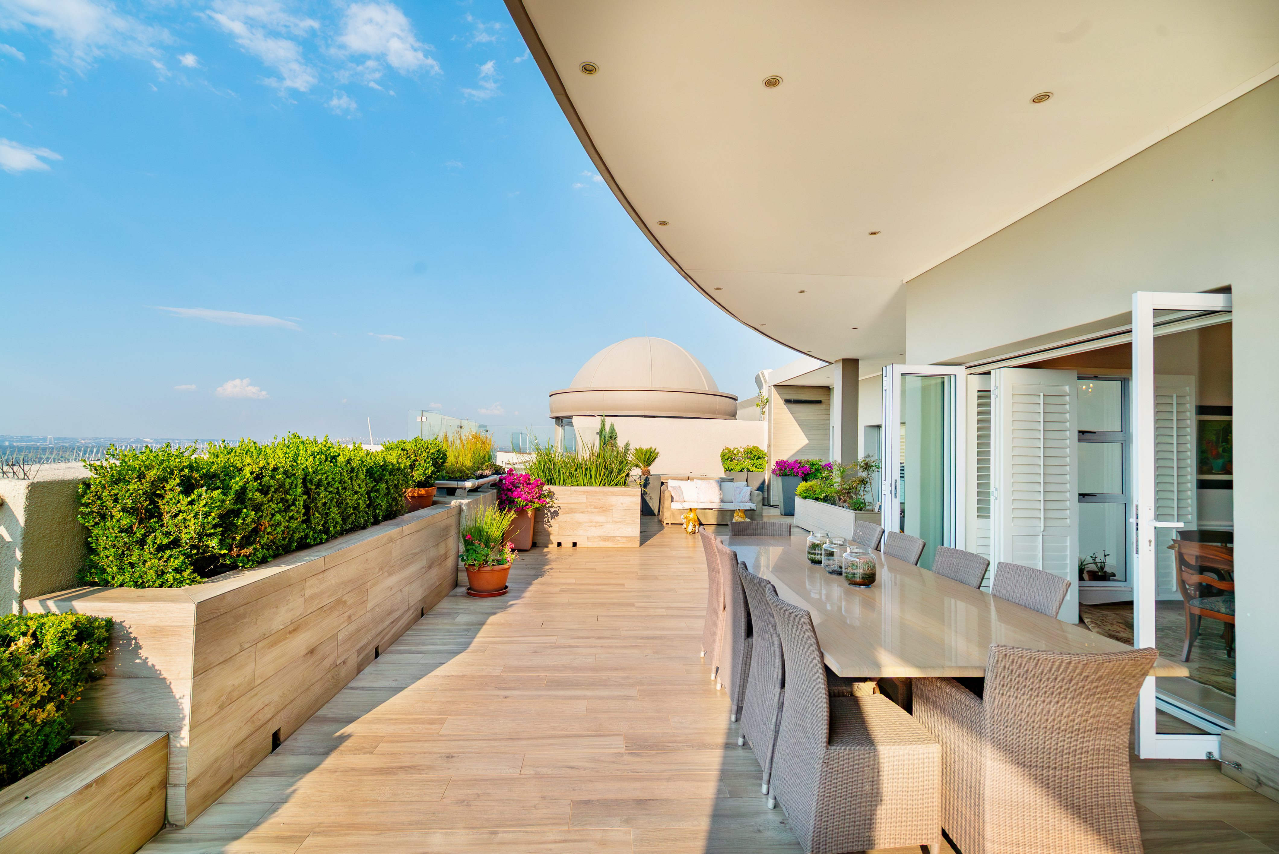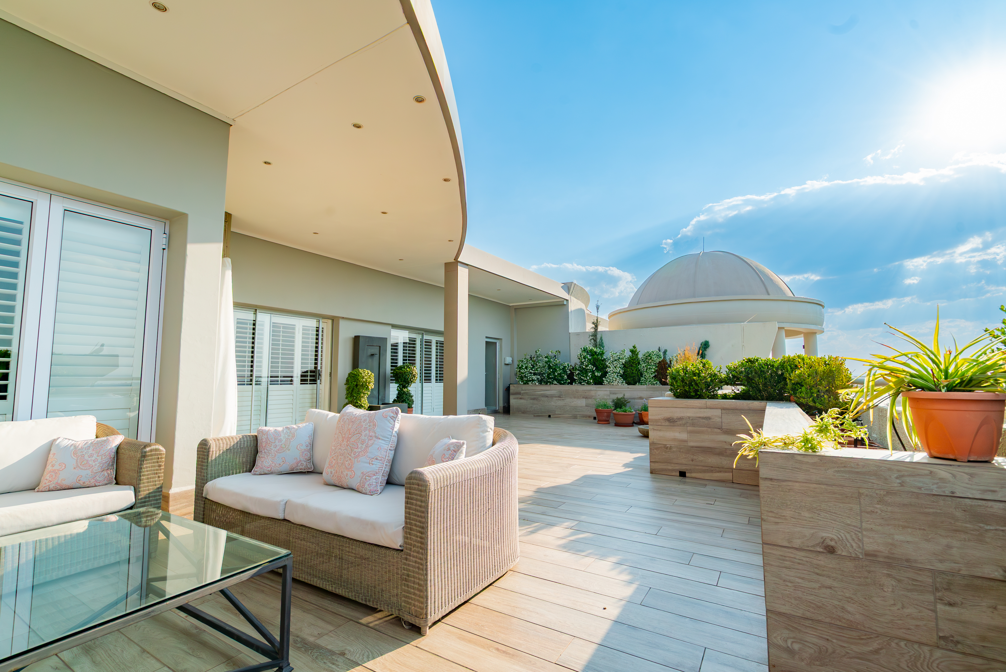 The presidential primary suite is a sanctuary of modern luxury, complete with its own gym room, a luminous walk-in dressing room, and direct access to the terrace. Its spa-inspired marble bathroom features double vanities, a soaking tub, and a glass-enclosed shower. The remaining bedrooms mirror this refined aesthetic with plush carpeting, high ceilings, marble finishes, and underfloor heating for Highveld winter comfort. Outdoors, the terrace becomes an entertainer’s dream, offering undercover dining, a casual lounge, a built-in braai, jacuzzi, and outdoor steam room, perfect for sunset gatherings or relaxed weekend hosting. Additional premium features include smart home technology with integrated air-conditioning and sound system, white Californian shutters, 8kVA inverter with battery backup, generator, JoJo water tanks, secure vault, undercover parking for four cars, three staff rooms combined into one large suite, and access to the complex’s indoor pool plus 24-hour manned security. This penthouse is not simply a residence; it is a statement—where luxury, innovation, and exclusivity converge at the highest level of urban living.