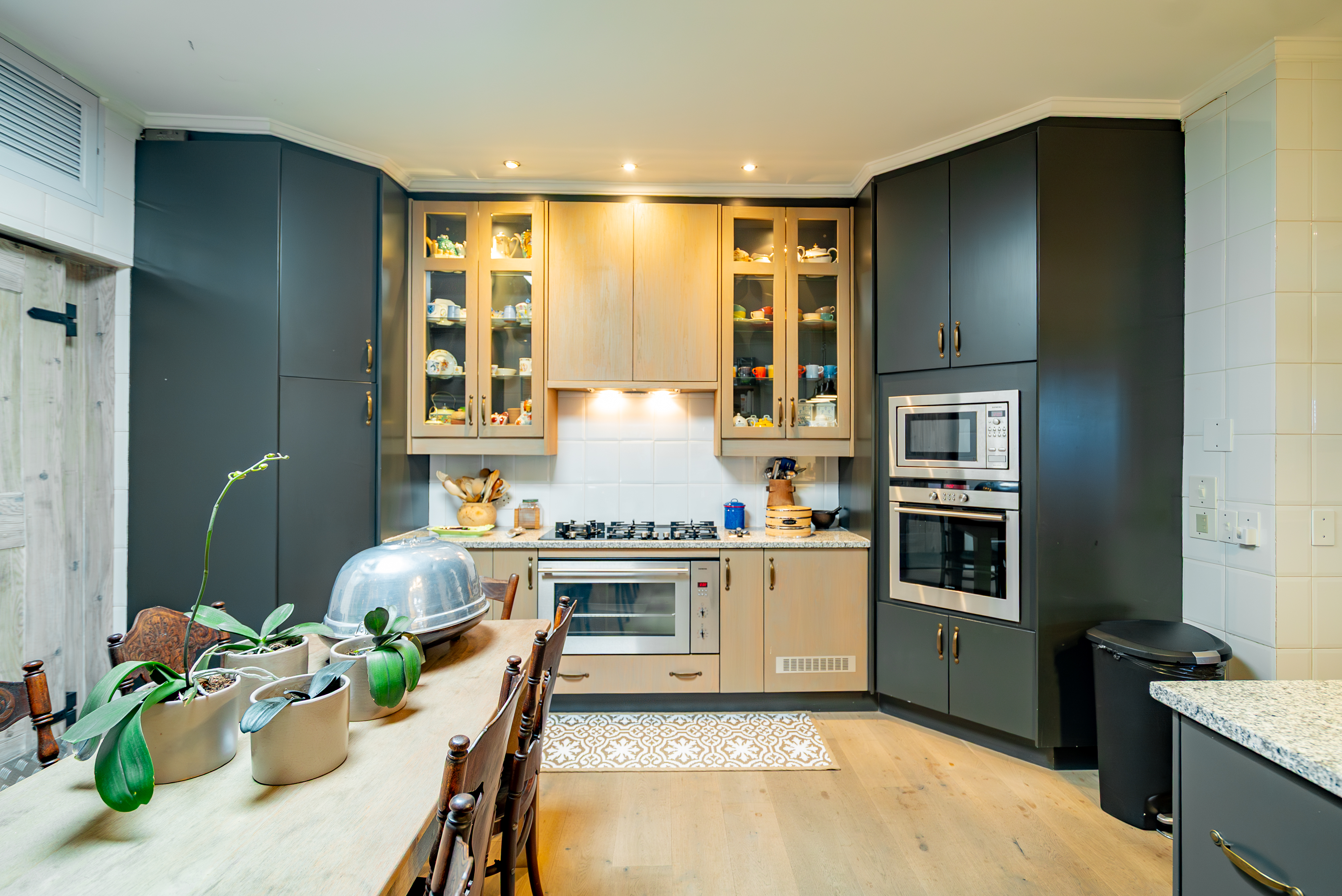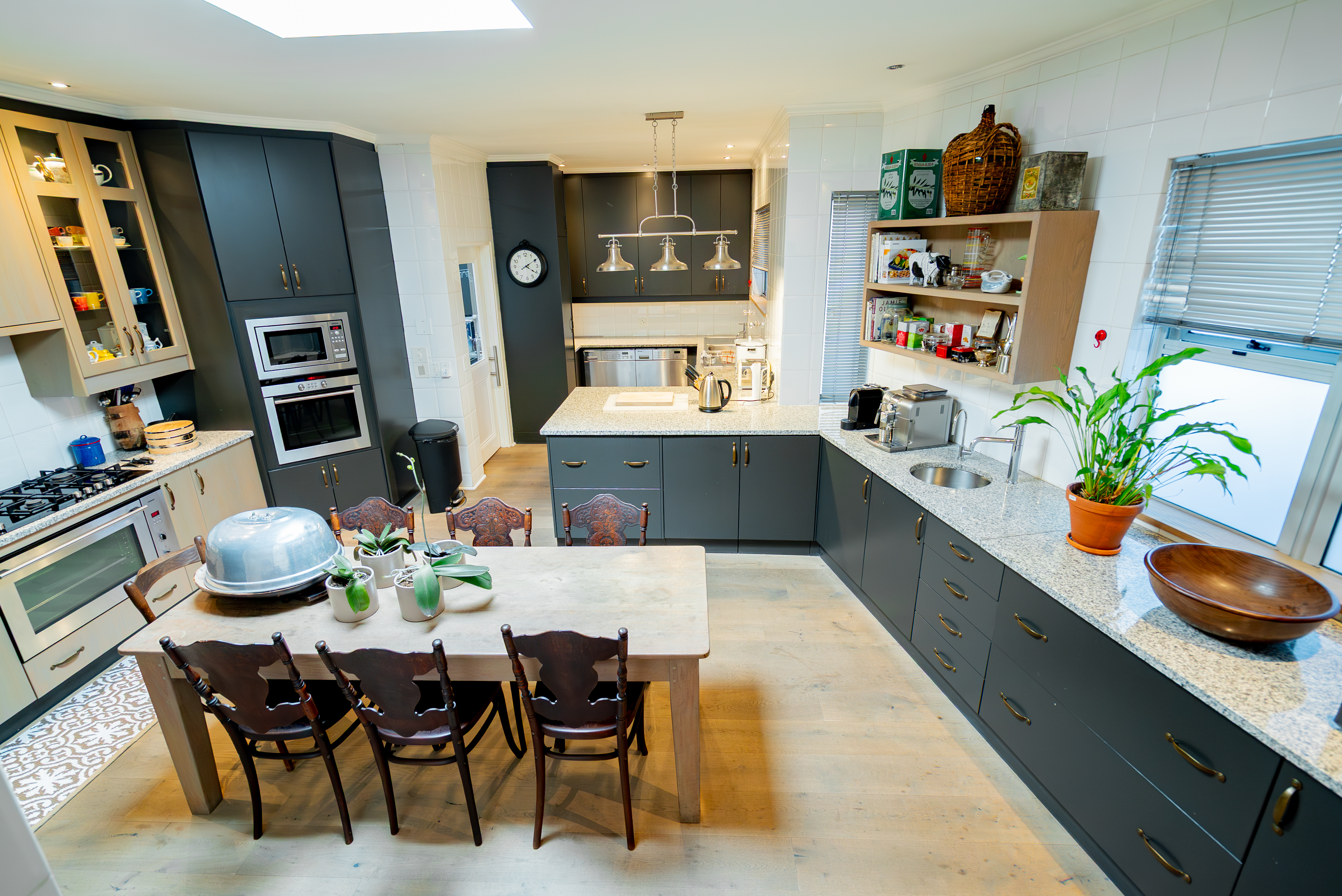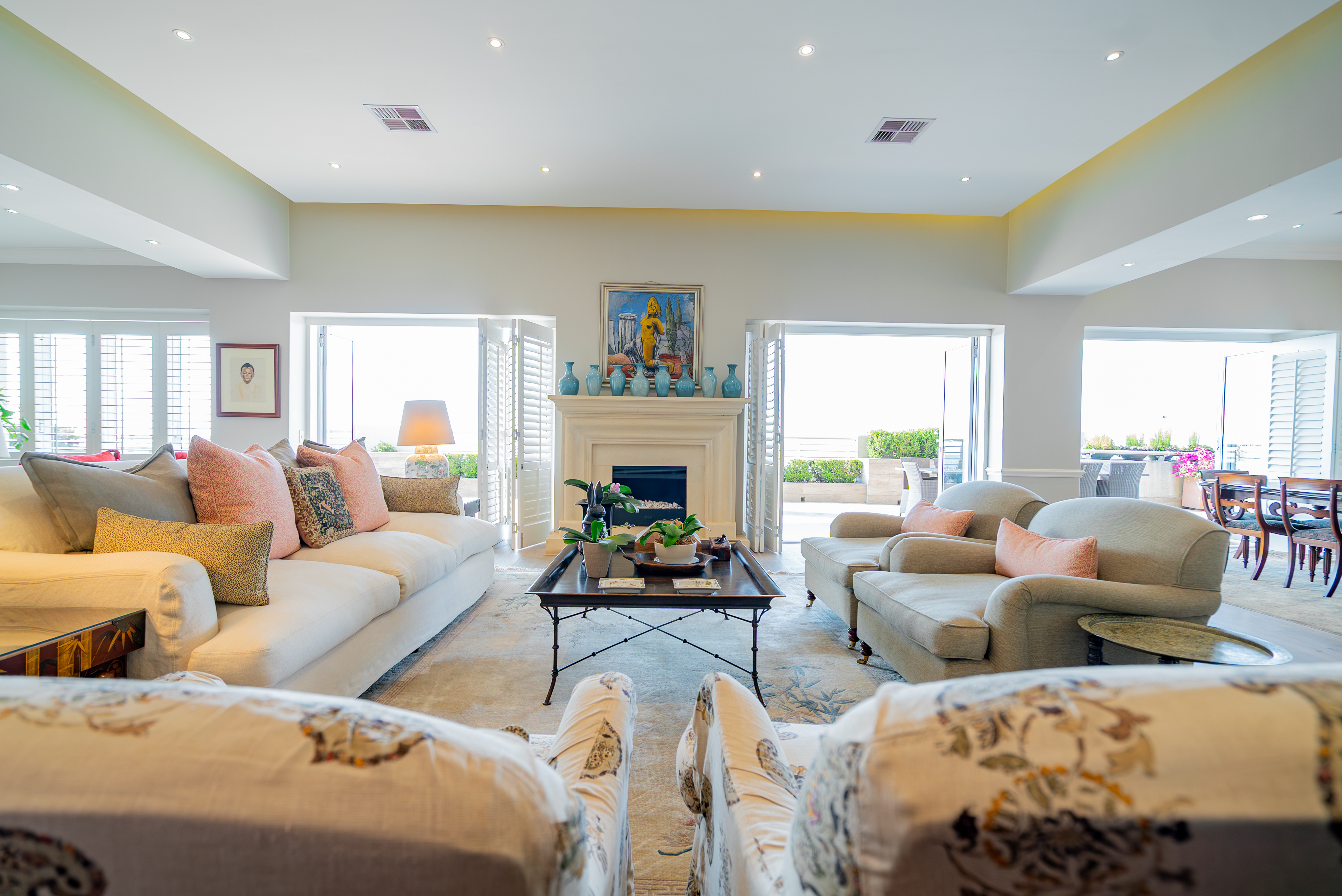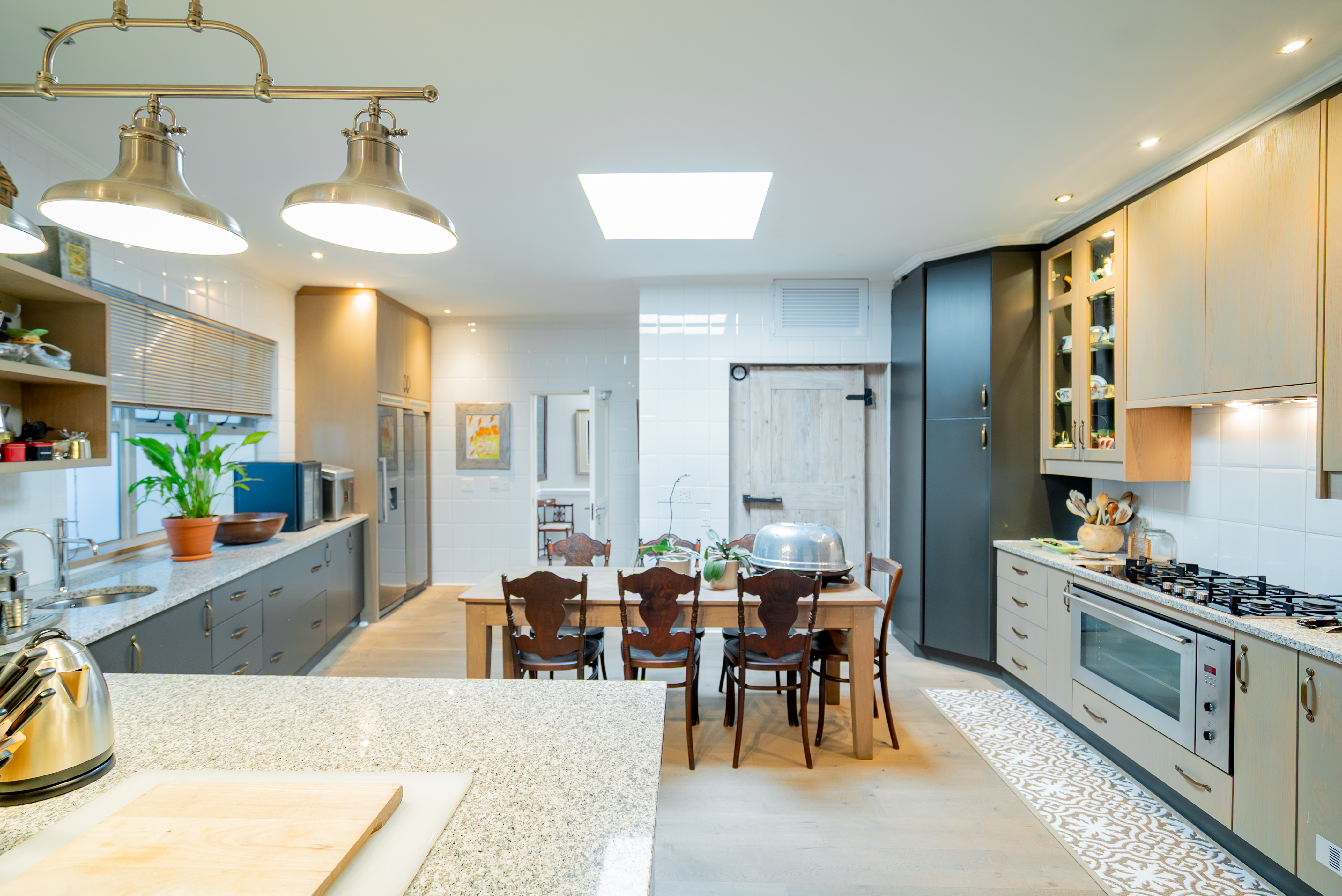 Lofty ceilings, deluxe wooden flooring, skylights, and panoramic 180° views frame an expansive layout that includes three luxurious entertainment rooms: a formal lounge with a towering gas fireplace, a TV room, and a 12-seater dining space. Floor-to-ceiling glass stacker doors fold open to reveal a full-length terrace, creating seamless indoor–outdoor flow. The chef’s kitchen is a state-of-the-art masterpiece, featuring custom cabinetry, Siemens integrated appliances (including gas hob, two ovens, and microwave), granite countertops, a walk-in cold room, wine cellar with double-volume cascading racks, and a generous scullery area. A tranquil study nook and private reading zone lead to one of the three en-suite bedrooms, each positioned in separate zones of the home to ensure absolute privacy and comfort.