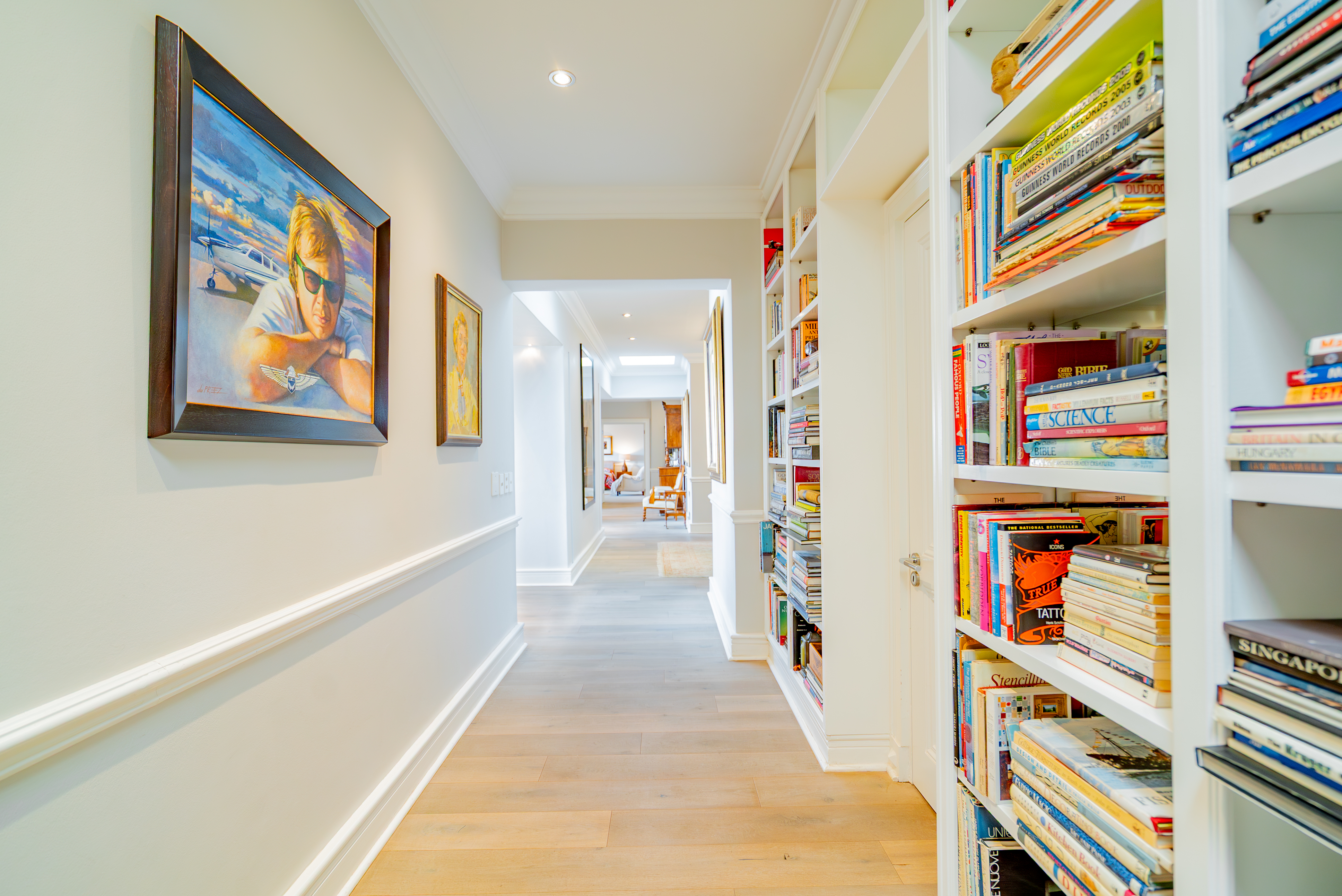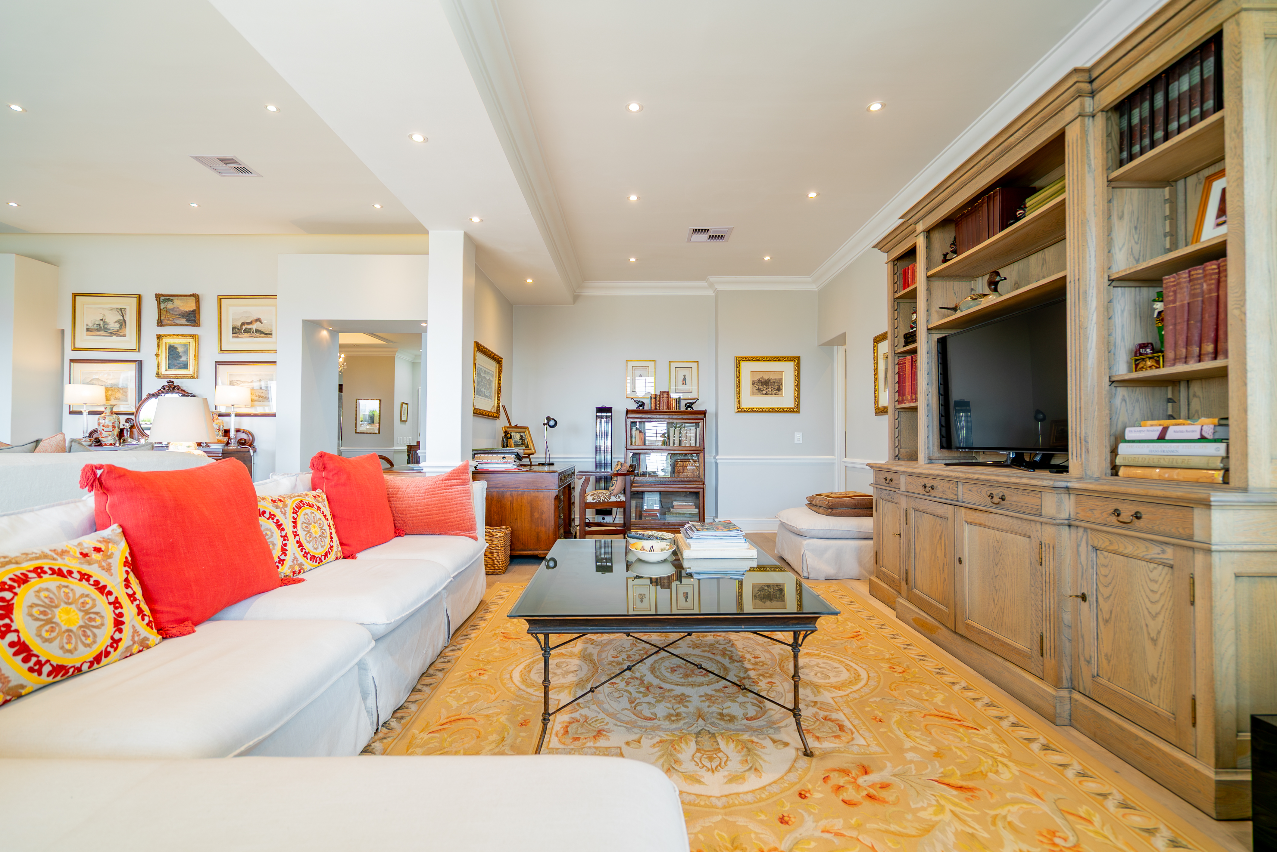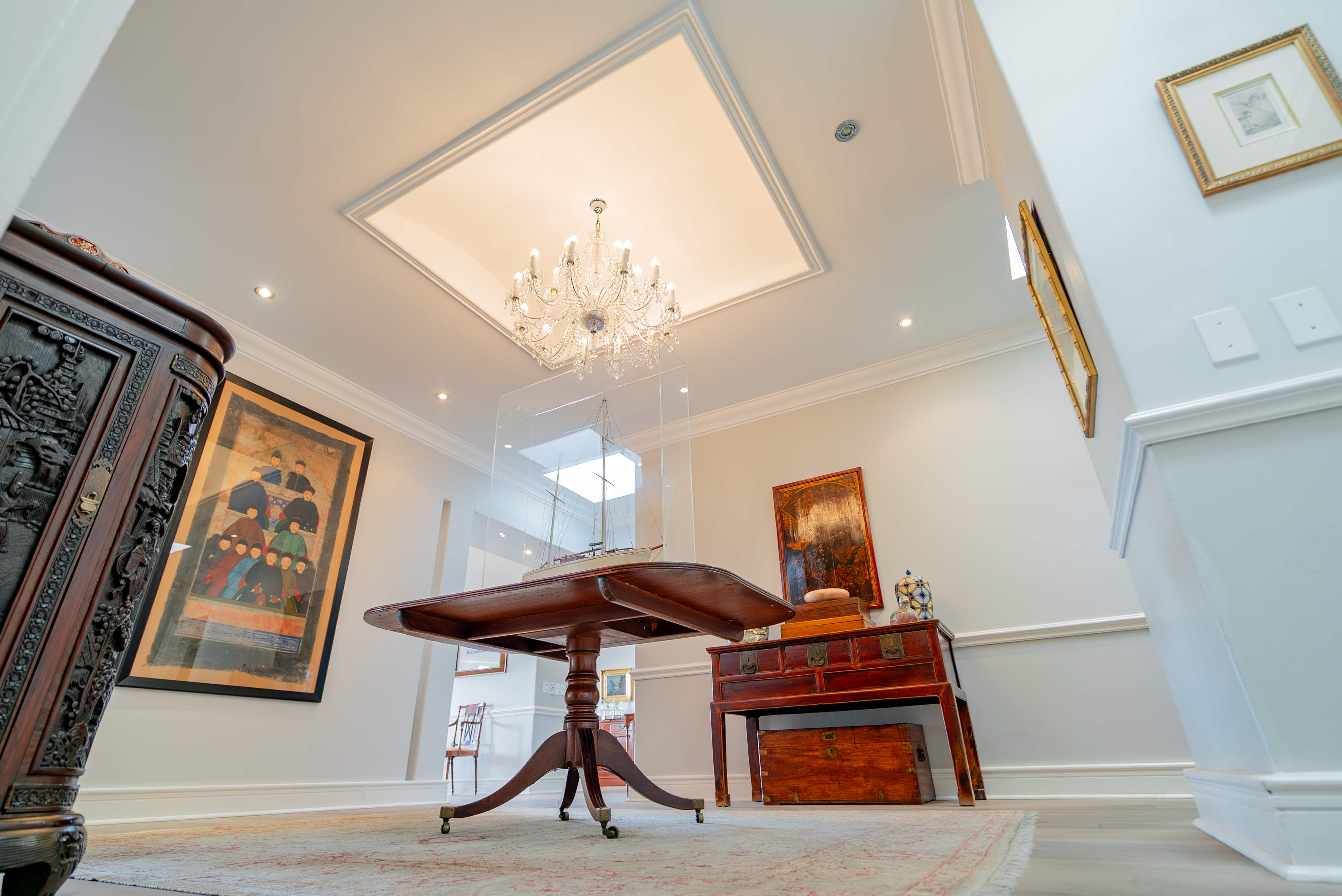 Lofty ceilings, deluxe wooden flooring, skylights, and panoramic 180° views frame an expansive layout that includes three luxurious entertainment rooms: a formal lounge with a towering gas fireplace, a TV room, and a 12-seater dining space. Floor-to-ceiling glass stacker doors fold open to reveal a full-length terrace, creating seamless indoor–outdoor flow. The chef’s kitchen is a state-of-the-art masterpiece, featuring custom cabinetry, Siemens integrated appliances (including gas hob, two ovens, and microwave), granite countertops, a walk-in cold room, wine cellar with double-volume cascading racks, and a generous scullery area. A tranquil study nook and private reading zone lead to one of the three en-suite bedrooms, each positioned in separate zones of the home to ensure absolute privacy and comfort.