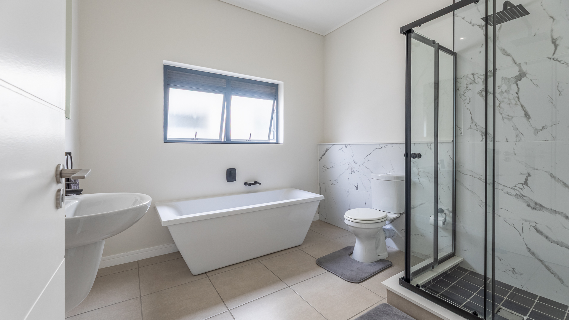 The main bedroom boasts a sleek en-suite bathroom, while the second bathroom includes both a bath and a shower. All bedrooms feature built-in cupboards. Two allocated parking bays are included for added convenience.