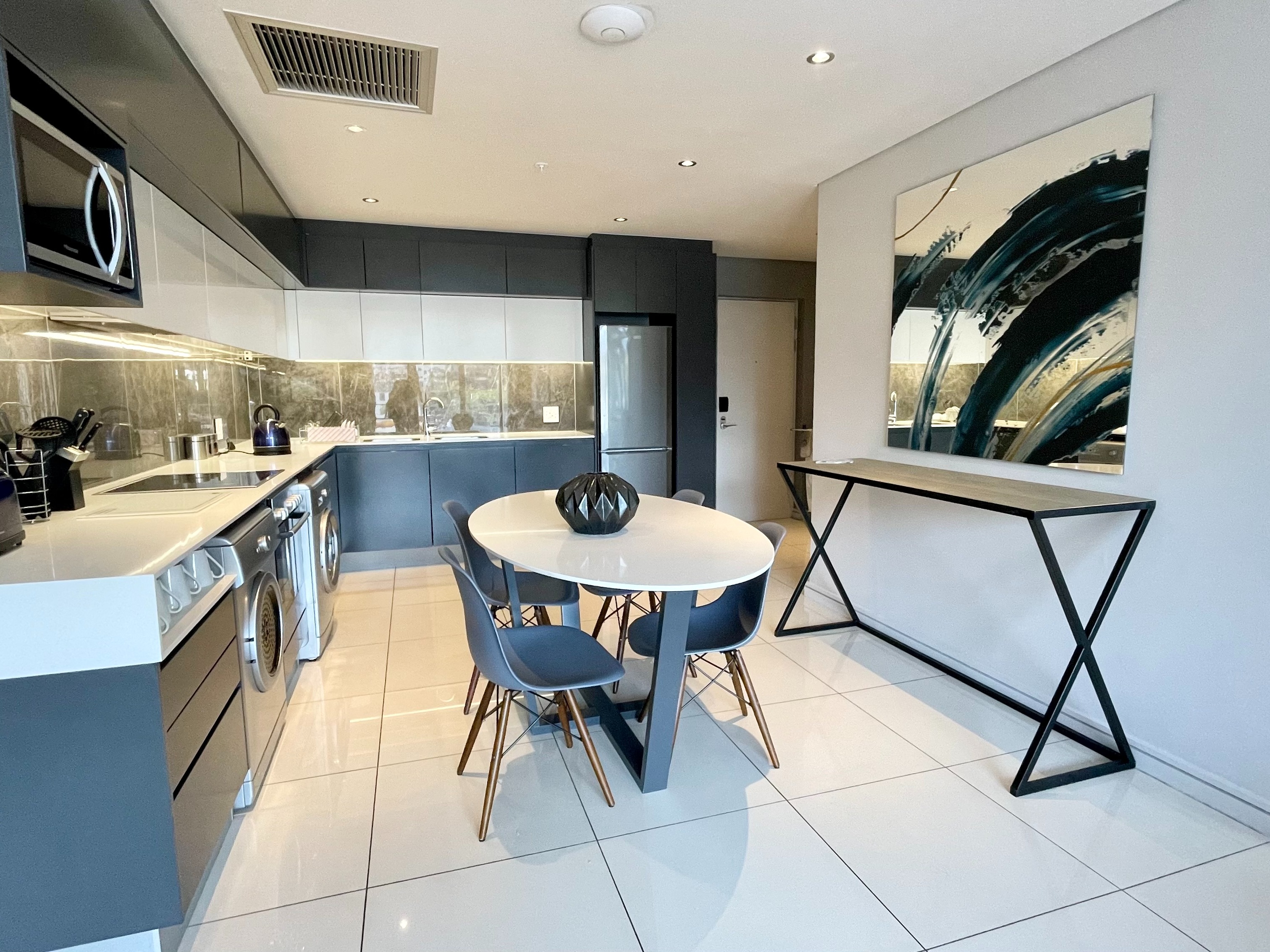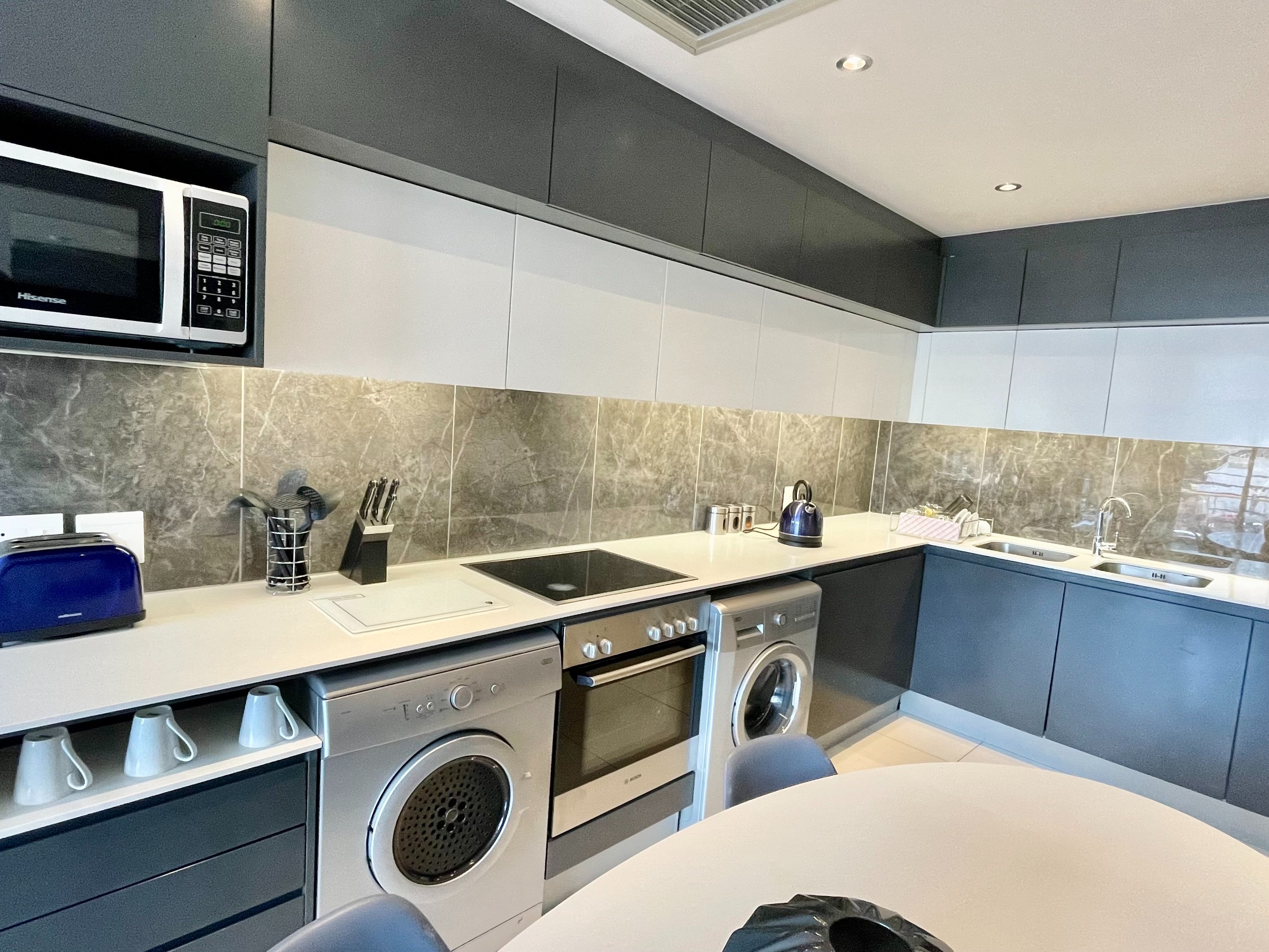-This apartment consists of a kitchen with a wonderful granite top finish with extractor and appliance space, oven, and basin.
