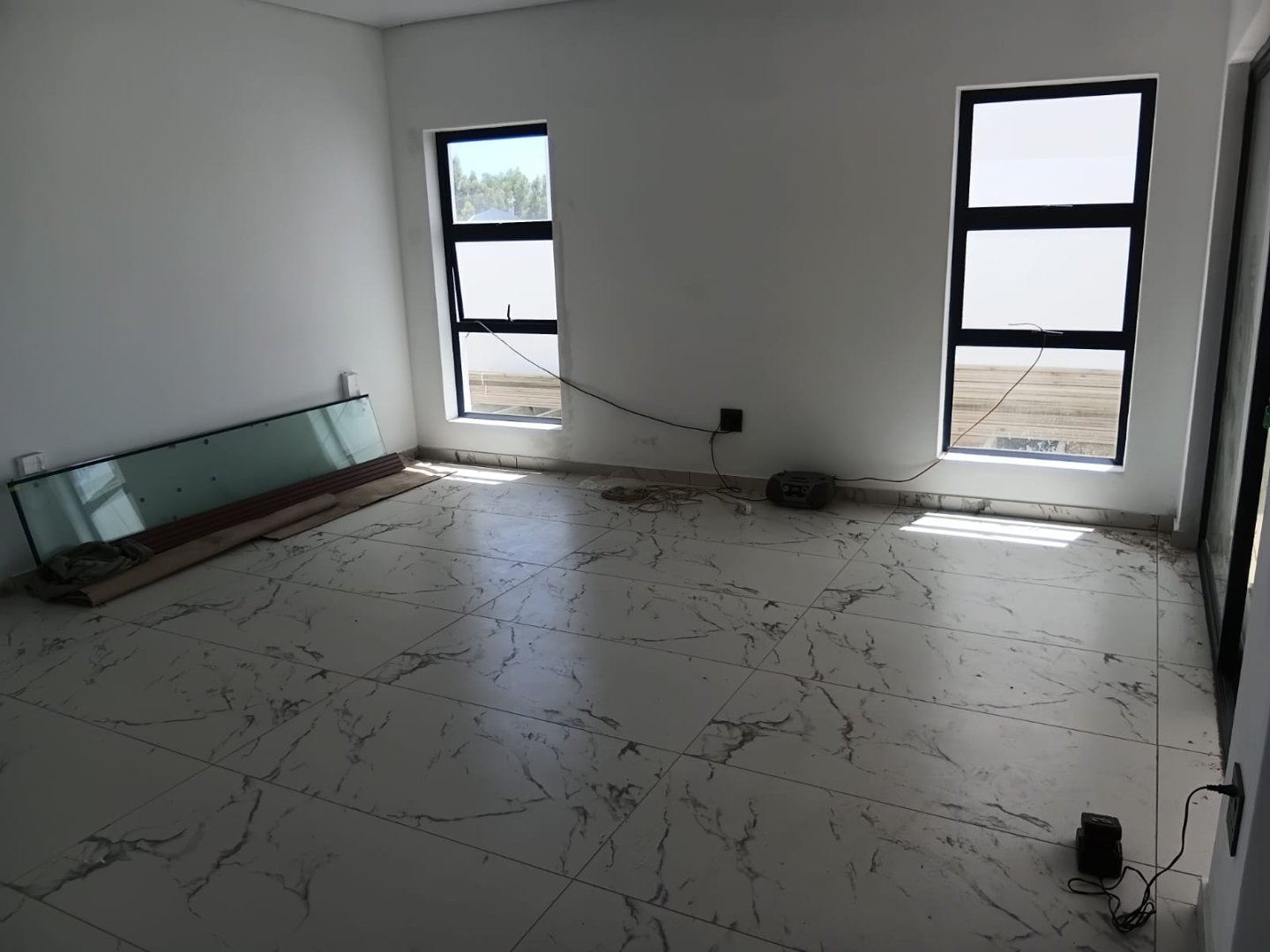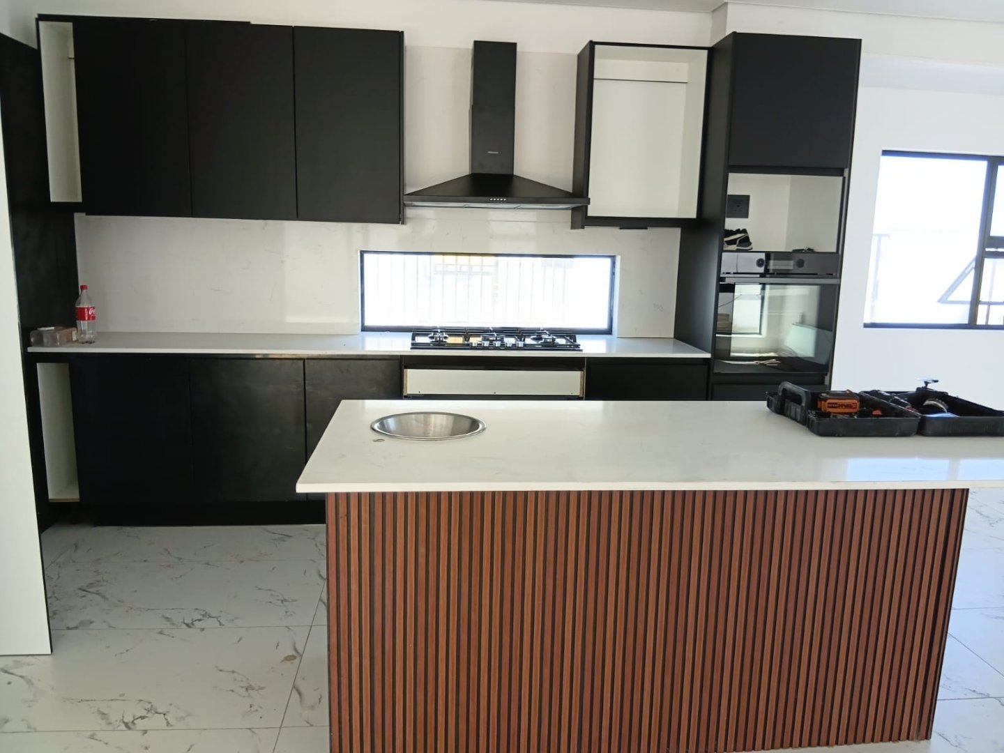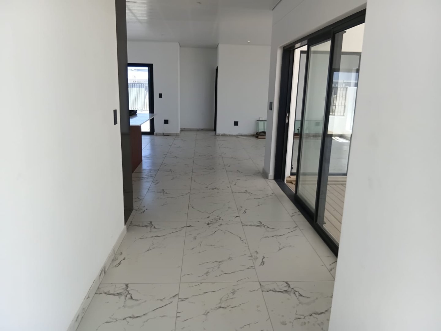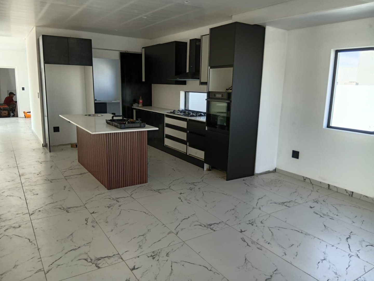 The expansive open-plan living area is defined by clean lines, premium finishes, and abundant natural light. The bespoke kitchen, complete with a separate scullery, seamlessly connects to the dining and lounge spaces — opening onto a covered entertainment terrace with a built-in braai and sparkling swimming pool.