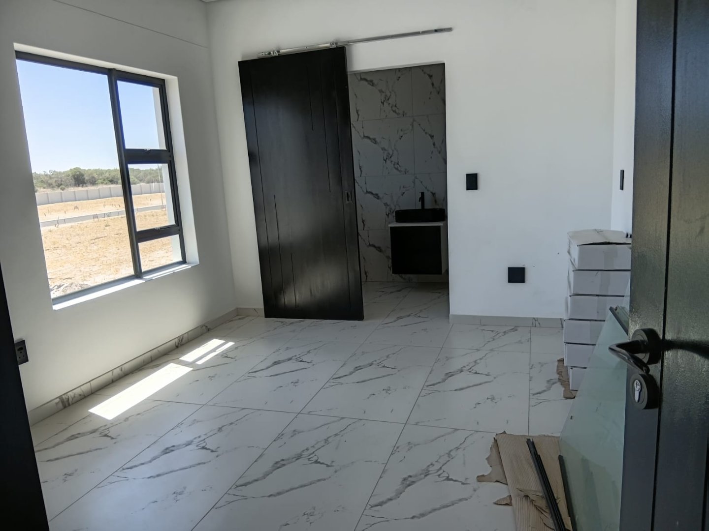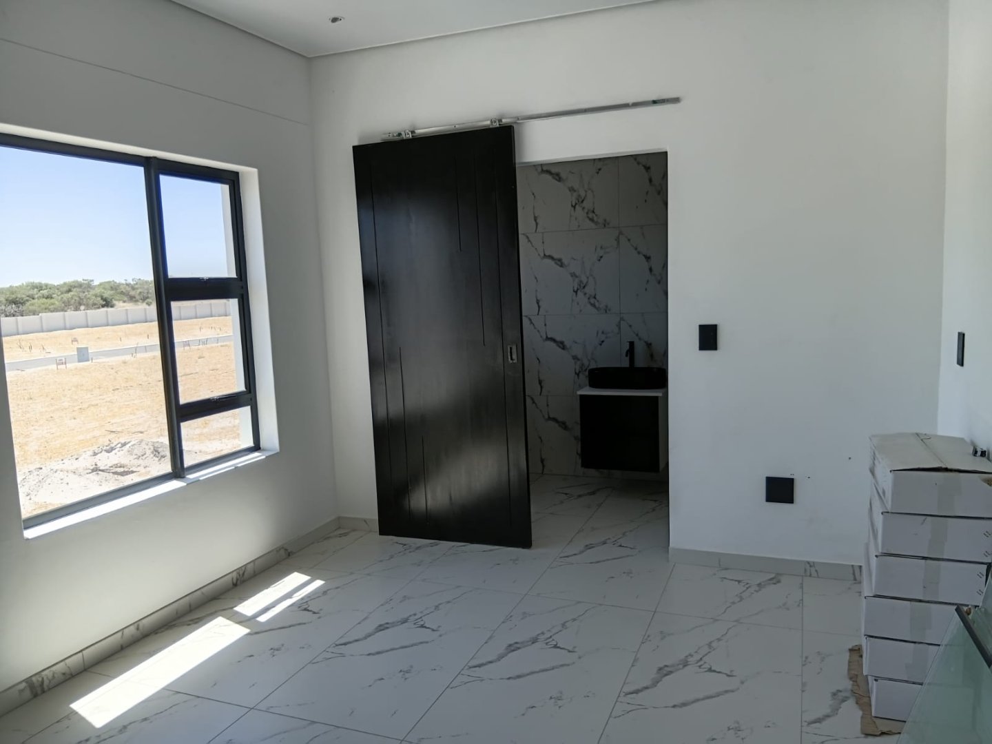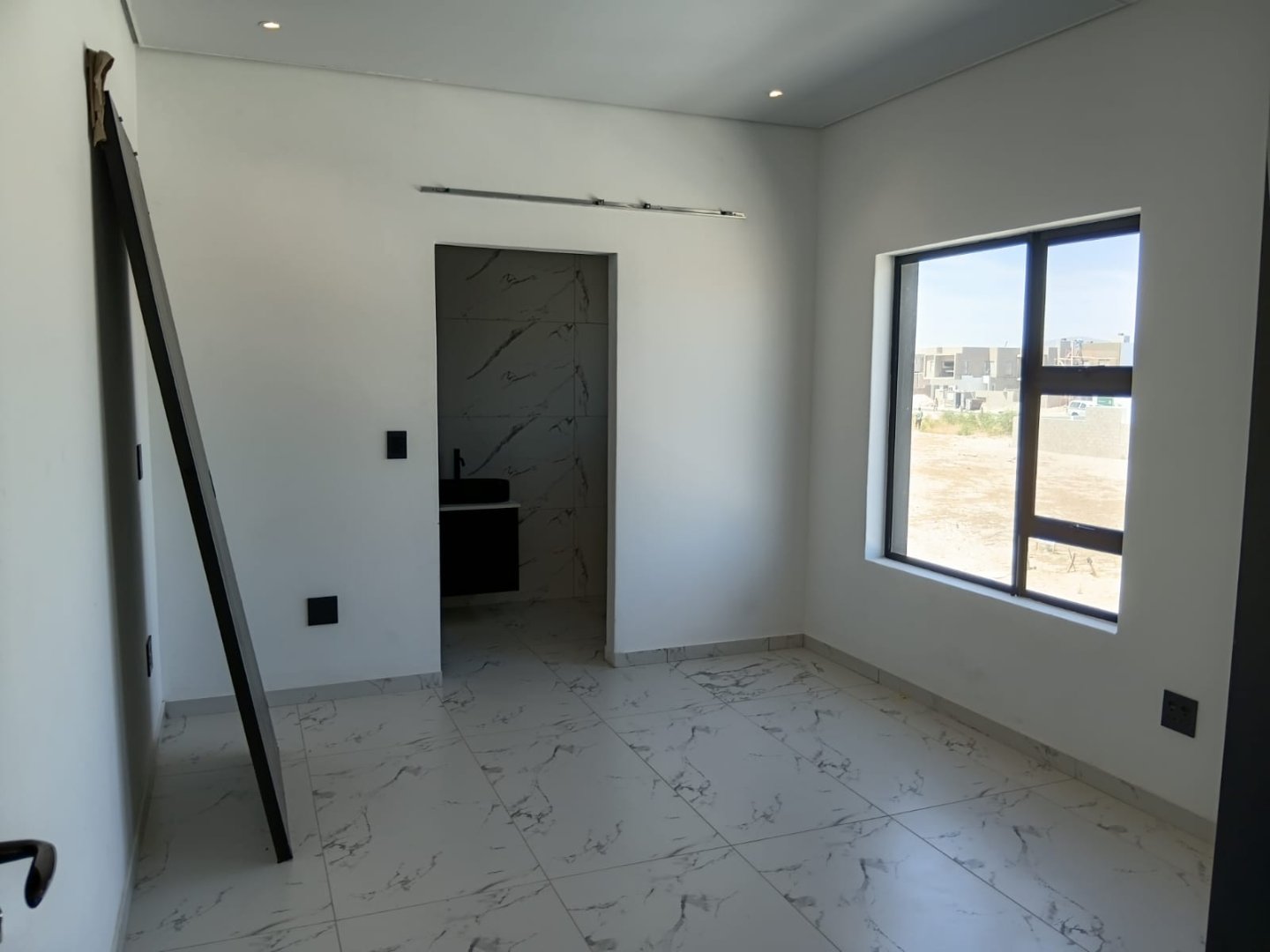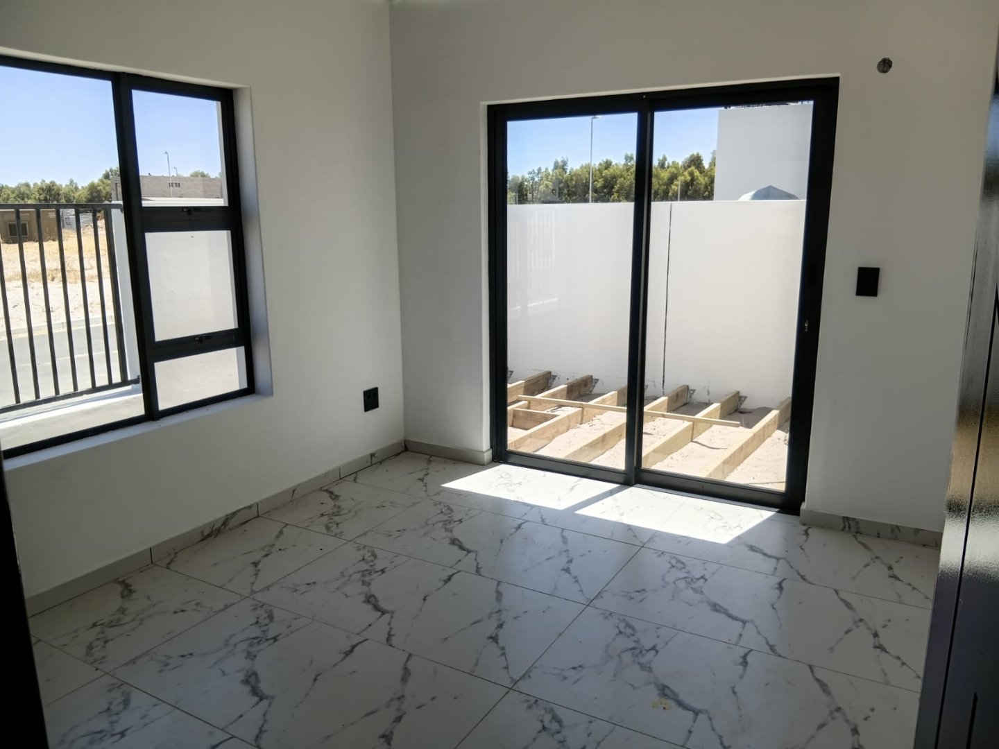 The expansive open-plan living area is defined by clean lines, premium finishes, and abundant natural light. The bespoke kitchen, complete with a separate scullery, seamlessly connects to the dining and lounge spaces — opening onto a covered entertainment terrace with a built-in braai and sparkling swimming pool.