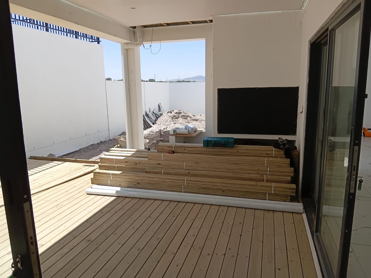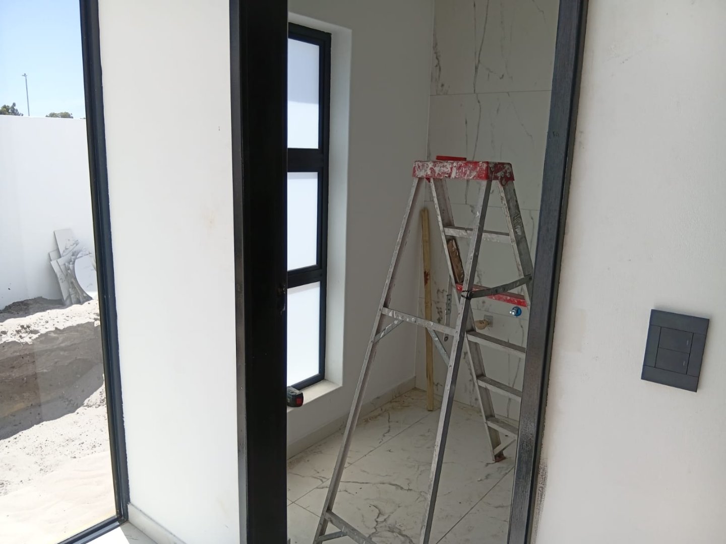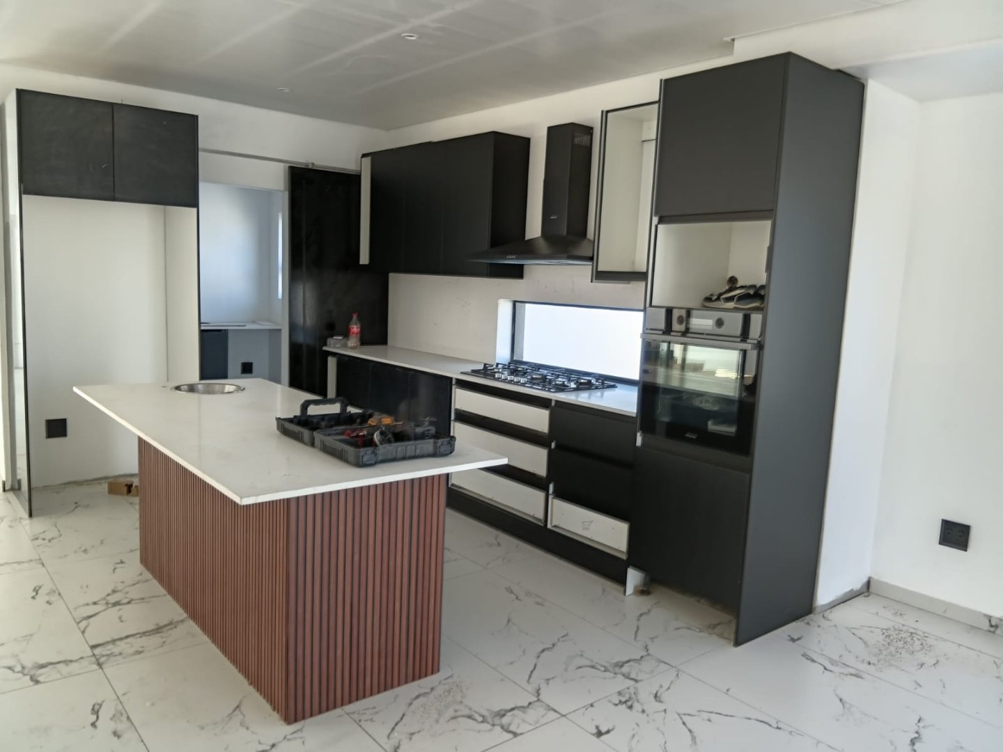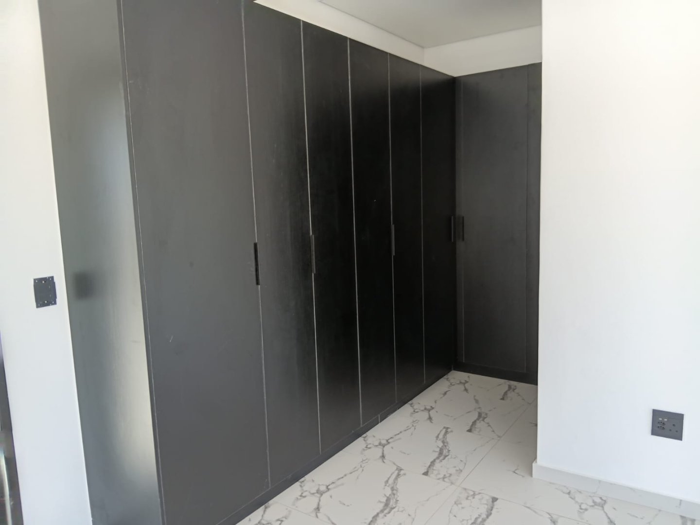 The expansive open-plan living area is defined by clean lines, premium finishes, and abundant natural light. The bespoke kitchen, complete with a separate scullery, seamlessly connects to the dining and lounge spaces — opening onto a covered entertainment terrace with a built-in braai and sparkling swimming pool.
