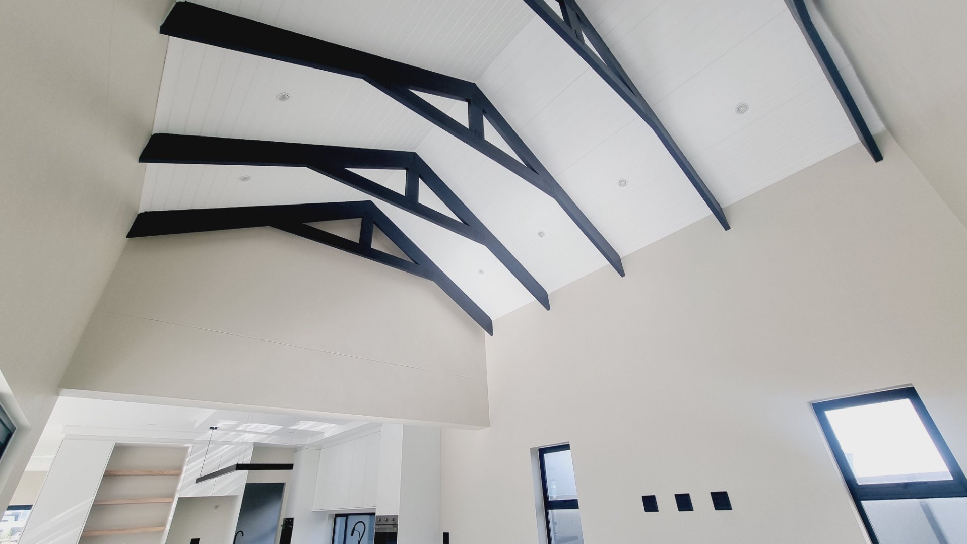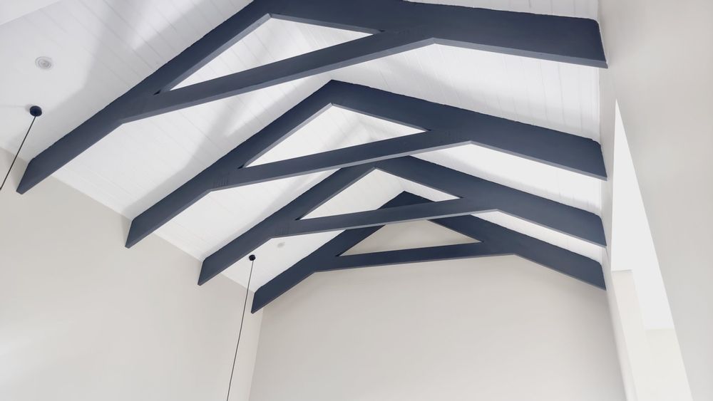 Exposed beams create dramatic volume and architectural interest, adding warmth and texture