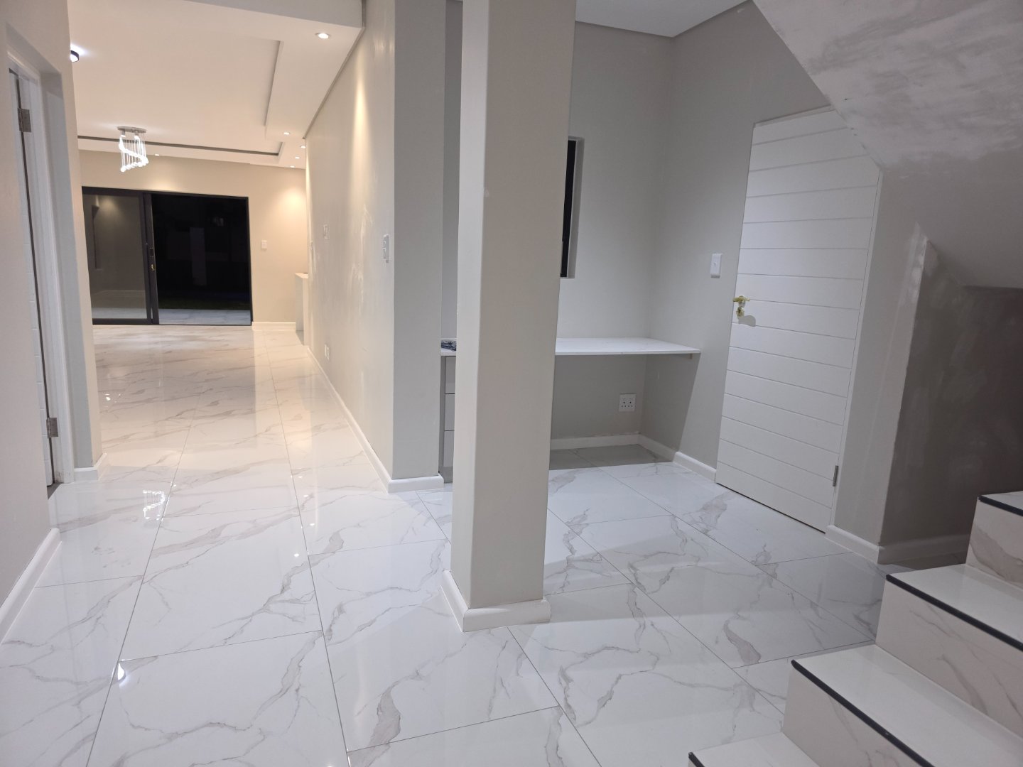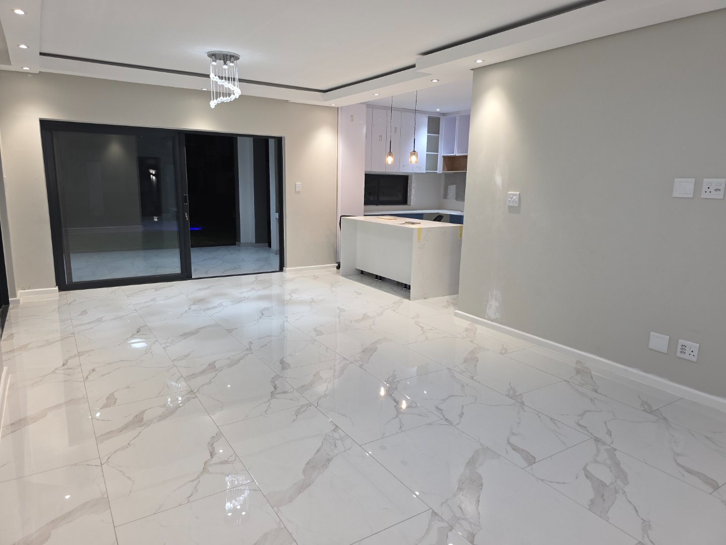 Double-volume living spaces designed for natural light and finished in sleek tiles throughout. The open-plan layout flows effortlessly through oversized sliding doors to your private outdoor sanctuary. A sophisticated neutral palette with pops of personality - the showpiece kitchen features crisp white cabinetry with teal-blue accents, marble-effect splashbacks, and integrated appliances that make entertaining look easy.