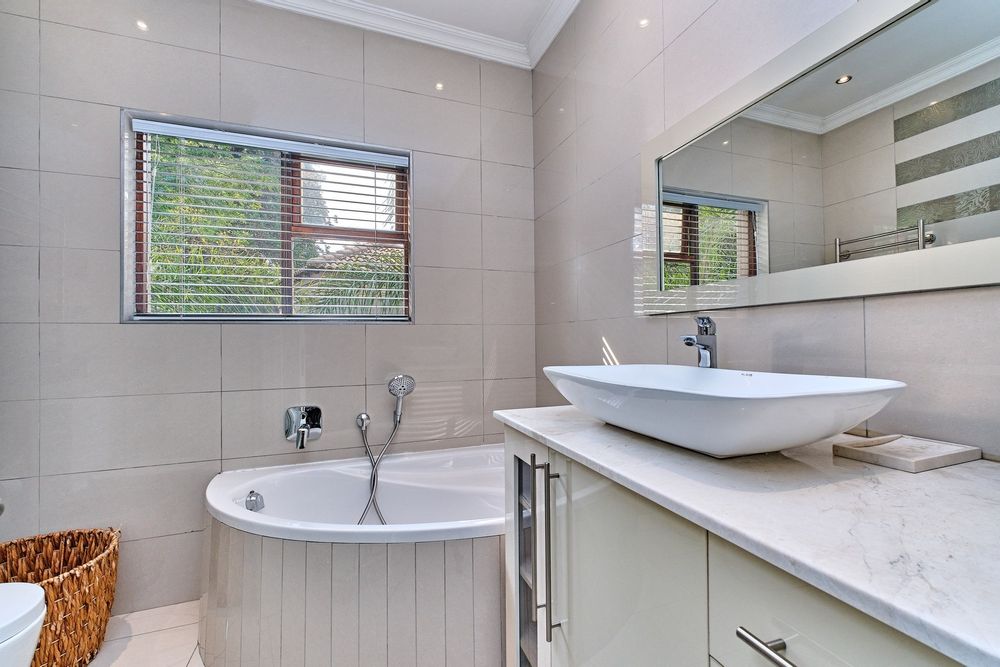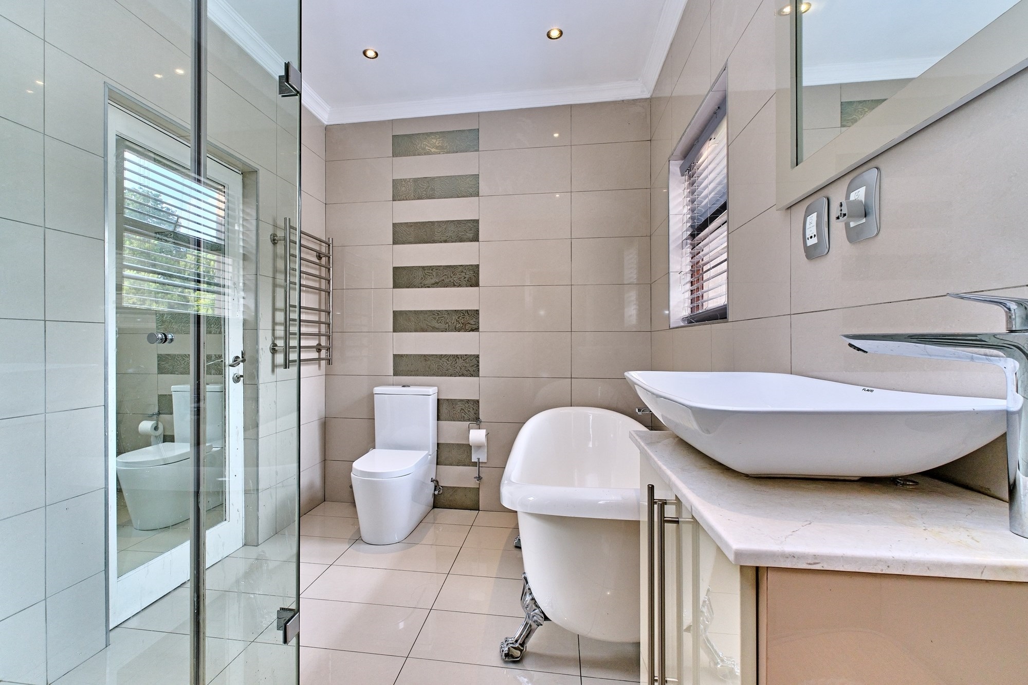 The upper level has a spacious skylit family room, 5 bedrooms and 3 bathrooms all with heated towel rails (2 en suite). The main bedroom boasts a large full bathroom with Jacuzzi bath, dressing room and patio with braai. There is a staircase from the patio that takes you to the pool and garden area.