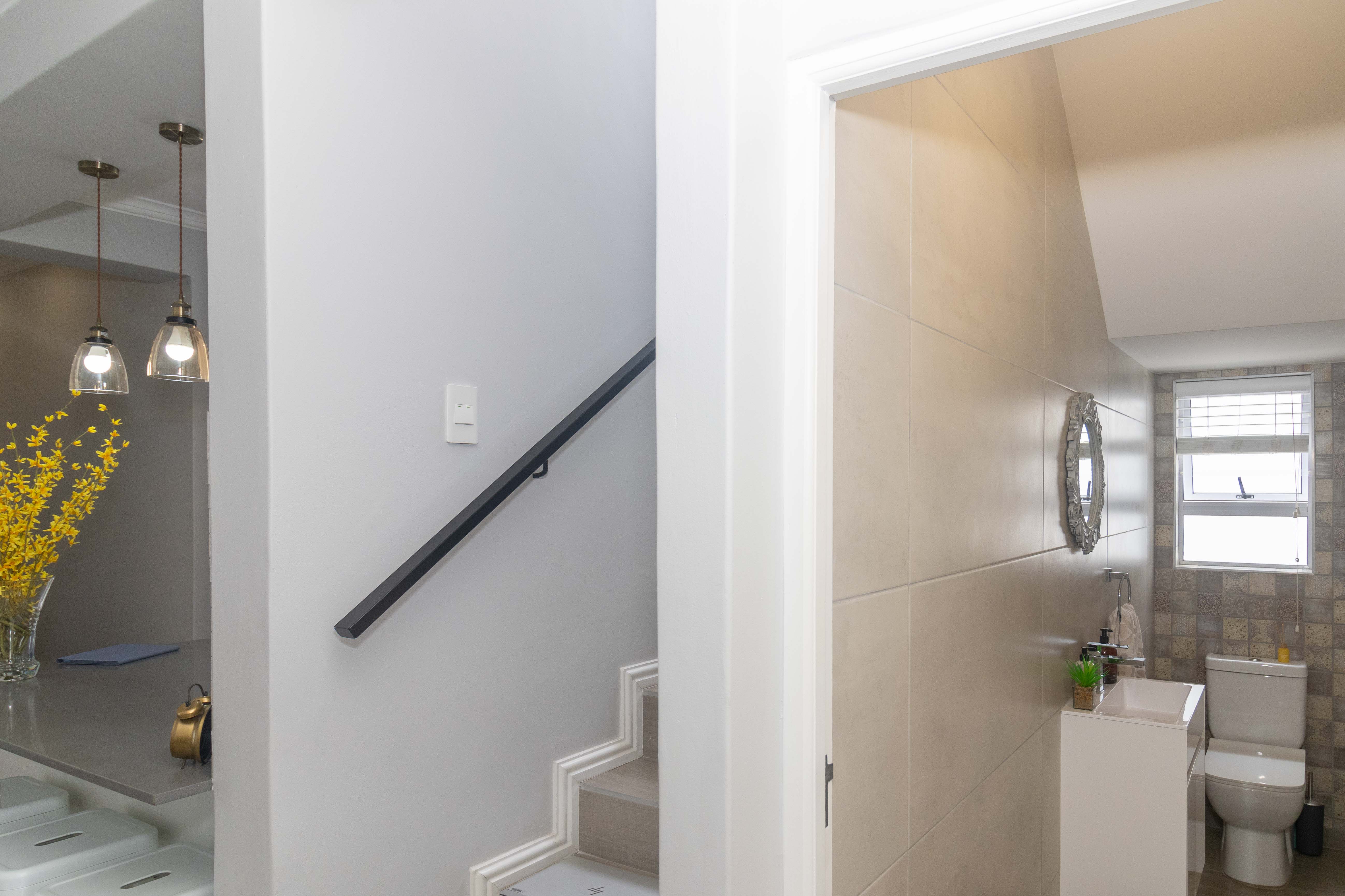 The downstairs of this duplex home offers two spacious, well-kept bedrooms, a modern, full bathroom with both bath and shower, and a stylish guest toilet. The open-plan living area flows beautifully from the modern kitchen and scullery into a bright dining area and comfortable lounge furnished with a comfy couch setup, which is perfect for relaxing or entertaining.