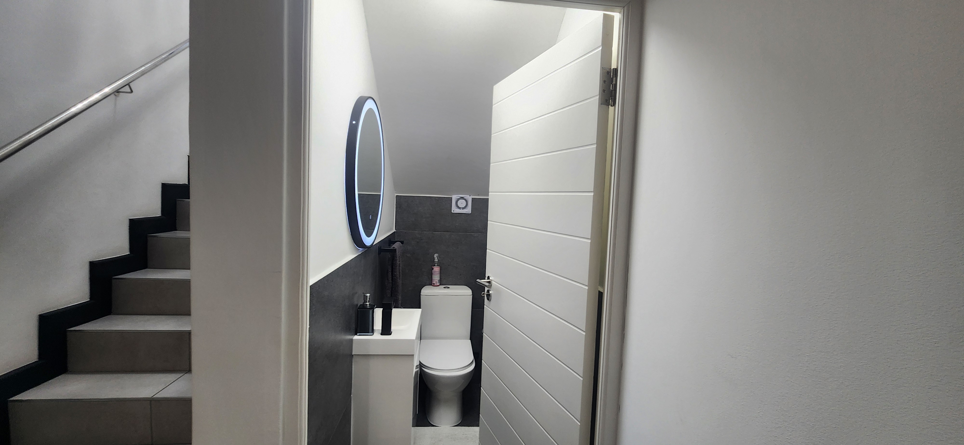 Two additional well-sized bedrooms are serviced by a modern full bathroom, while a convenient guest bathroom is located downstairs.