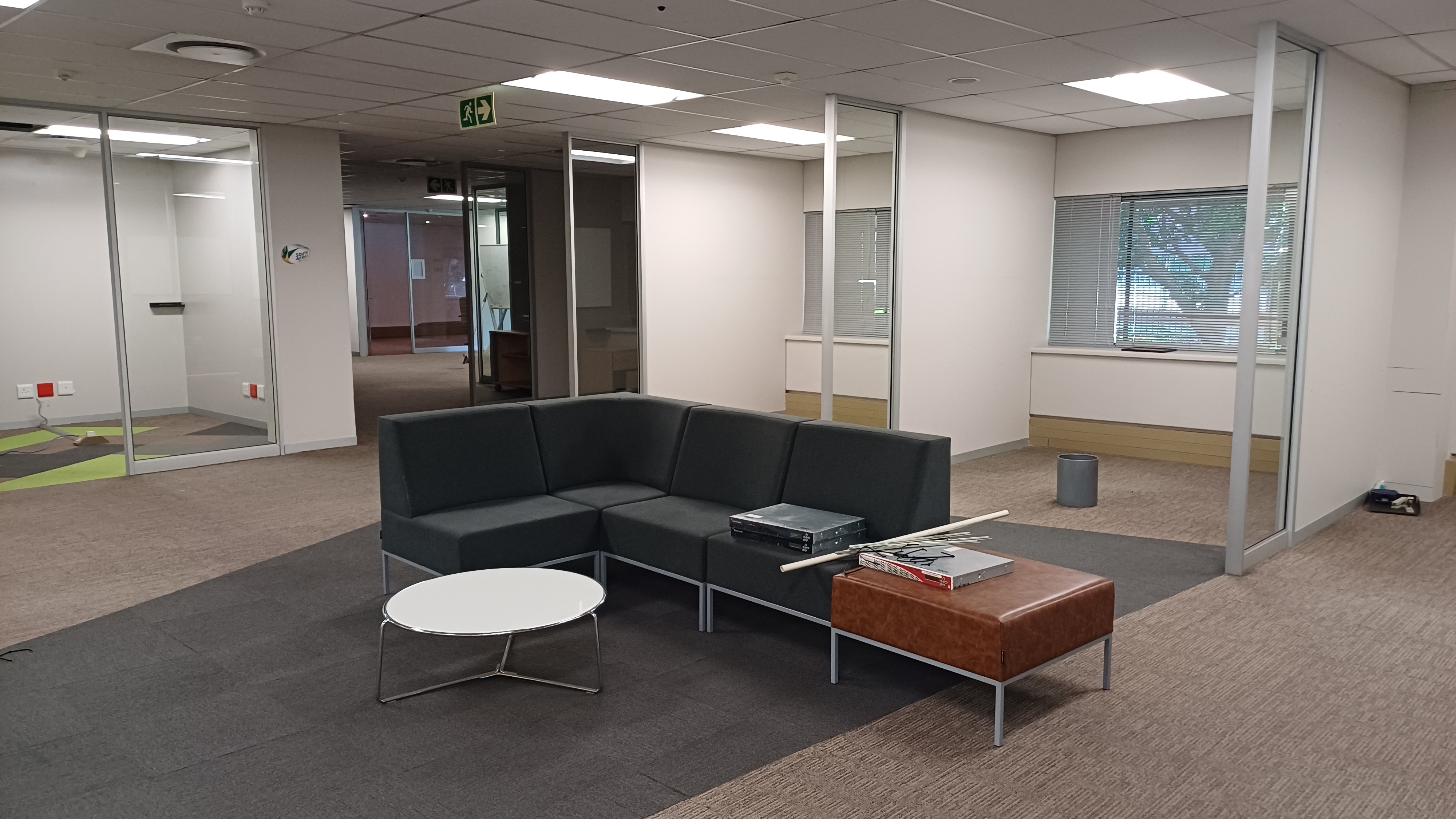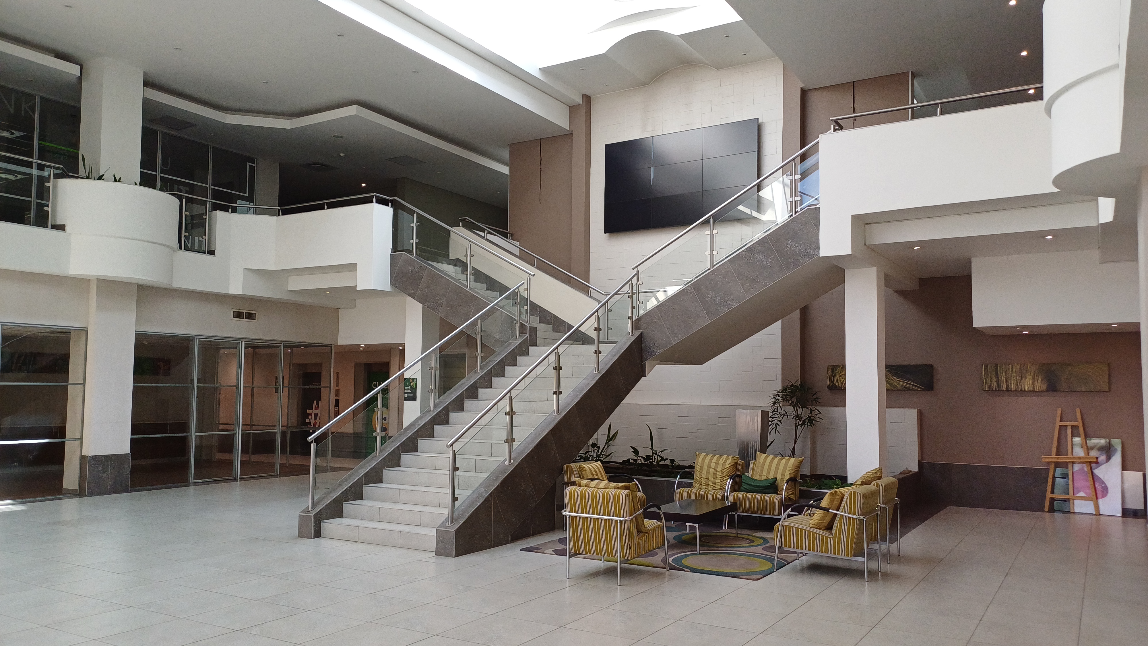 This 3-storey building should take care of most of a company’s requirements. It offers a large reception area, individual offices of various sizes, open plan areas, a new attractive canteen, large catering kitchen, spacious modern seating area with coffee station, meeting rooms, boardrooms, 100-seater auditorium, patios and outdoor areas, contract staff area with kitchen and ablution facilities, a squash court, plus there is an overhead pedestrian bridge from the building across Katherine Street. The owners would also consider renting the building.