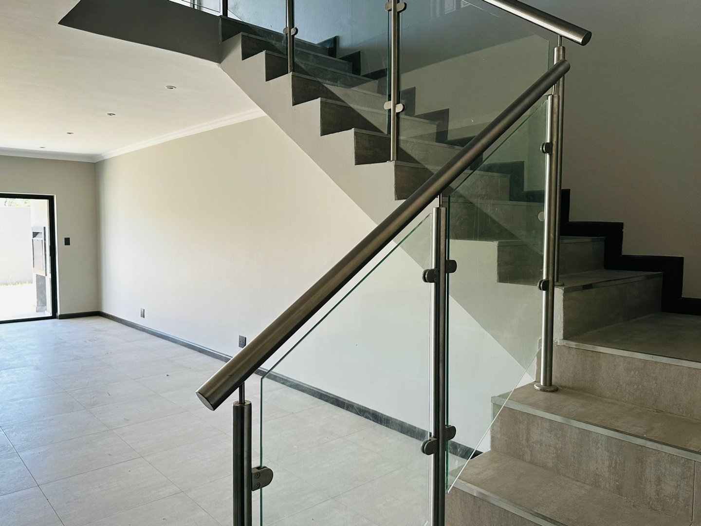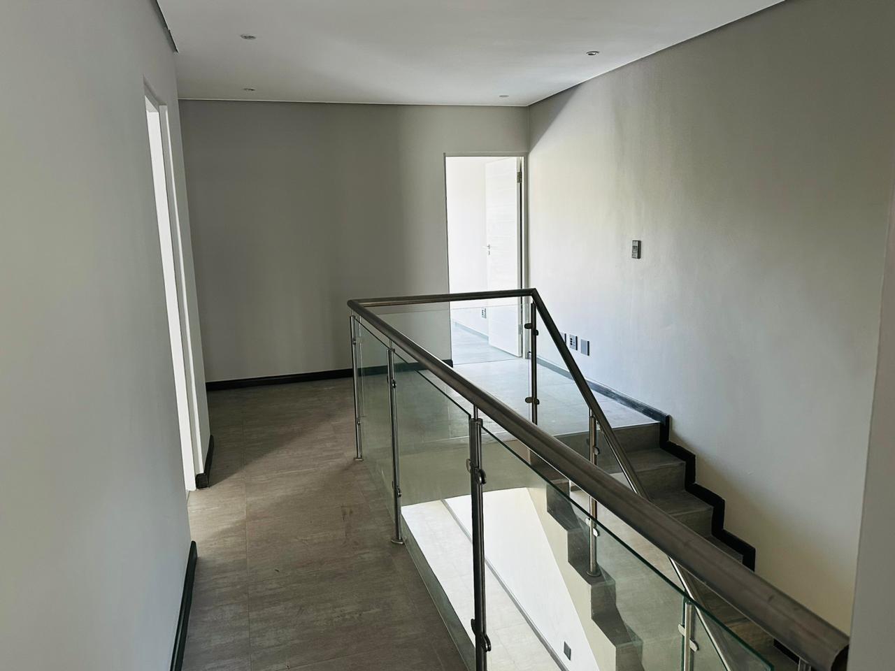 Ascend the lovely modern staircase, and you'll find one of the bedrooms on your right, also en-suite with a shower, basin, and toilet. The second bedroom offers a full en-suite bathroom. The main bedroom is a sanctuary, featuring a full en-suite bathroom and a walk-in closet with ample cupboard space. Two of the bedrooms opens onto its own balcony, providing breath-taking views.