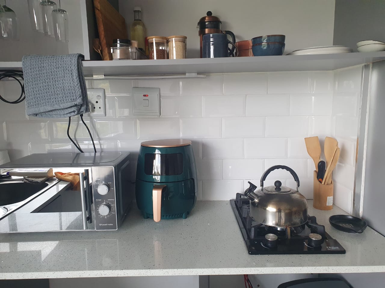 This neat apartment consists of a spacious open-plan living area with large windows that provide stunning views.