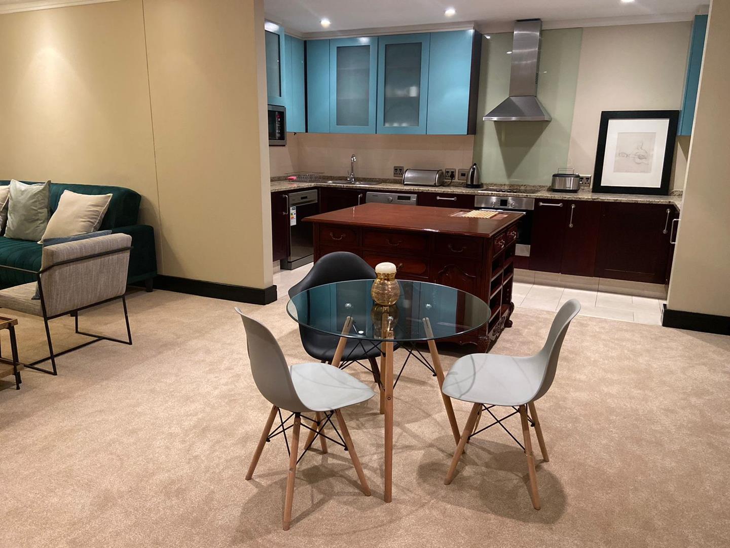 Spacious open plan Lounge and Dining Room tastefully furnished . Lounge which opens onto Balcony with Stunning Views of the Sandton Skyline.