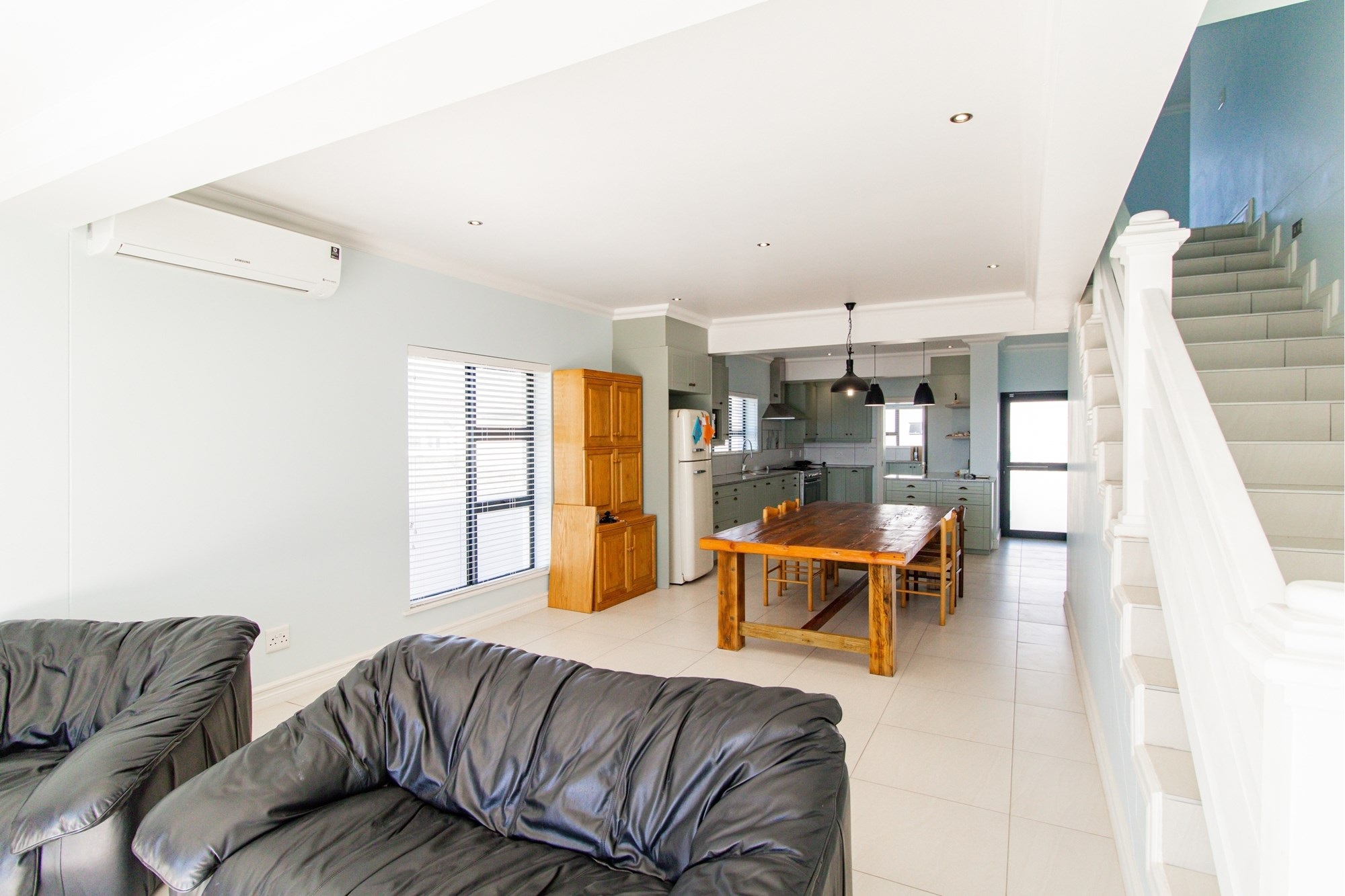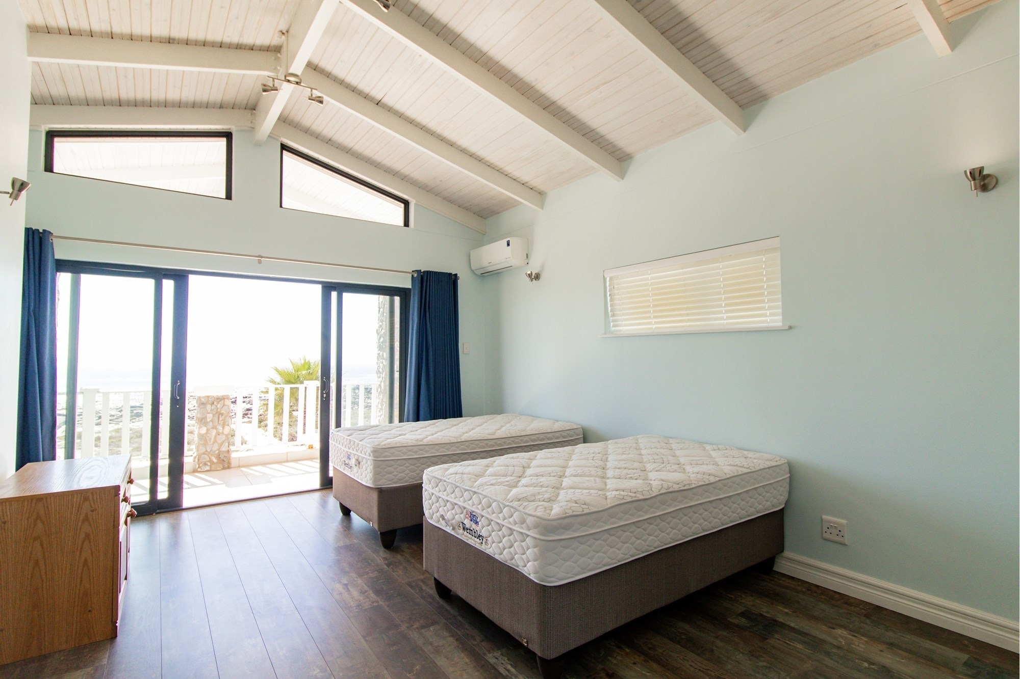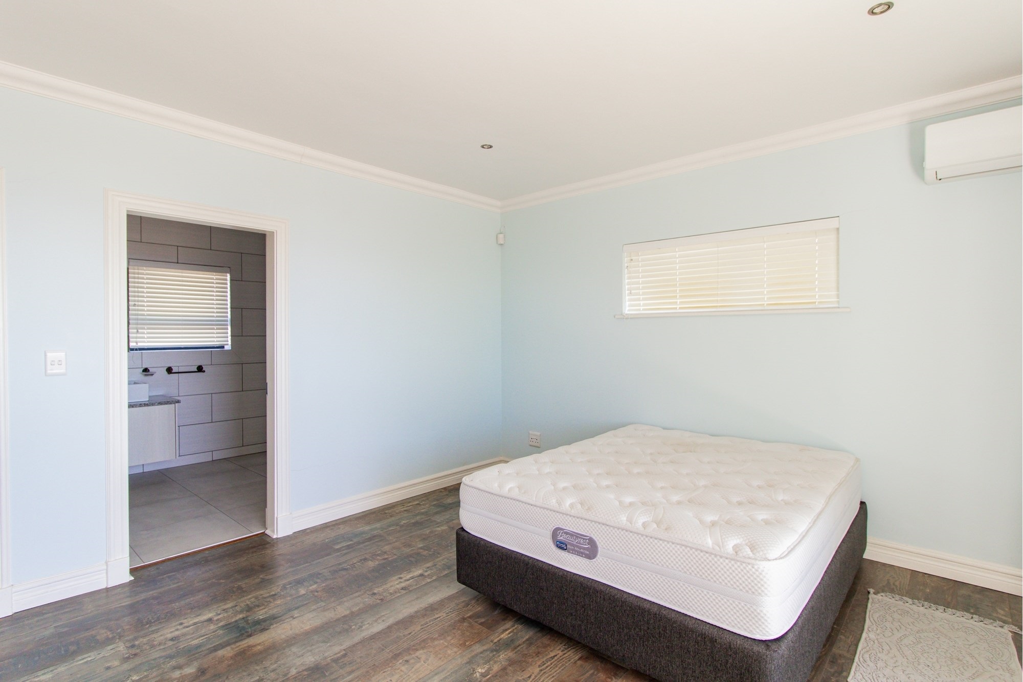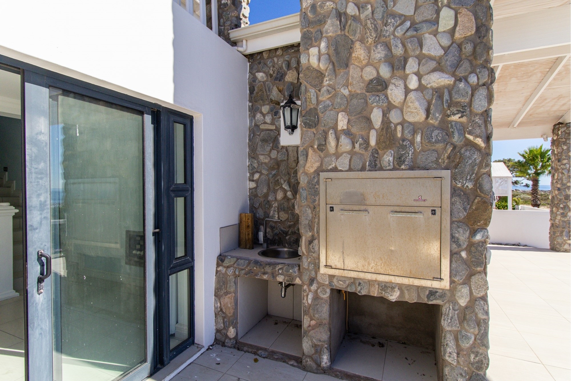 The living area includes built-in air-conditioning and a gas fireplace, creating comfort through all seasons. Sliding doors open onto a wooden deck with a built-in gas braai, perfect for entertaining while soaking up breath-taking sunsets over the Atlantic.